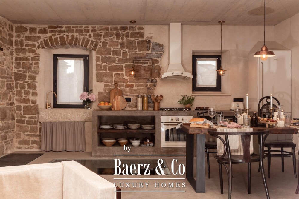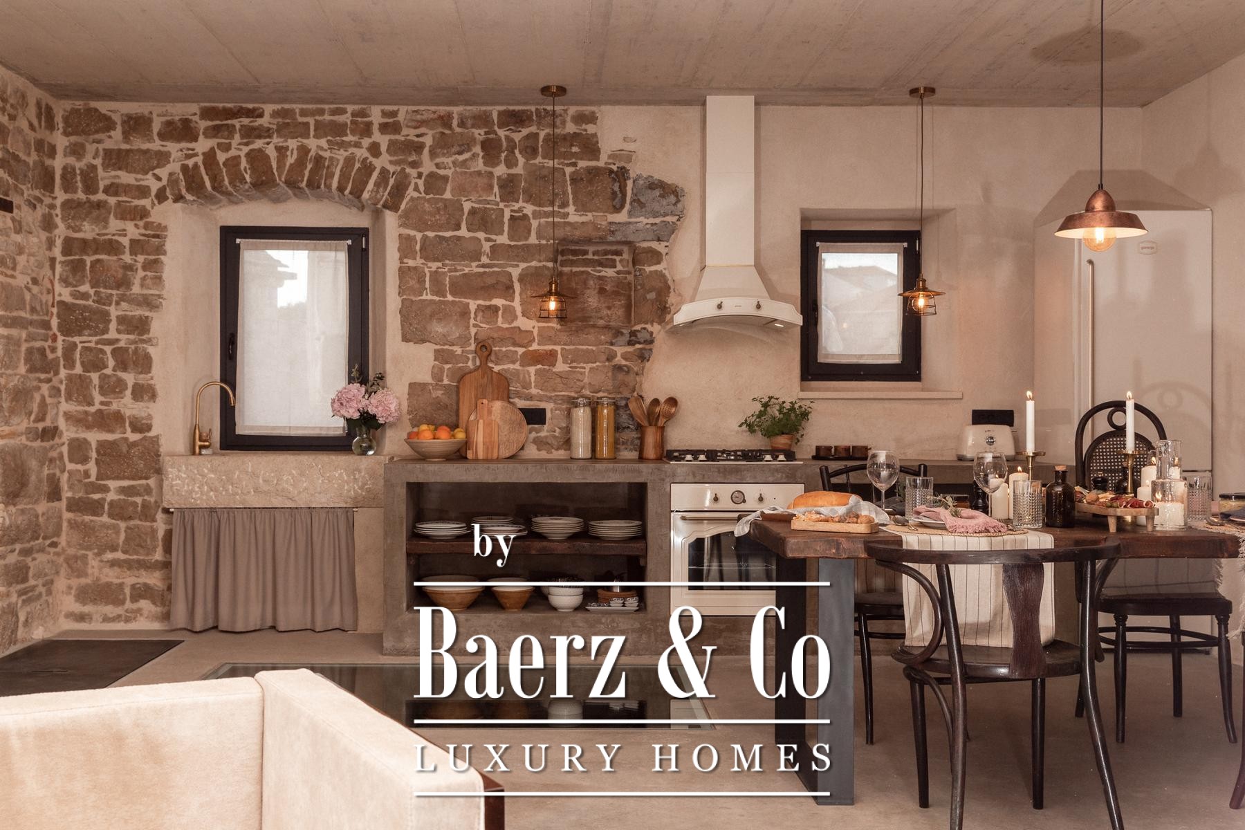 Stone house Brač Pučišća reimagines a historic Dalmatian residence into a refined enclave of modern comfort and discreet luxury. This meticulously renovated property spans 122 m² over three floors, set on a plot of 581 m². The ground floor, once home to olive oil and wine cellars and later a blacksmith shop, now opens into a contemporary kitchen, living room, storage, guest toilet, and a coffee and wine bar, merging the essence of local history with sleek functionality.