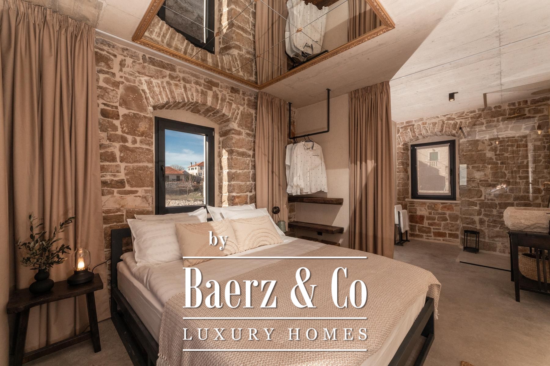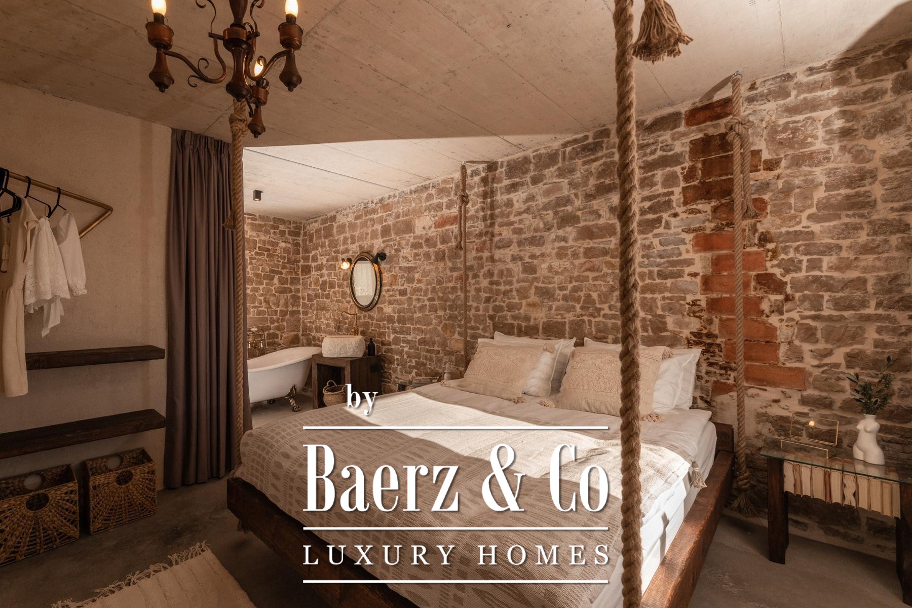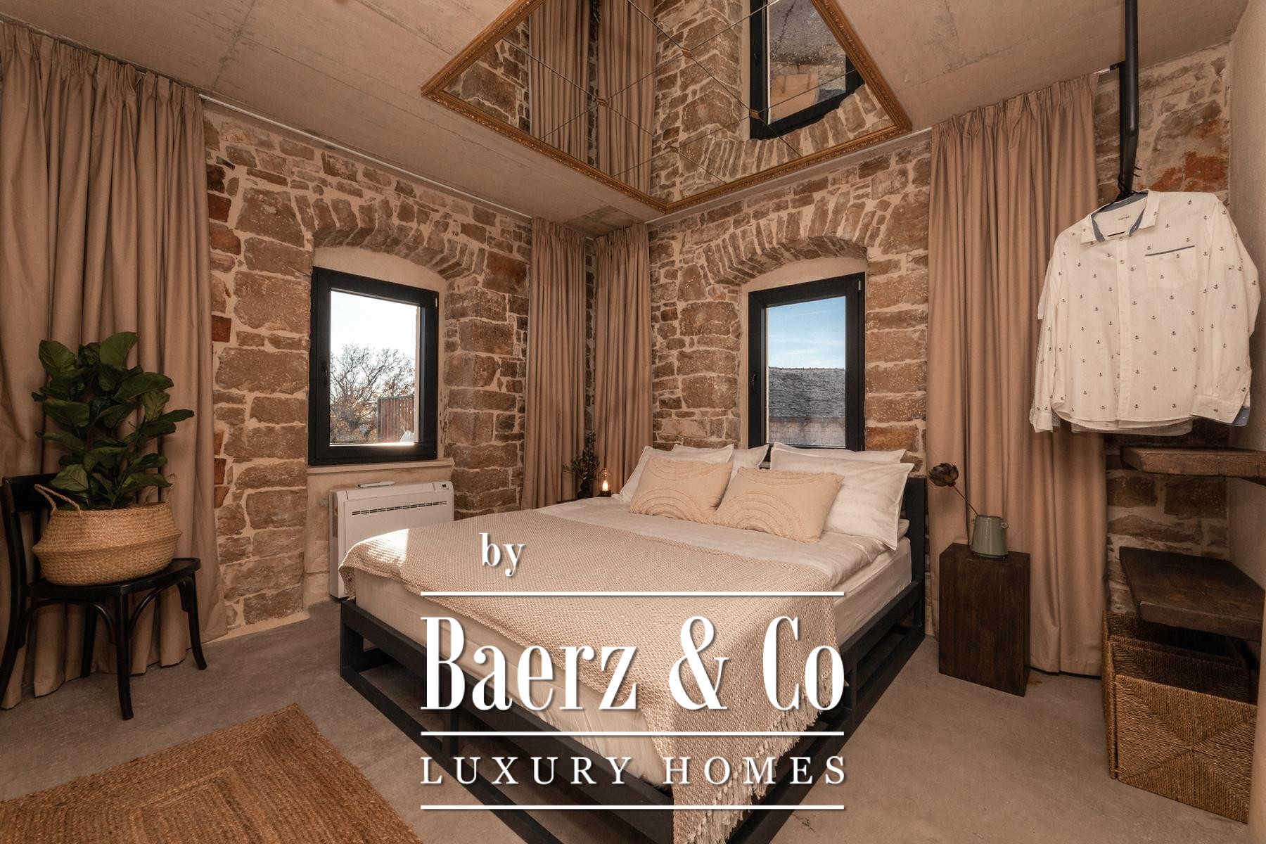 In the attic, a dedicated private spa awaits, complete with sauna, jacuzzi, and massage space, delivering an atmosphere of personal wellness. This stone house in Pučišća stands as an authentic sanctuary along the shores of Brač, harmonizing heritage, contemporary living, and understated indulgence.