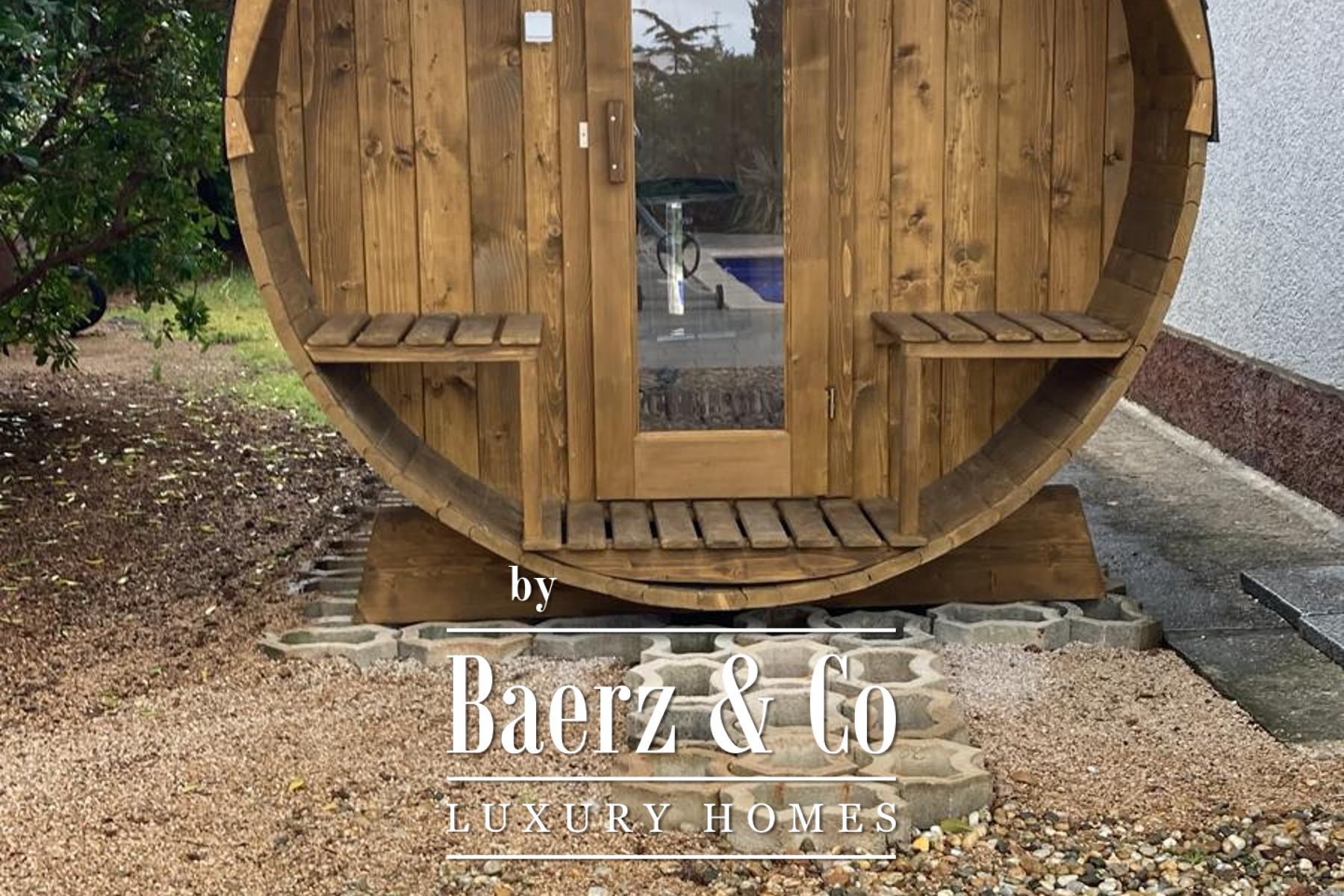Solar panels discreetly underscore the residence’s commitment to energy efficiency, while its 827 m² landscaped plot is anchored by a private swimming pool complemented by a sunbathing area and a sauna for a subdued sense of retreat. The garage and garden extend both practicality and leisure, gathering friends and family in privacy among carefully maintained grounds.
