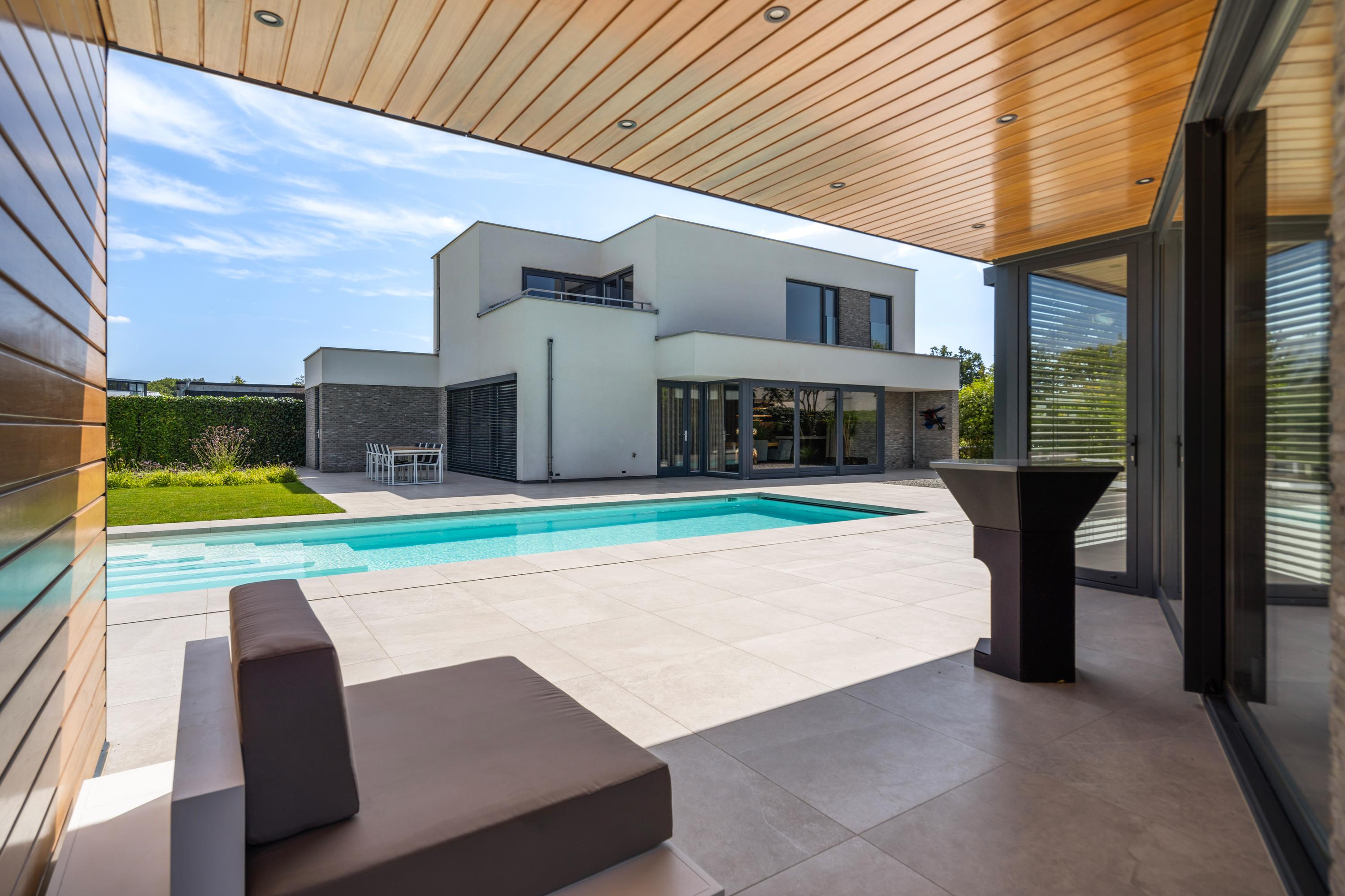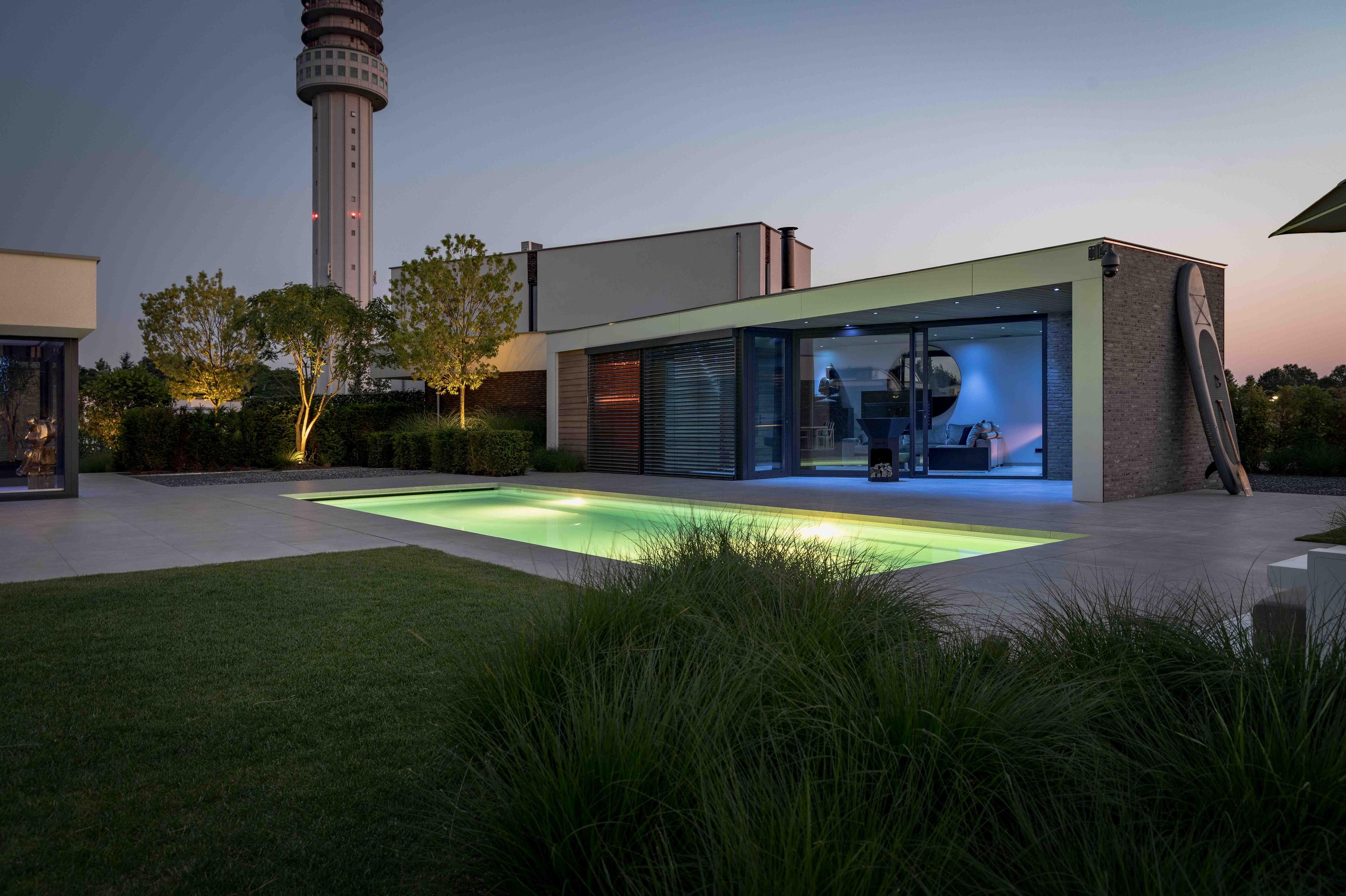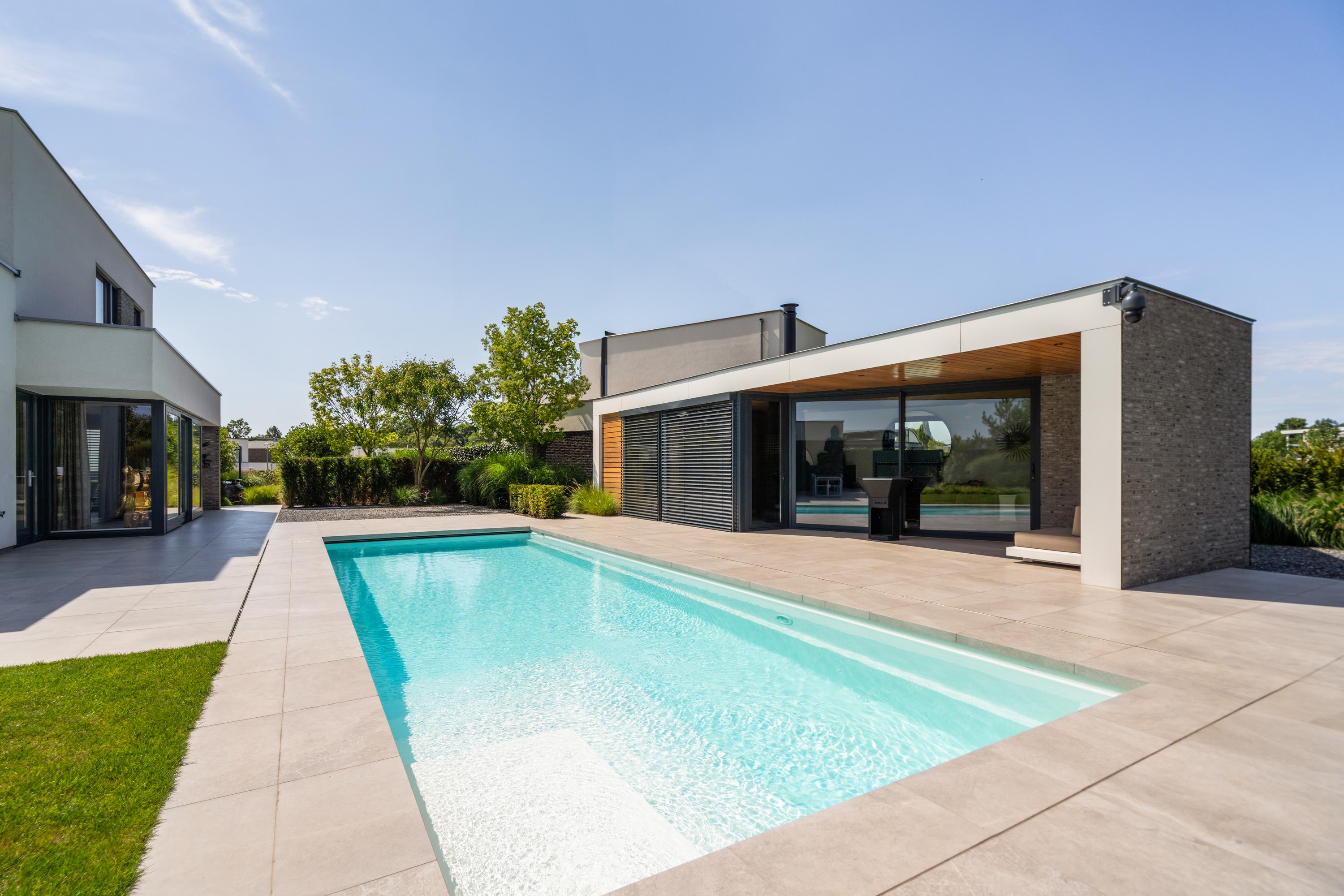 At the front, the villa is embraced by a generous garden that immediately sets the tone for the exclusive character of the property. The carefully designed combination of modern paving and green borders creates a harmonious and refined whole. The private driveway, finished with high?quality tiles and subtle greenery, leads you stylishly to the entrance.