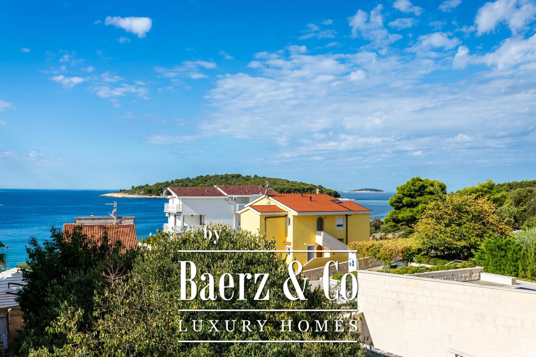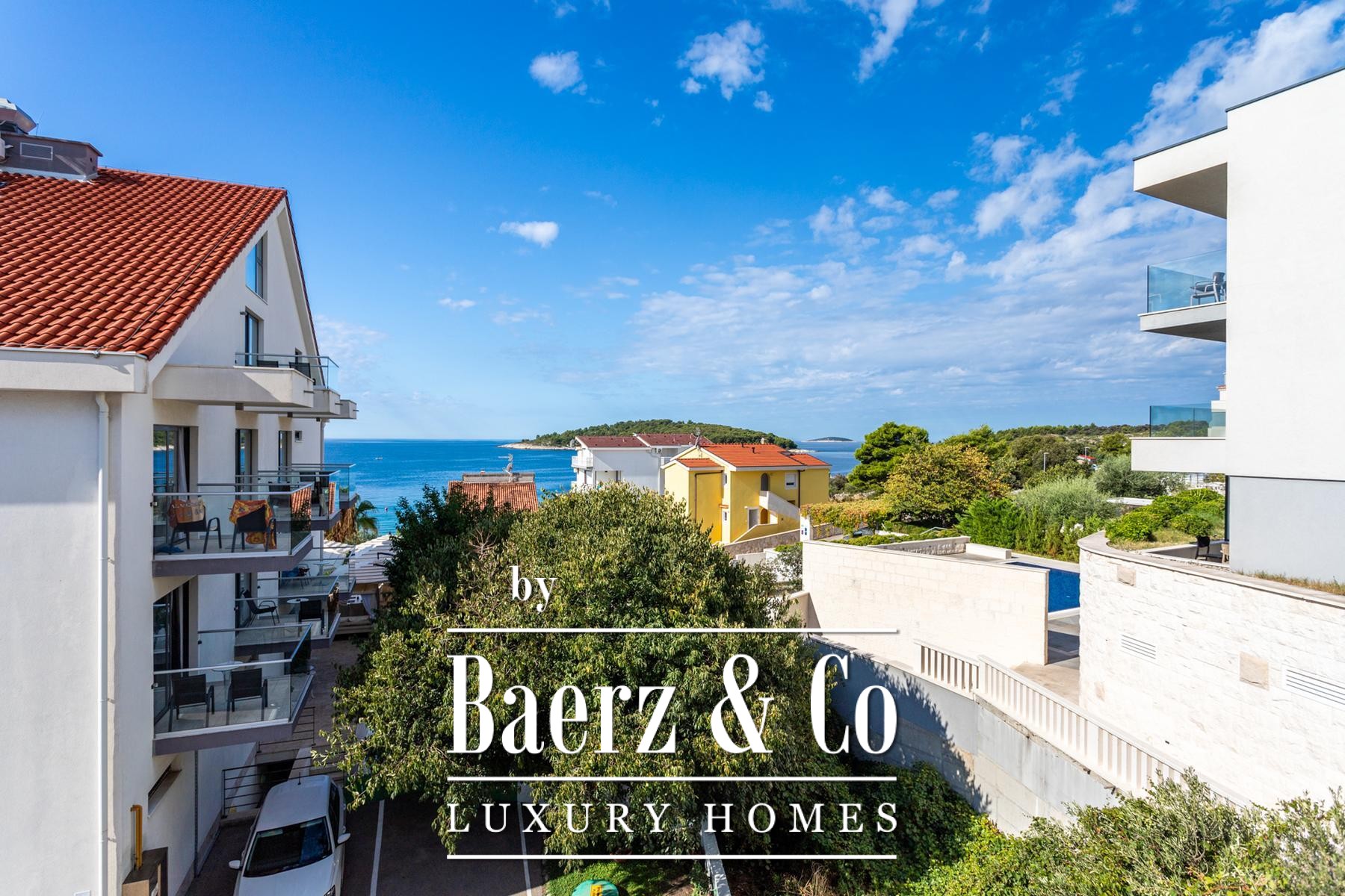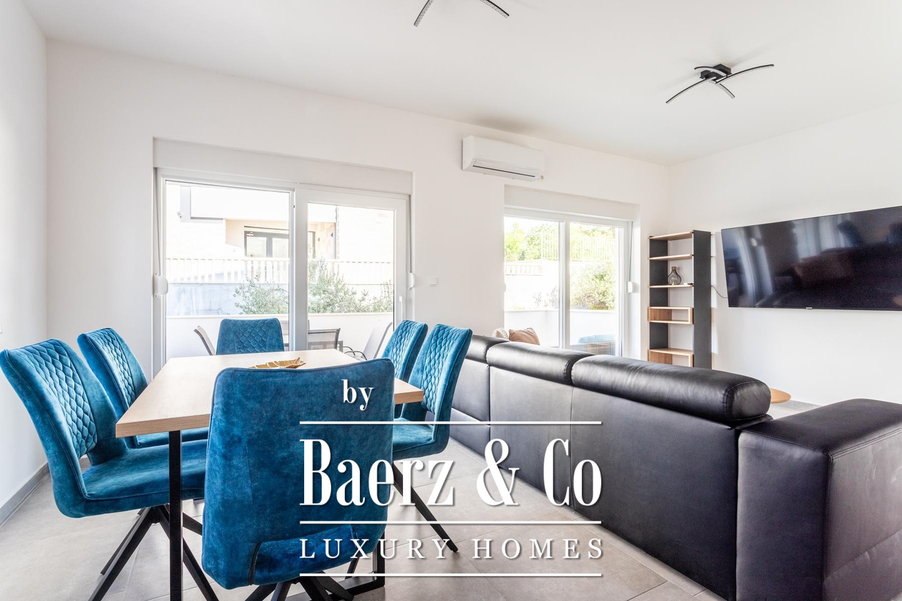 House Rogoznica stands just 90 meters from the Adriatic shore, offering 366.81 m² of considered design across four furnished apartments. This property invites both privacy and versatility, featuring eight bedrooms and eight bathrooms, all arranged to accommodate refined daily living or discreet vacation stays. \n\nThe spatial rhythm flows from a basement with a tailored apartment and four storage rooms, ascending by internal stairs to luminous upper levels. Each apartment consists of a living space with kitchen and dining area, two bedrooms, and a bathroom. Expansive terraces open southward, unveiling sea views that speak to Mediterranean serenity. \n\nBuilt on a compact 207 m² plot in Zečevo, the house is finished to demanding standards and includes three private parking spaces. The setting is quiet, removed from haste, yet the coastline and beaches remain a brief walk away. For those seeking a coastal property with architectural clarity and utility, this house in Rogoznica offers a poised retreat on the Croatian coast.