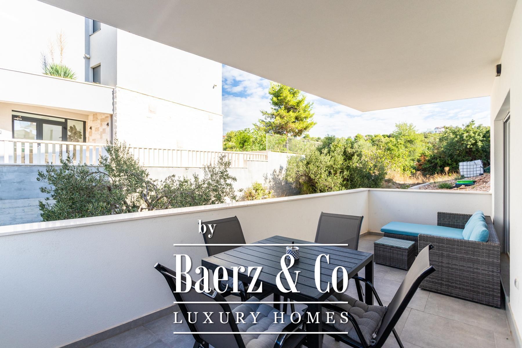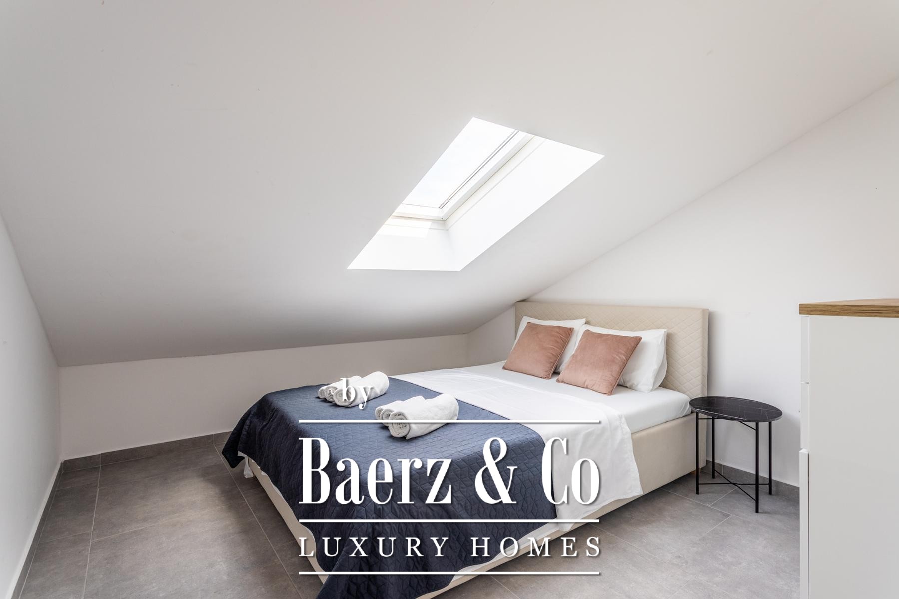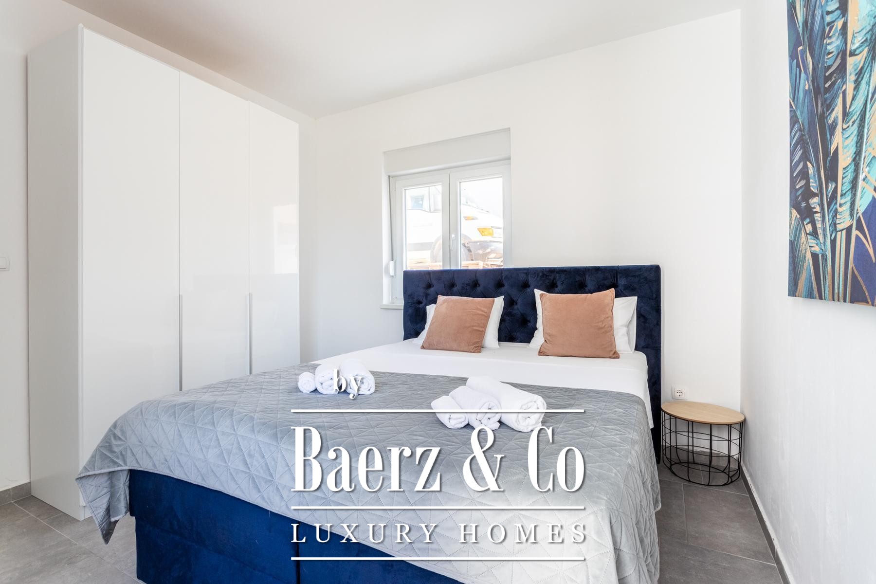 House Rogoznica stands just 90 meters from the Adriatic shore, offering 366.81 m² of considered design across four furnished apartments. This property invites both privacy and versatility, featuring eight bedrooms and eight bathrooms, all arranged to accommodate refined daily living or discreet vacation stays. \n\nThe spatial rhythm flows from a basement with a tailored apartment and four storage rooms, ascending by internal stairs to luminous upper levels. Each apartment consists of a living space with kitchen and dining area, two bedrooms, and a bathroom. Expansive terraces open southward, unveiling sea views that speak to Mediterranean serenity. \n\nBuilt on a compact 207 m² plot in Zečevo, the house is finished to demanding standards and includes three private parking spaces. The setting is quiet, removed from haste, yet the coastline and beaches remain a brief walk away. For those seeking a coastal property with architectural clarity and utility, this house in Rogoznica offers a poised retreat on the Croatian coast.