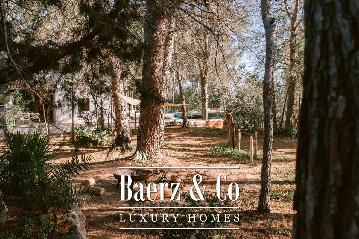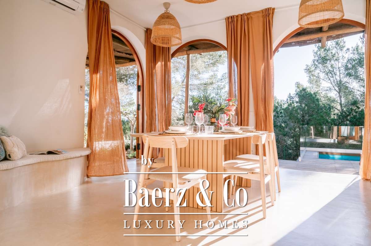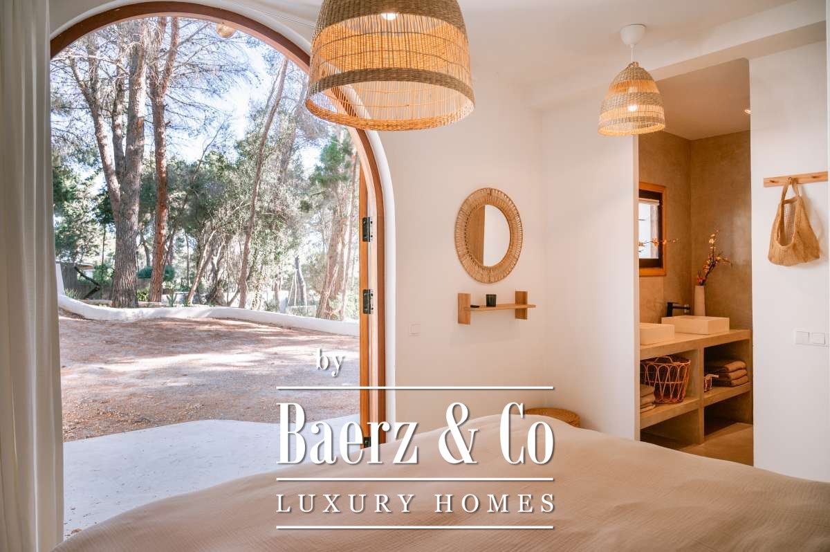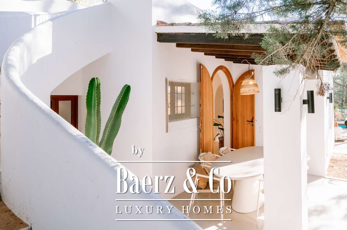 Villa San Agustín Spain connects privacy with effortless outdoor living amid a tranquil forested landscape. This fully renovated villa, with a built area of 175 m² on a private plot of 1,783 m², embraces the enduring spirit of Ibiza while remaining close to local restaurants and some of the west coast’s revered beaches. The setting blends seclusion and centrality, surrounded by the verdant beauty of San Agustín.