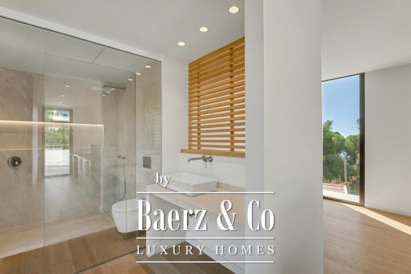 Throughout, integrated heating, smart lighting, and sliding teak shutters underscore the villa’s commitment to comfort and refined living. The property includes a two-car garage, technical room, and storage on the lower level. The rooftop terrace crowns the home, offering a vantage point for sunsets, the Mediterranean horizon, and the calming presence of the sea breeze — an ideal retreat for those seeking a luxury villa for sale in Sant Elm.