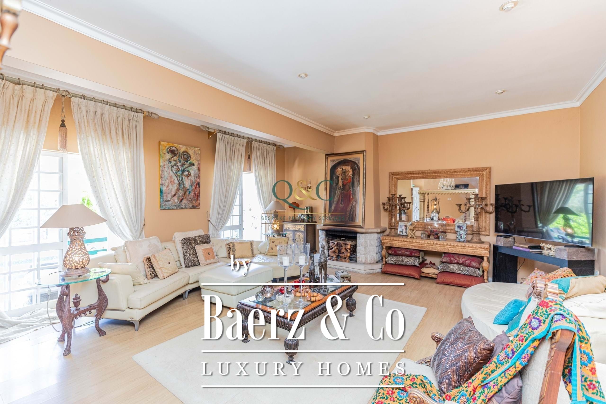 Set behind electric gates, the fully enclosed gardens provide a variety of inviting spaces for both relaxation and entertaining. From the driveway with ample parking, steps lead up to a covered main terrace and double doors opening into a grand entrance hall. This flows into a bright sitting room with fireplace and sliding doors back onto the terrace, as well as a semi-open dining room. A sweeping staircase adds a touch of grandeur, leading to the upper floor.