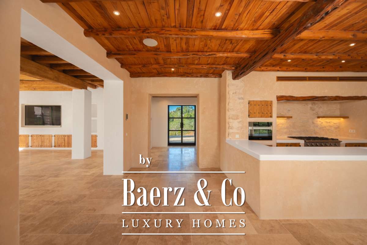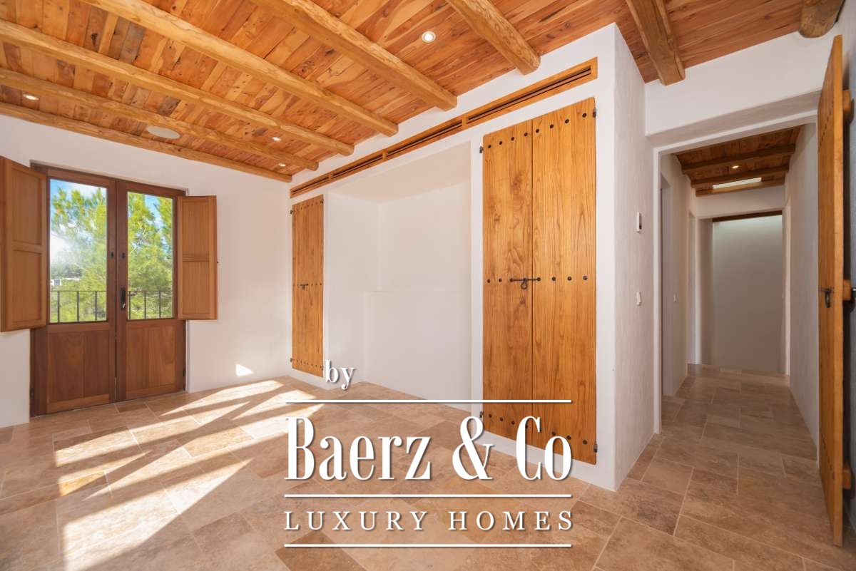 The recently renovated finca blends historic character with contemporary finesse. Every detail of the 620 m² residence, from exposed stone walls to soft, harmonious tones, underlines an enduring elegance. The living areas are open, inviting light and nature into each room, while the seamless integration of kitchen and lounges lends itself to both intimate gatherings and quiet reflection. Six bedrooms and five bathrooms provide refined comfort, with the master suite offering panoramic views and nightly glimpses of Dalt Vila’s illuminated skyline.