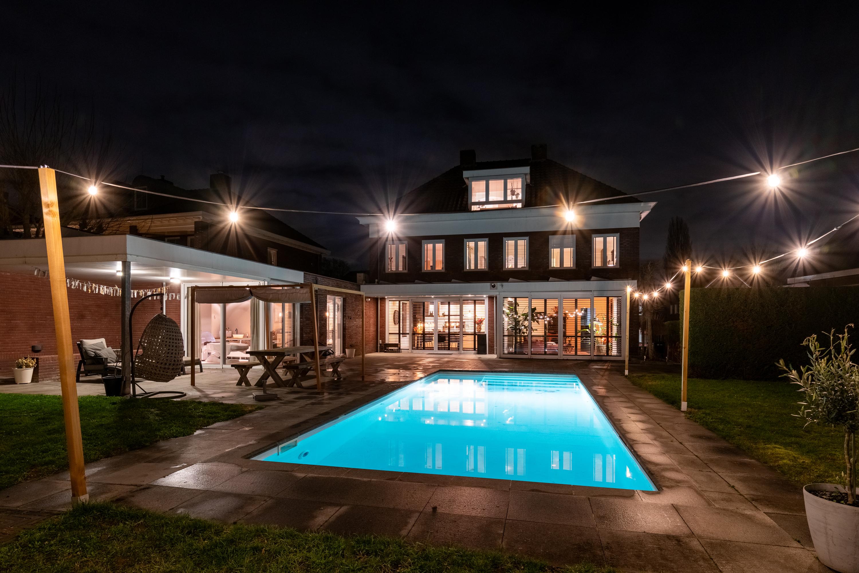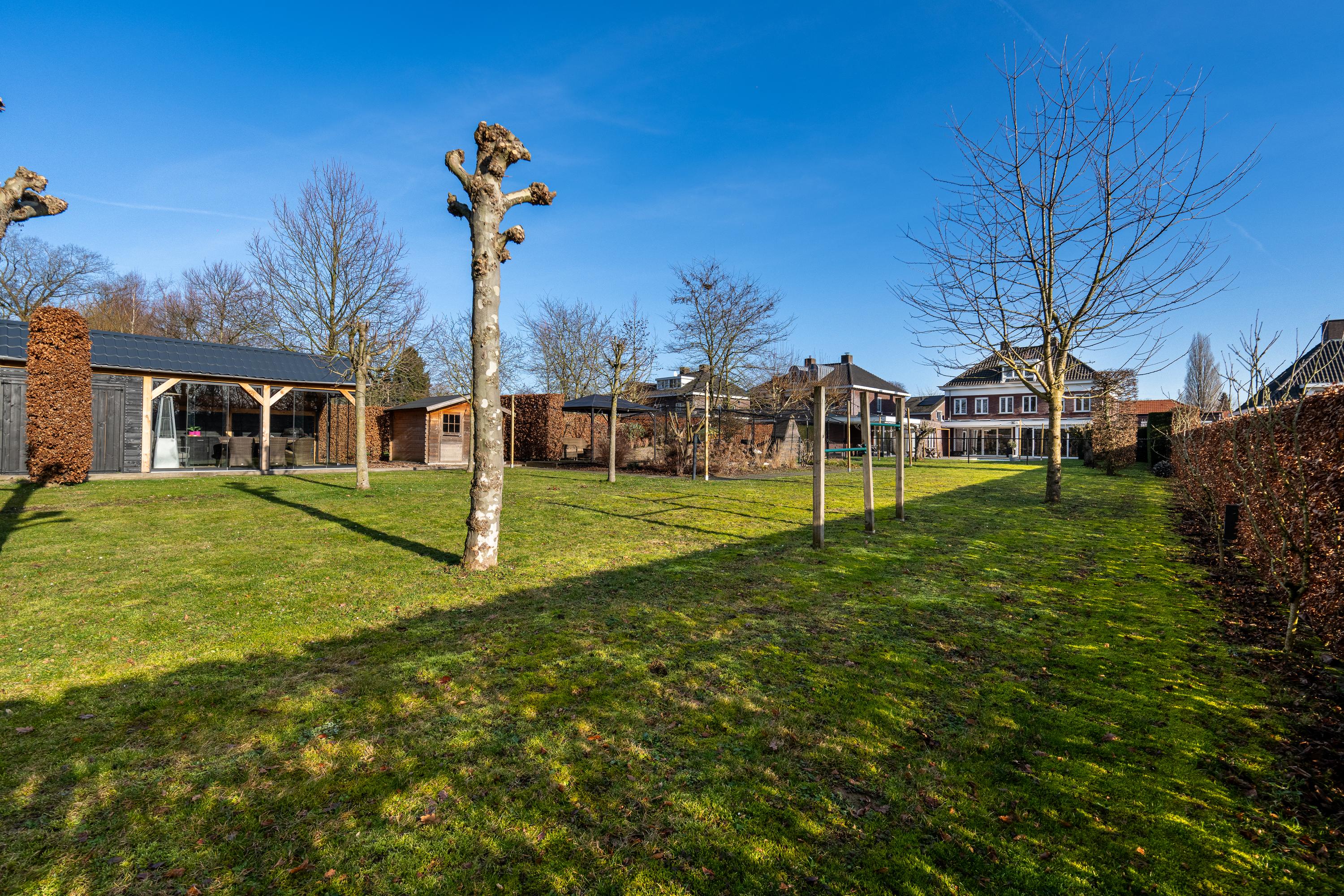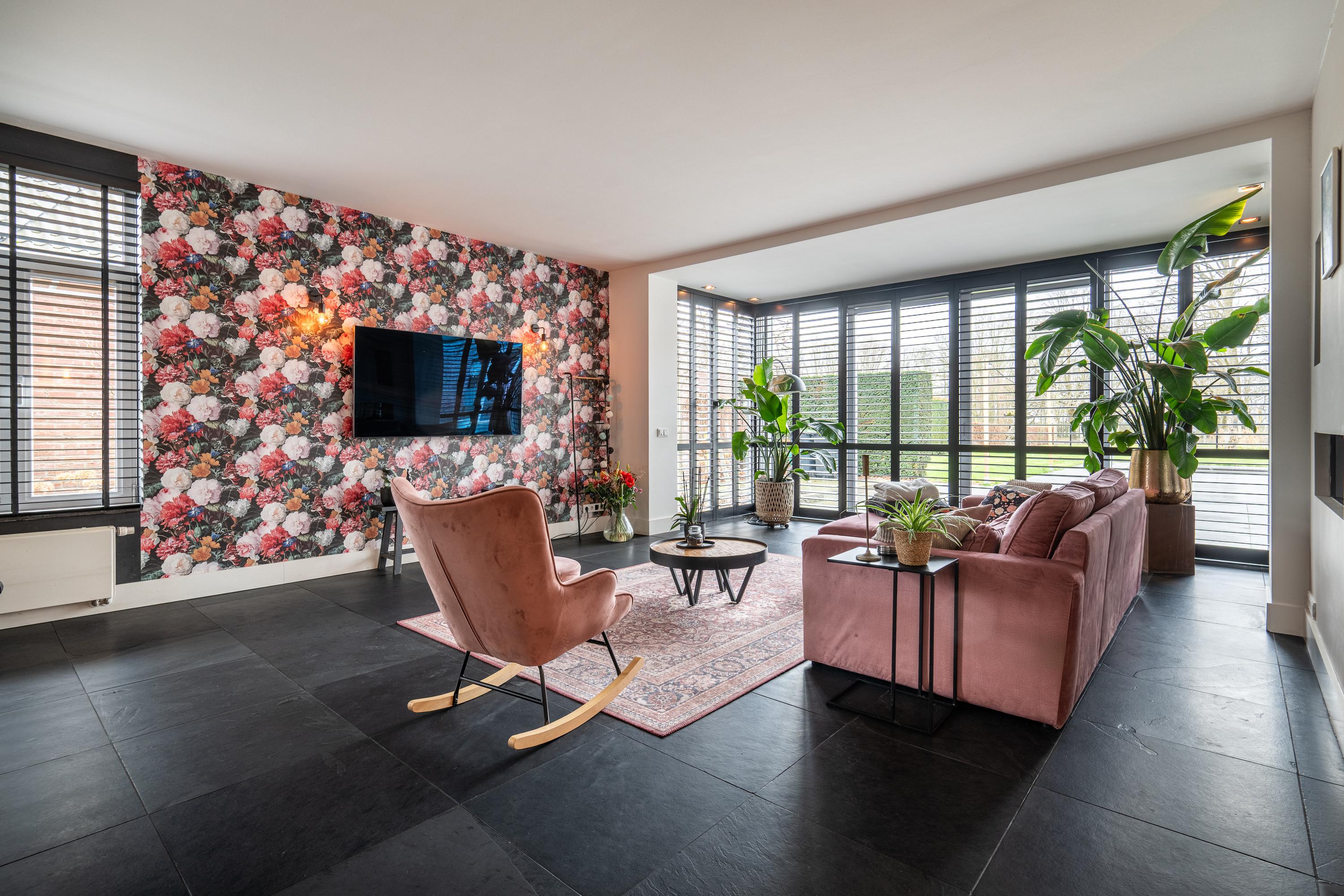 The house is centered on the plot, so the garden surrounds the house. This spacious backyard of approx. 1,575 m² has several (sun) terraces, a large lawn, and borders with green plants. Because of the forest plot behind it, this backyard gives a feeling of peace, space, and privacy. The backyard also features a heated swimming pool, a charming pond, and several (covered) seating areas. In this garden, you can enjoy optimal privacy and all the beauty that this wonderful environment and nature has to offer.