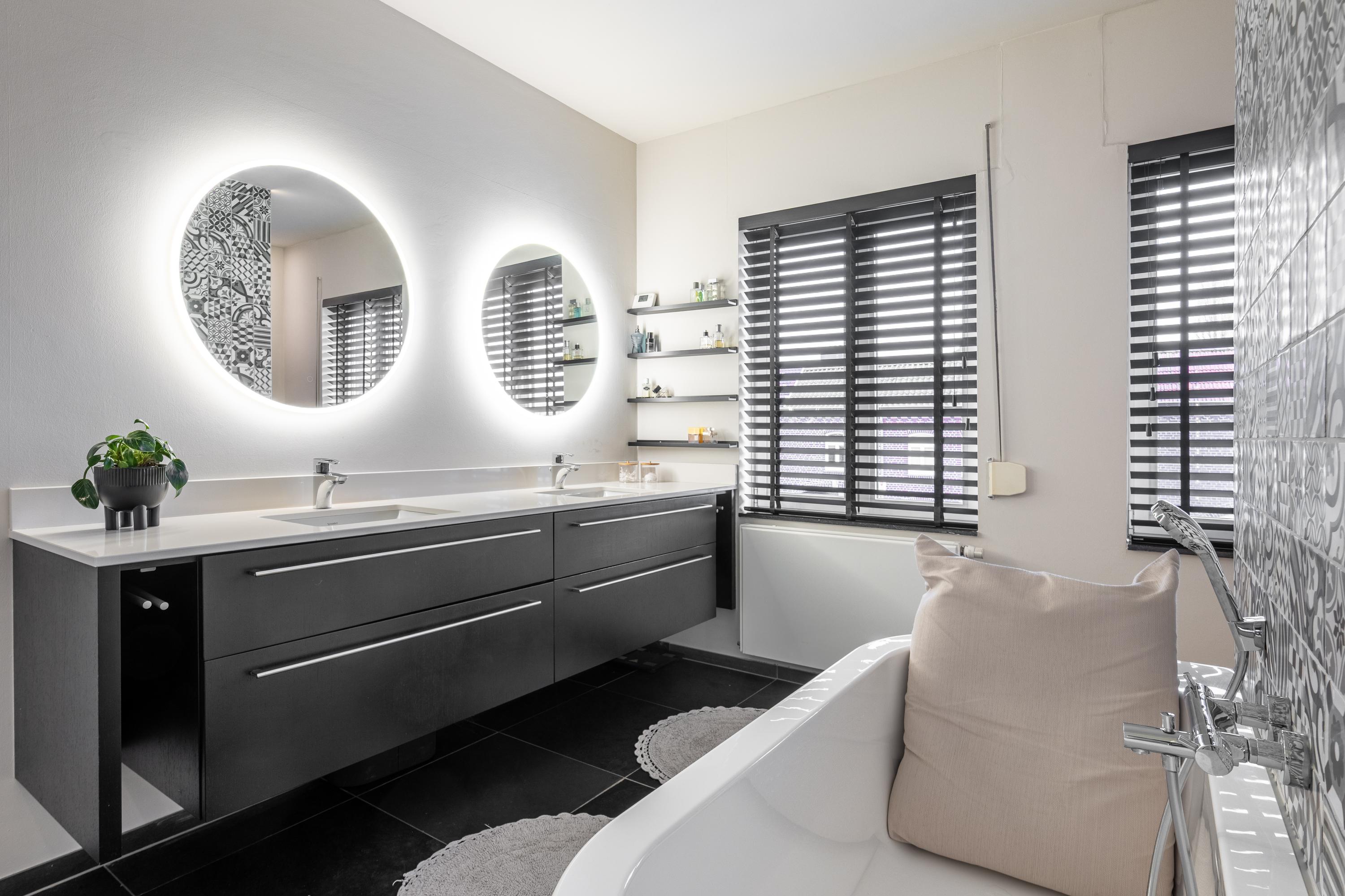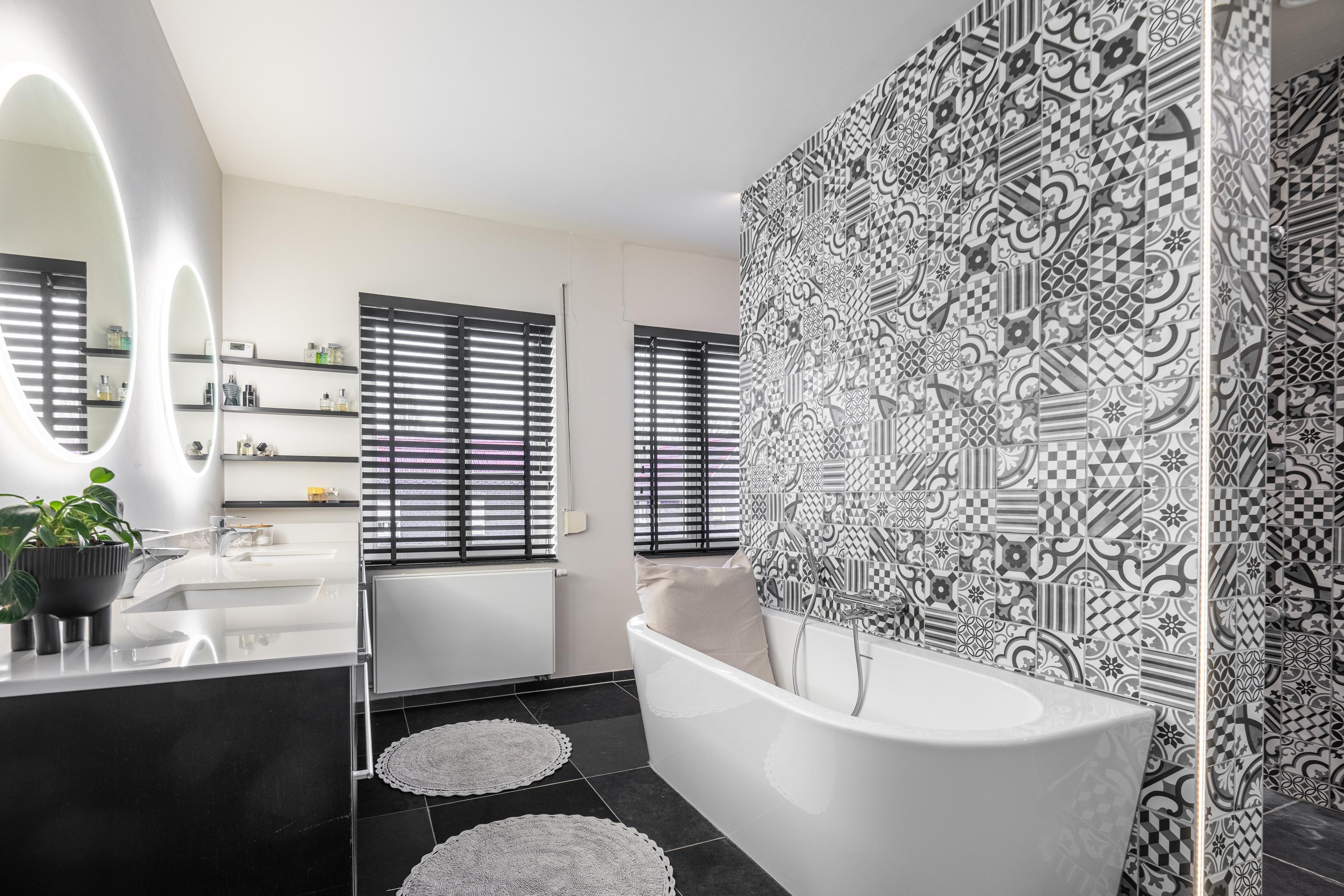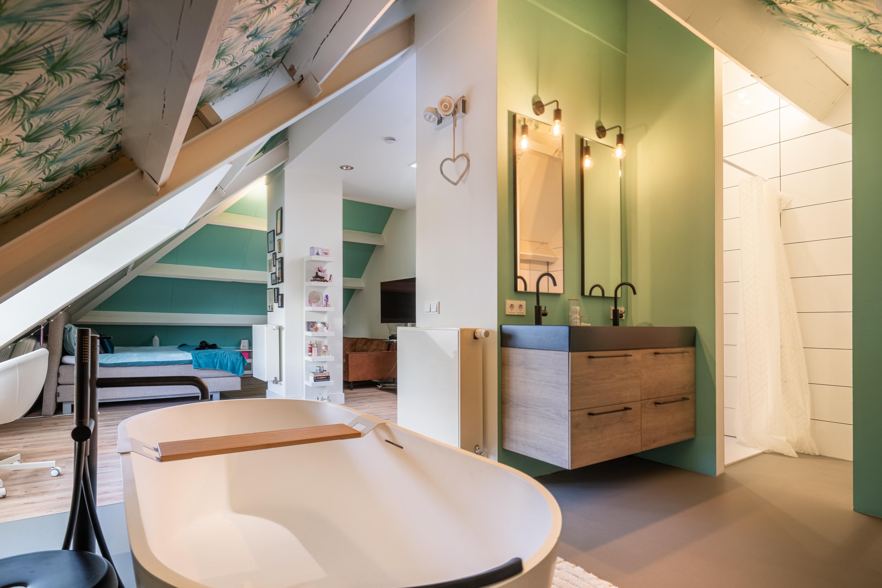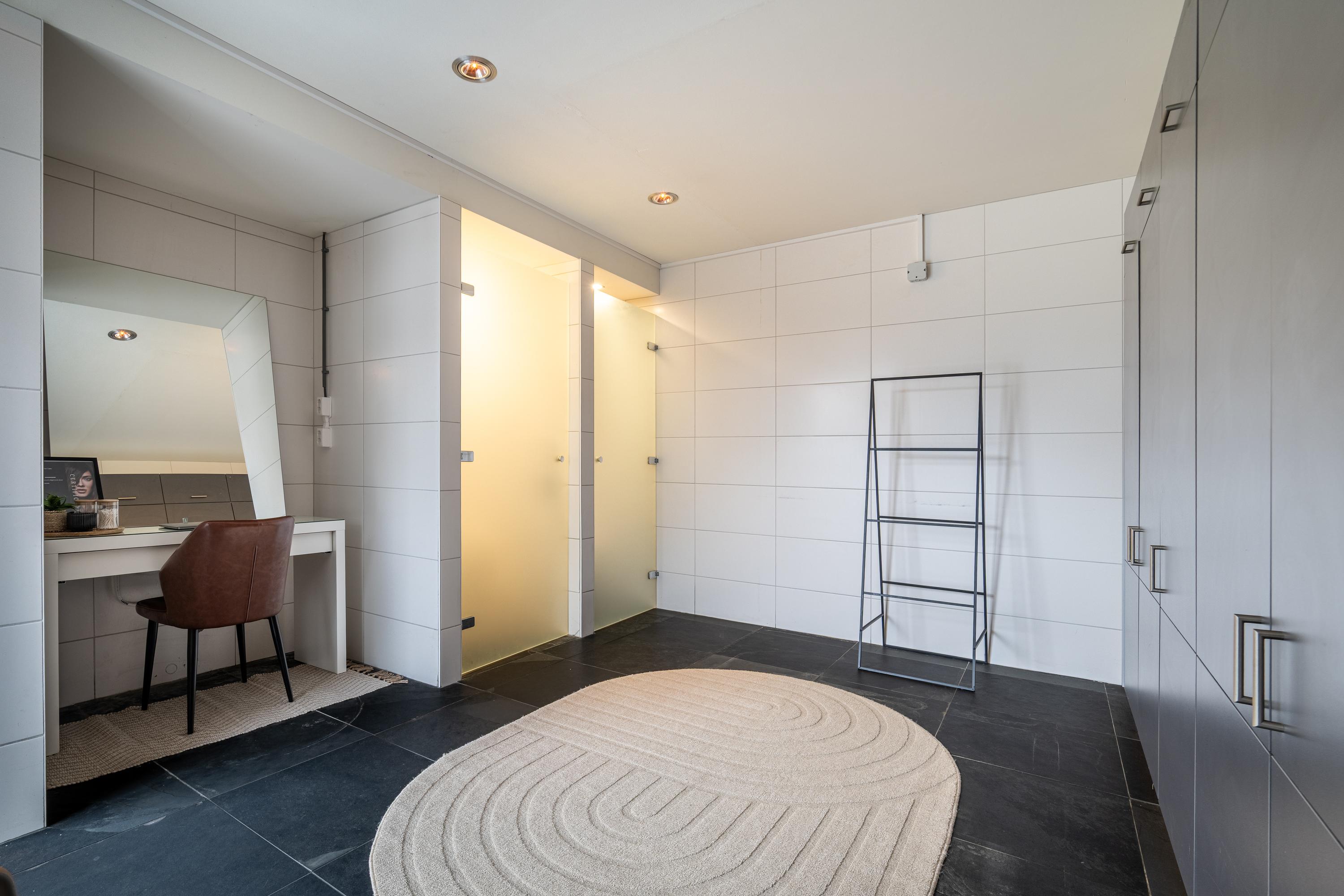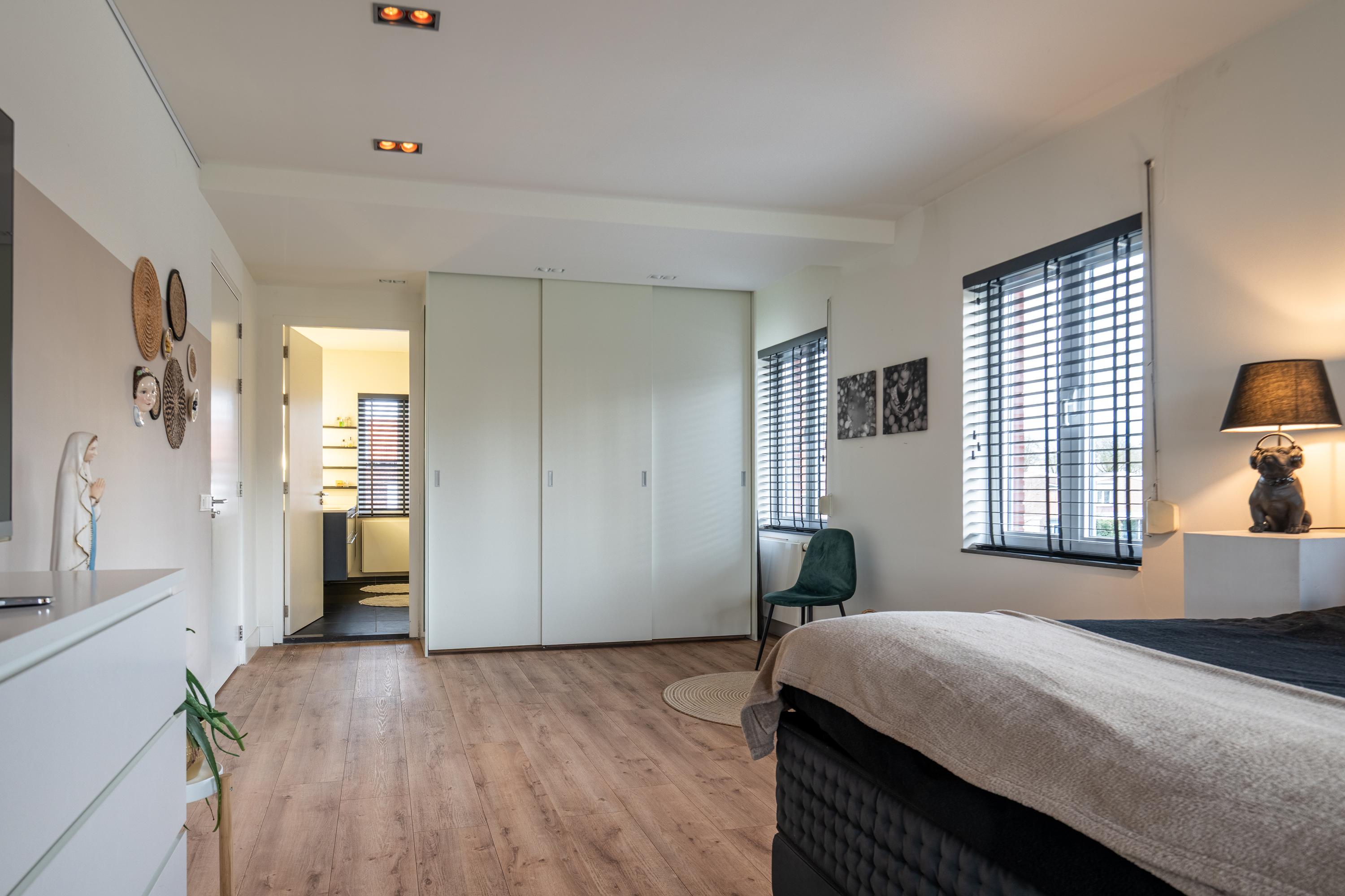 A fixed staircase leads to a landing with access to the walk-in closet, the boiler room, and the fourth bedroom with en-suite bathroom. The bedroom (approx. 29m²) has a practical dormer window and therefore offers a beautiful view of the garden. From the bedroom, there is open access to the third bathroom (13.5m²), which is equipped with a freestanding bathtub, double sink, walk-in shower, and toilet. The walk-in closet has custom-made cupboards on both sides.