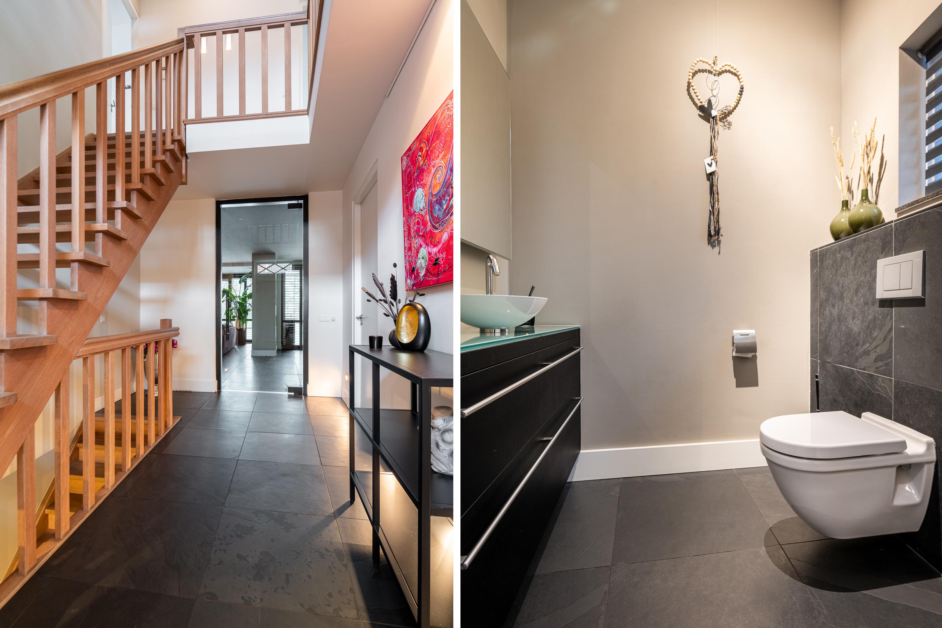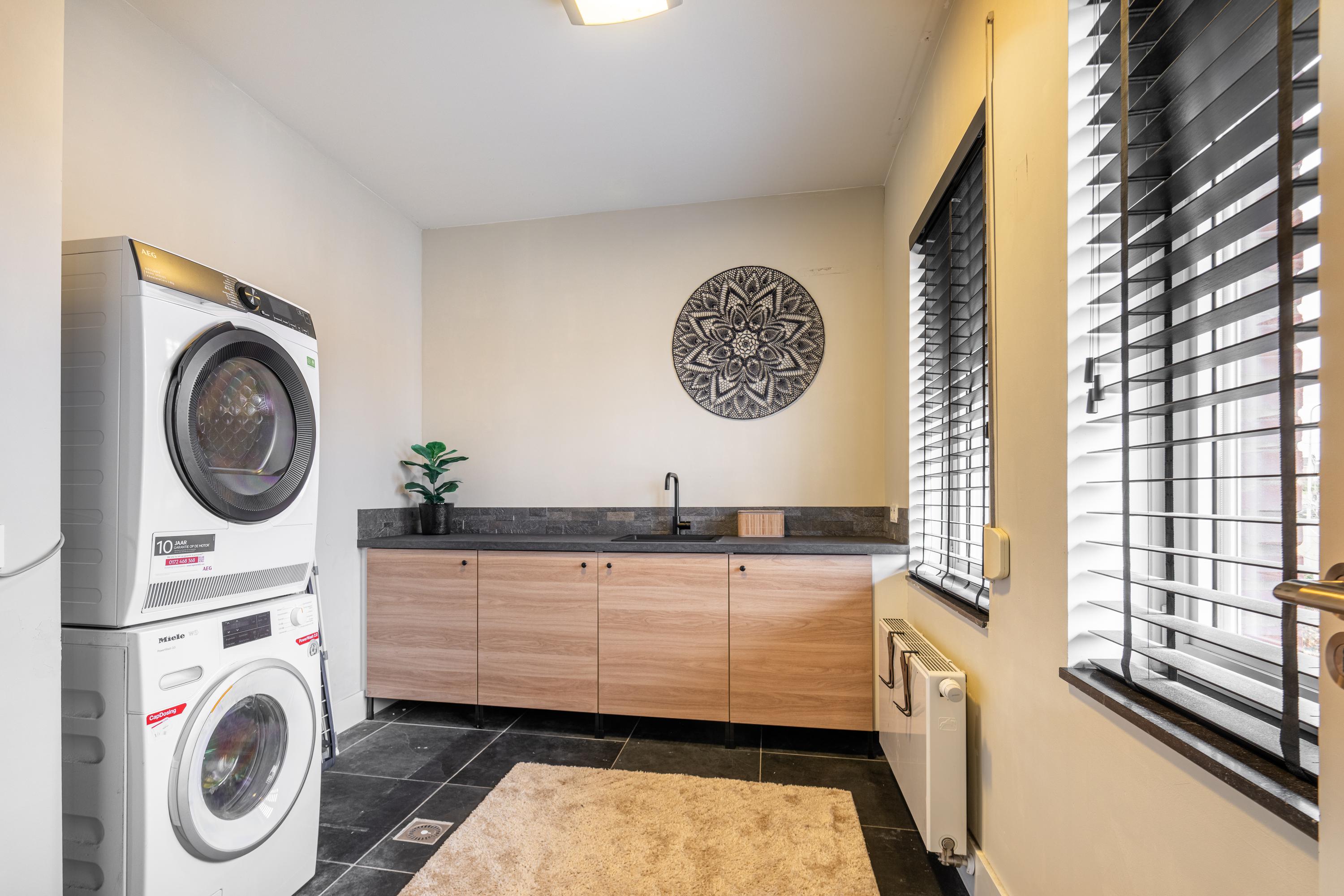 The impressive entrance/hallway offers plenty of space and access to the meter cupboard, toilet, cloakroom, utility room, and office space (approx. 21m²), which could potentially be added to the living room. A modern pivot door leads to the living area. The spacious living room with adjoining open kitchen (approx. 73m² in total) exudes atmosphere and luxury thanks to its cozy interior and optimal garden view. There is also a practical air conditioning system and an attractive decorative gas fireplace. The kitchen with spacious cupboards and island is equipped with various built-in appliances and provides access to the utility room (approx. 11m²) behind it, which has a complete second kitchen. Adjacent to the living area is a multifunctional room, currently used as a TV room/game room (approx. 15m²). From here, you can also access an extra room with a shower, toilet, and access to the garden and the room currently used as a practice room. For extra comfort, the ground floor has underfloor heating.