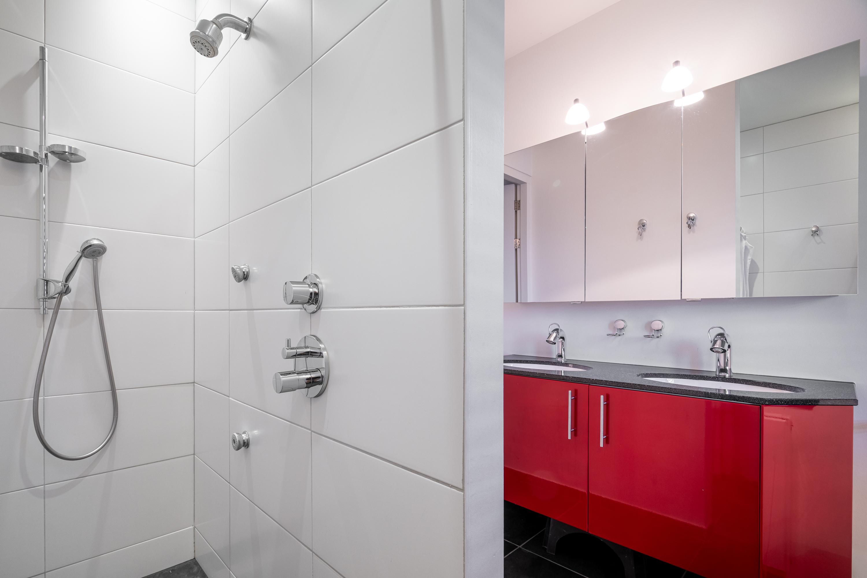 The stylish staircase leads to the spacious landing with an attractive loft and access to a laundry and ironing room, a bathroom, separate toilet, and three bedrooms. The laundry and ironing room (approx. 10m²) has modern furniture with a sink. The bathroom (approx. 7m²) has a shower and double sink. The bedrooms are approx. 29, 20, and 20 m² in size and all have air conditioning. The bedrooms are also located at the rear, so there is a beautiful view from every room. The master bedroom has an en-suite bathroom (approx. 13.5 m²) with a walk-in shower, bathtub, double sink, and toilet.