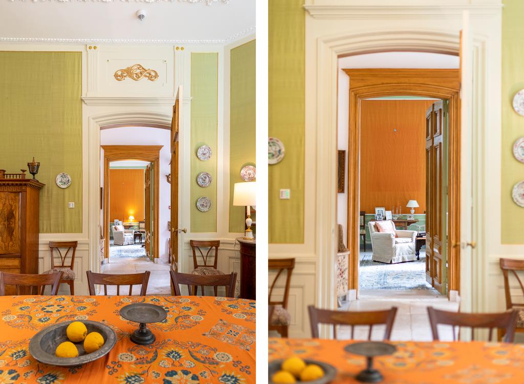 The interior is rich in period details, including ornate fireplaces, damask wall coverings, refined staircases and bespoke finishes.