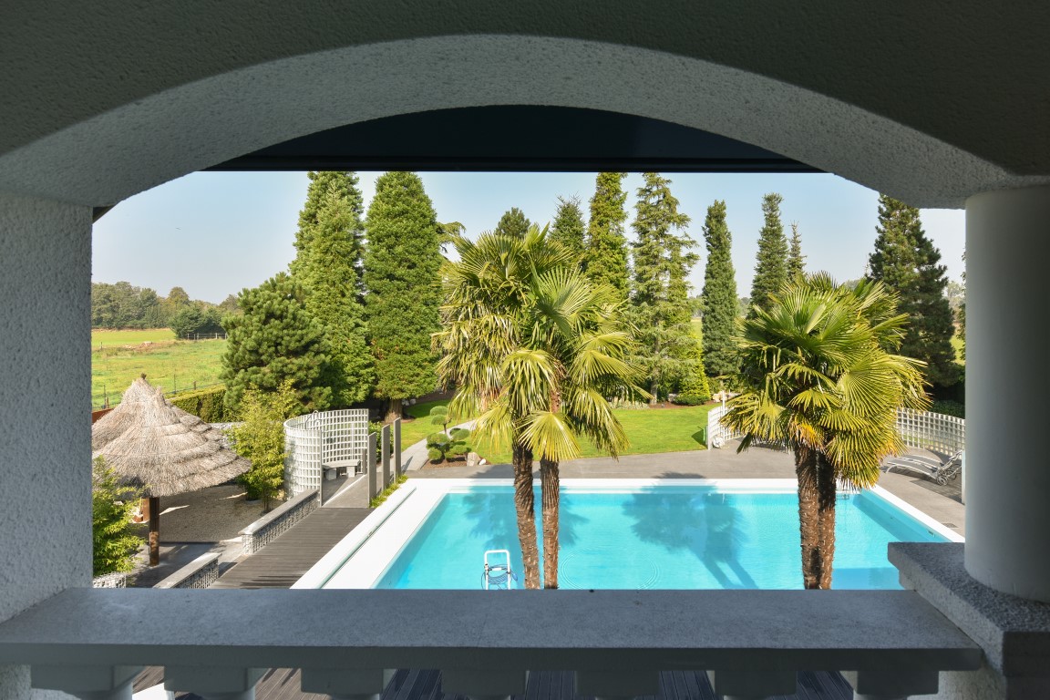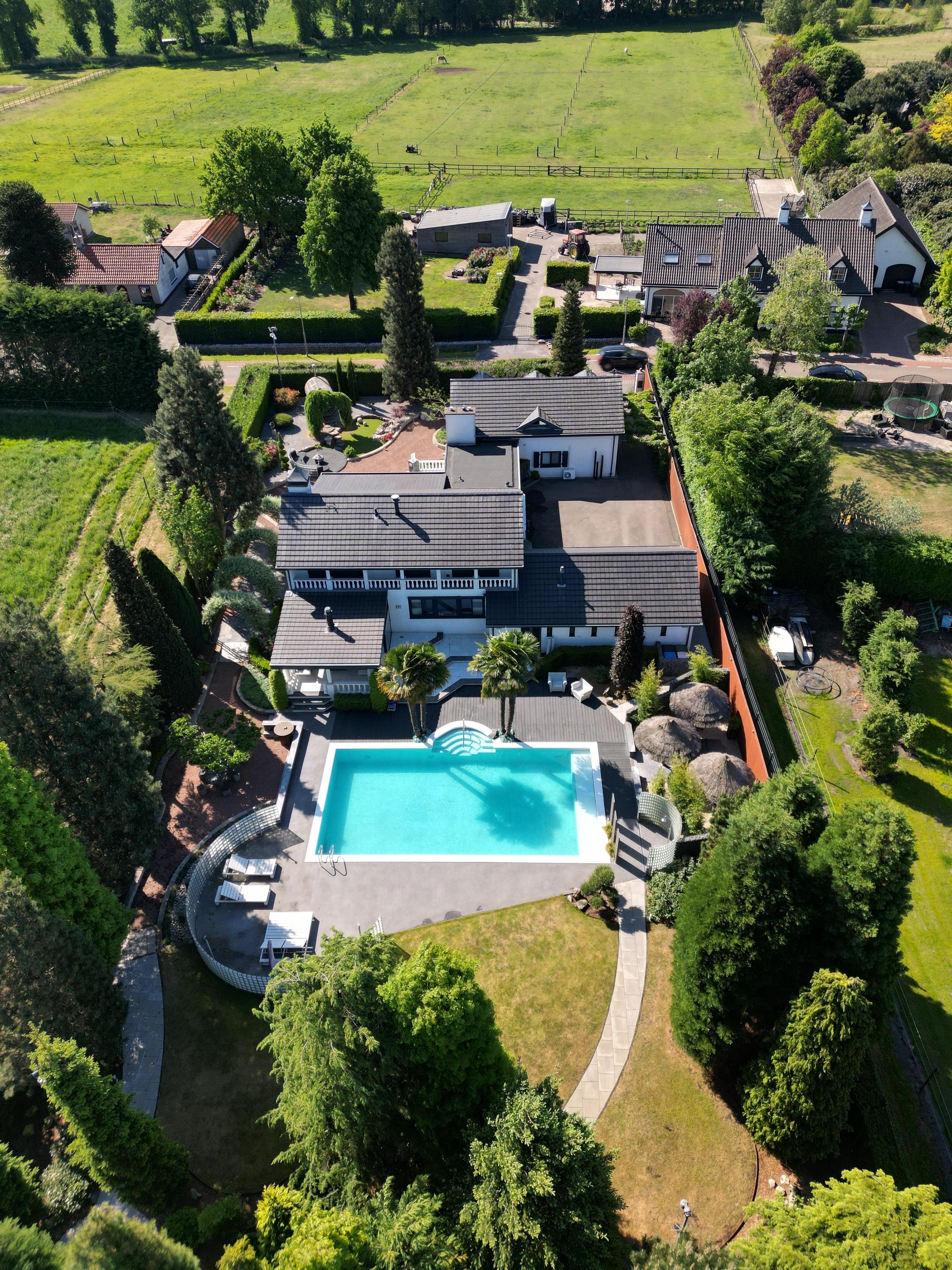 Ook buitenshuis is aan werkelijk ieder detail aandacht besteed en zijn vele luxes aanwezig. Denk hierbij aan het verwarmd zwembad, een jacuzzihoek met buitendouche en buitenhaard, de sfeervolle veranda aan de achterzijde met gastafelhaard, een 2e veranda aan de zonzijde met buitenkeuken, hoogwaardig groen rondom, grondpomp met beregeningsinstallatie (roestvrij water), keramisch straatwerk, een hout gestookte sauna, smaakvolle tuinverlichting, etc.
