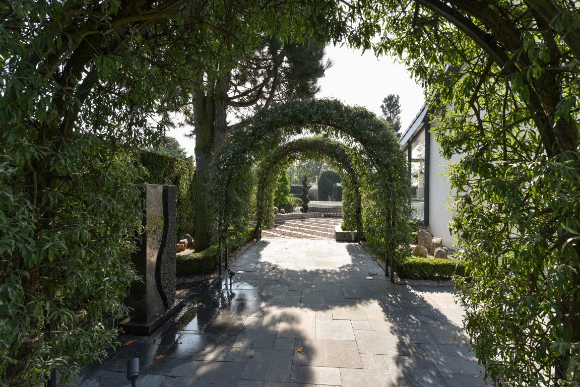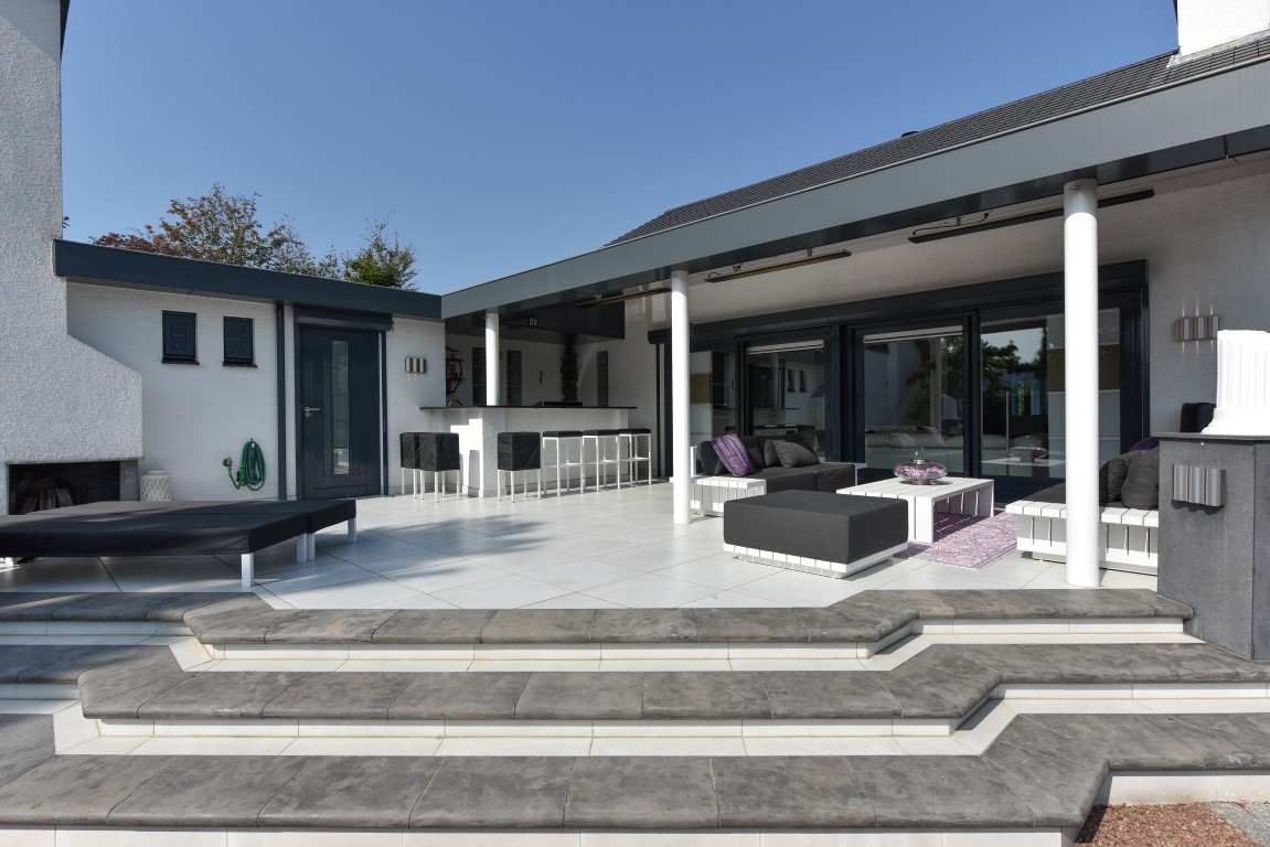 De living is comfortabel ruim en licht van opzet, beschikt over een Cinewall en een 3-tal schuifpuien richting de tuin rondom. Vanuit de eethoek loopt de sfeer vloeiend over richting de open woonkeuken met alle luxe van dien. Denk aan een royaal granieten werkblad, hoogwaardige inbouwapparatuur, granieten vloeren, inbouwverlichting en bovenal een zeer neutrale kleurstelling.