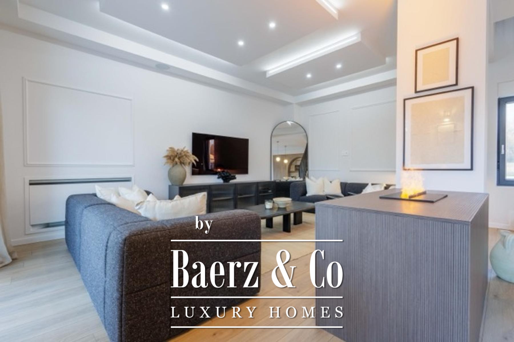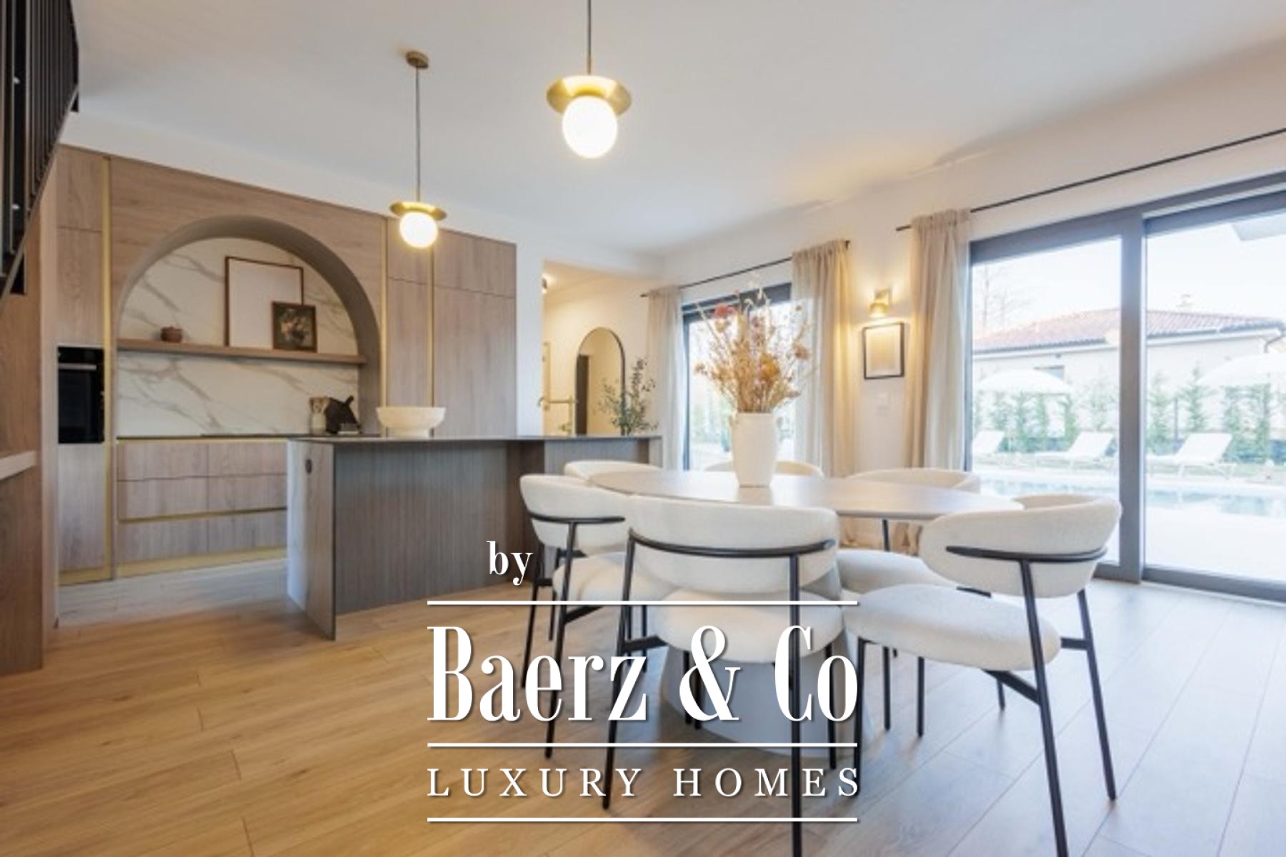 A carefully detailed staircase leads to three spacious bedrooms upstairs, all with en-suite bathrooms and access to a sun-drenched terrace overlooking the landscaped garden and a striking saltwater pool measuring 9 by 11 meters. Large windows showcase the surrounding natural beauty, offering a constant dialogue between interiors and the outside world. The courtyard provides ample parking, reinforcing practicality alongside luxury.