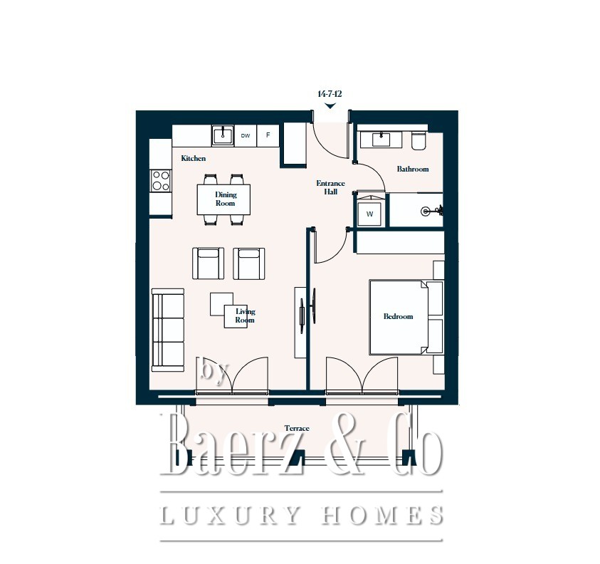 The apartment comprises a living area with kitchen and dining, one bedroom, a bathroom, and a terrace offering a partial view towards the sea. Completion is expected in December 2027, blending contemporary design with a spatial layout crafted for both leisure and day-to-day ease.