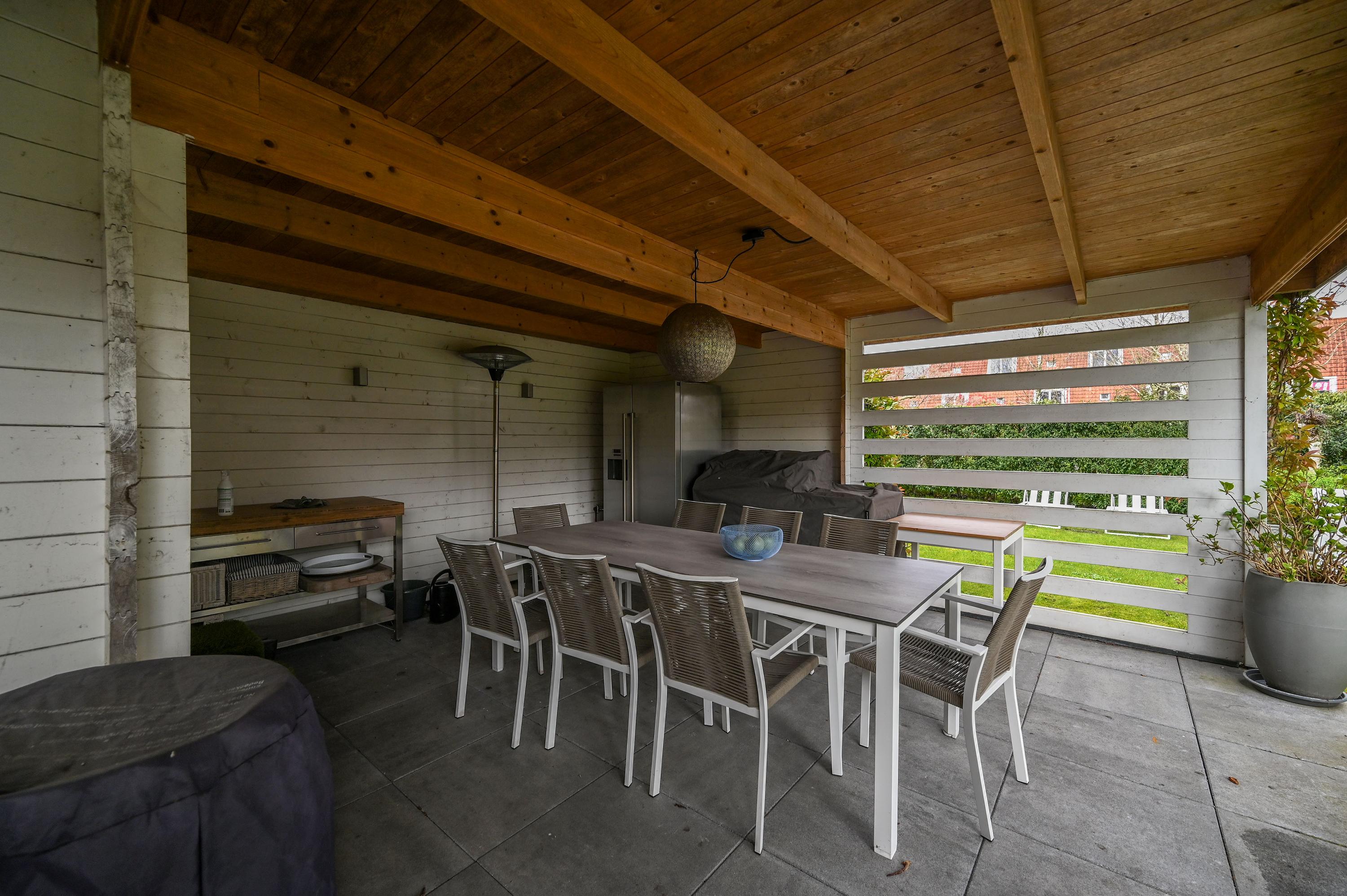 The beautiful garden is a true outdoor paradise, directly accessible via the sliding doors in the living room and via the side of the house through a charming open gate. The garden offers plenty of privacy and enjoys sunlight throughout the day, perfect for enjoying the outdoors. At the rear, there is a spacious terrace with a cozy seating area, complete with an awning spanning the full width of the house, ideal for both sun and shade. At the back of the garden stands a charming garden house with a covered area, perfect for a dining area with barbecue. The garden house features a neat wooden floor, electricity, and water, making it perfect as a workspace, hobby room, or for storage. Adjacent to the covered area is an additional terrace with seating, sheltered by a natural canopy of four beautiful plane trees, creating an idyllic spot to relax or entertain guests.