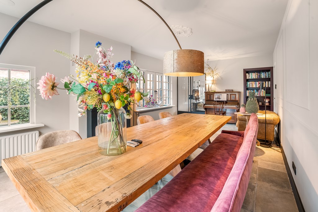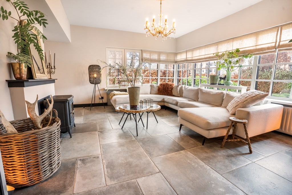 De sfeervolle woonkamer-en-suite van ca. 55 m² is heerlijk licht, voorzien van een gezellige houtkachel en vernieuwde kozijnen met roedeverdeling. Alle wanden en het plafond zijn in 2025 strak gestuct en geschilderd. Vanuit de eetkamer kijkt u vrijuit over de fraaie tuin met als eyecatcher de ruime en moderne veranda met bar en houtkachel. In de eetkamer is ruimte voor een grote familietafel en deze ruimte beschikt over een gashaard voor extra warmte en sfeer. Op de gehele begane grond is een prachtige nieuwe tegelvloer aangebracht.