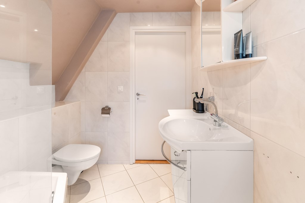 De bordestrap brengt u naar een sfeervolle verdieping met vide en glas-in-lood. Er zijn drie volwaardige slaapkamers van ca. 17 m², 14,5 m² en 7 m². De slaapkamer aan de achterzijde geeft toegang tot het grote zonnige balkon van ca. 15 m². Ook vaste kastruimte ontbreekt niet op de eerste verdieping. De comfortabele badkamer van ca. 5 m² is uitgevoerd in lichte kleurstelling. Deze beschikt over een ligbad met douchefunctie, een hangend toilet en een wastafelmeubel met spiegelkast. Het plafond is voorzien van inbouwspots.