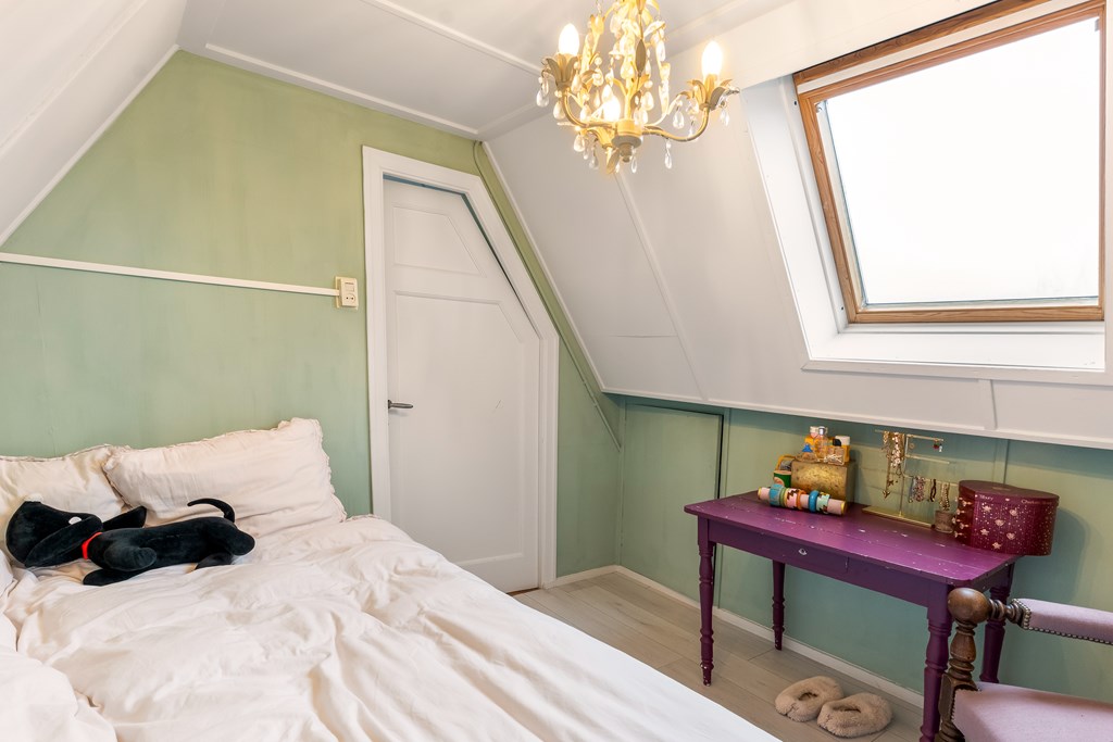 Op deze verdieping bevindt zich de vierde slaapkamer van ca. 7,3 m². De mogelijkheid bestaat om hier een vijfde kamer te realiseren. Achter de knieschotten zit verrassend veel bergruimte. Op deze verdieping én in de ouderslaapkamer op de eerste verdieping is een wastafel-aansluiting aanwezig.
