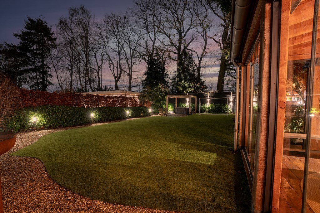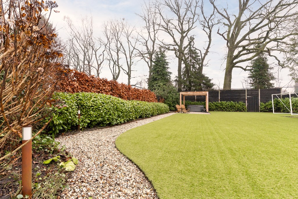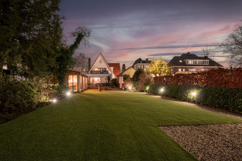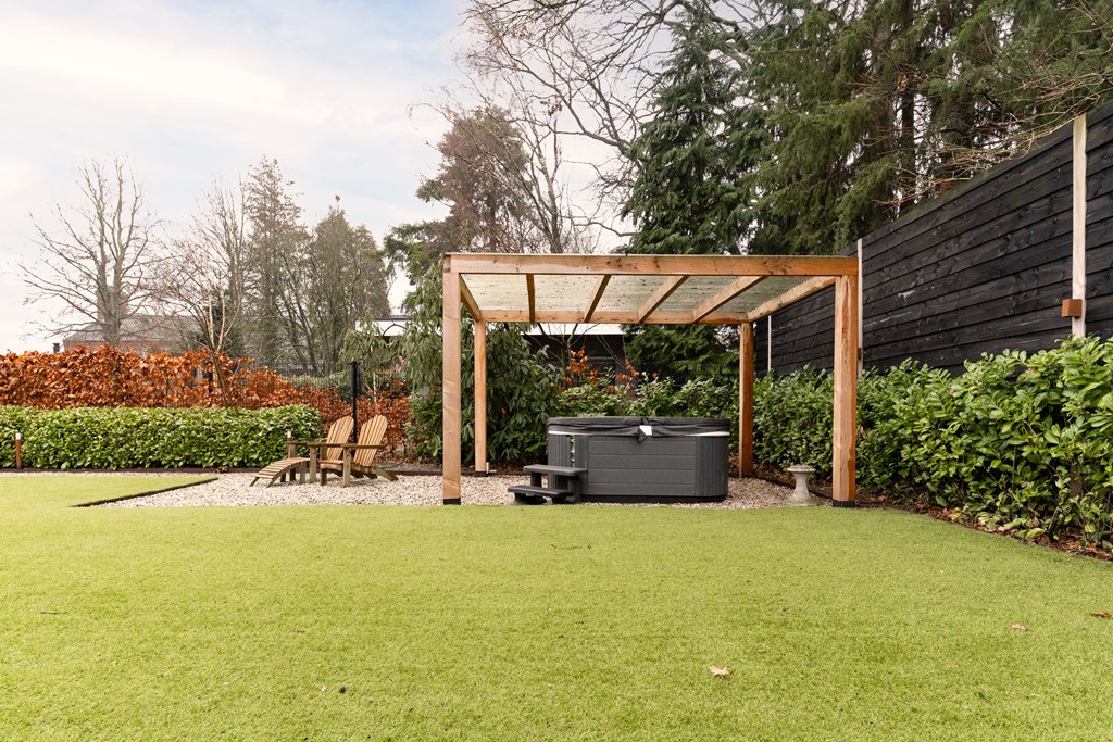 De woning is gelegen op een riant perceel van 1.043 m². Zowel aan de voor- als aan de achterzijde is de tuin groen, ruim en verzorgd en beschikt het over een ruime veranda met sfeervolle houtkachel. De in 2021 aangelegde achtertuin ligt op het zuidoosten en biedt veel privacy door hoge bomen en beschikt over een beregeningsinstallatie en fraaie tuinverlichting. Door de diverse terrassen, is er op elk moment van de dag een zonnige plek te vinden.