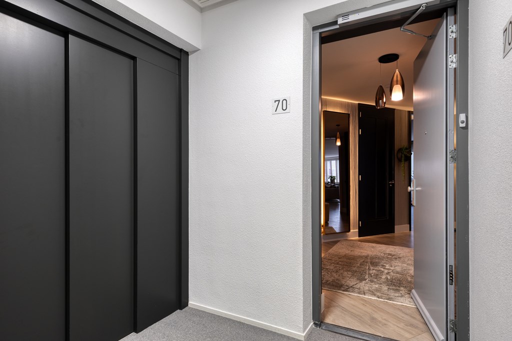 Upon entering the apartment, you are welcomed into a spacious hallway that immediately sets the tone for what follows. The finish is sleek and serene, featuring high-quality materials such as pivot doors and carefully selected lighting. The entire apartment is equipped with underfloor heating. From here, you have access to the separate toilet and the practical utility room, offering space for laundry appliances and storage, neatly out of sight yet perfectly integrated into the overall design.