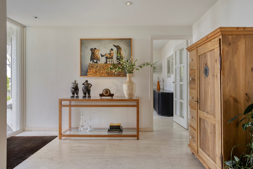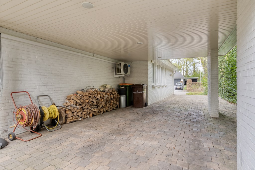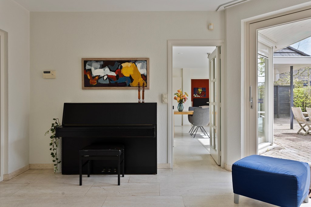 You enter the property from the street side, where you have your own driveway, including a carport. There is also ample parking available in the immediate area. Once inside, you arrive in a spacious and well-maintained hallway that immediately offers a warm welcome. From here, you have access to the toilet, the study, the living room, and the staircase to the first floor. The hallway serves as a central and practical hub within the home.