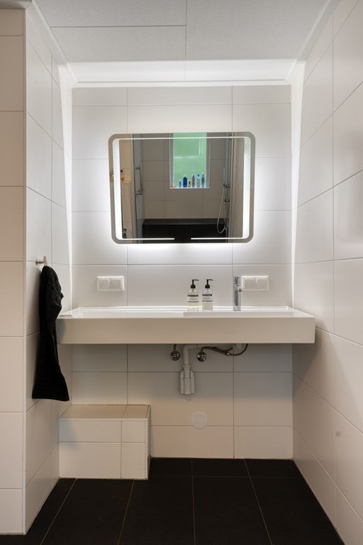 Adjacent to the bedroom, you will find a fully tiled bathroom. It is equipped with a wall-mounted toilet, a walk-in shower, and a washbasin with mirror, offering all conveniences on the ground floor.