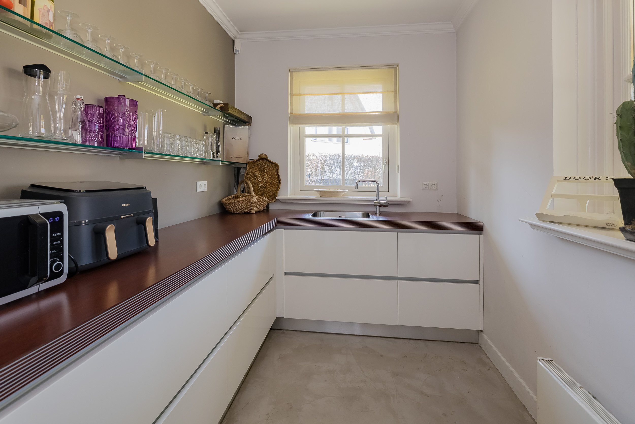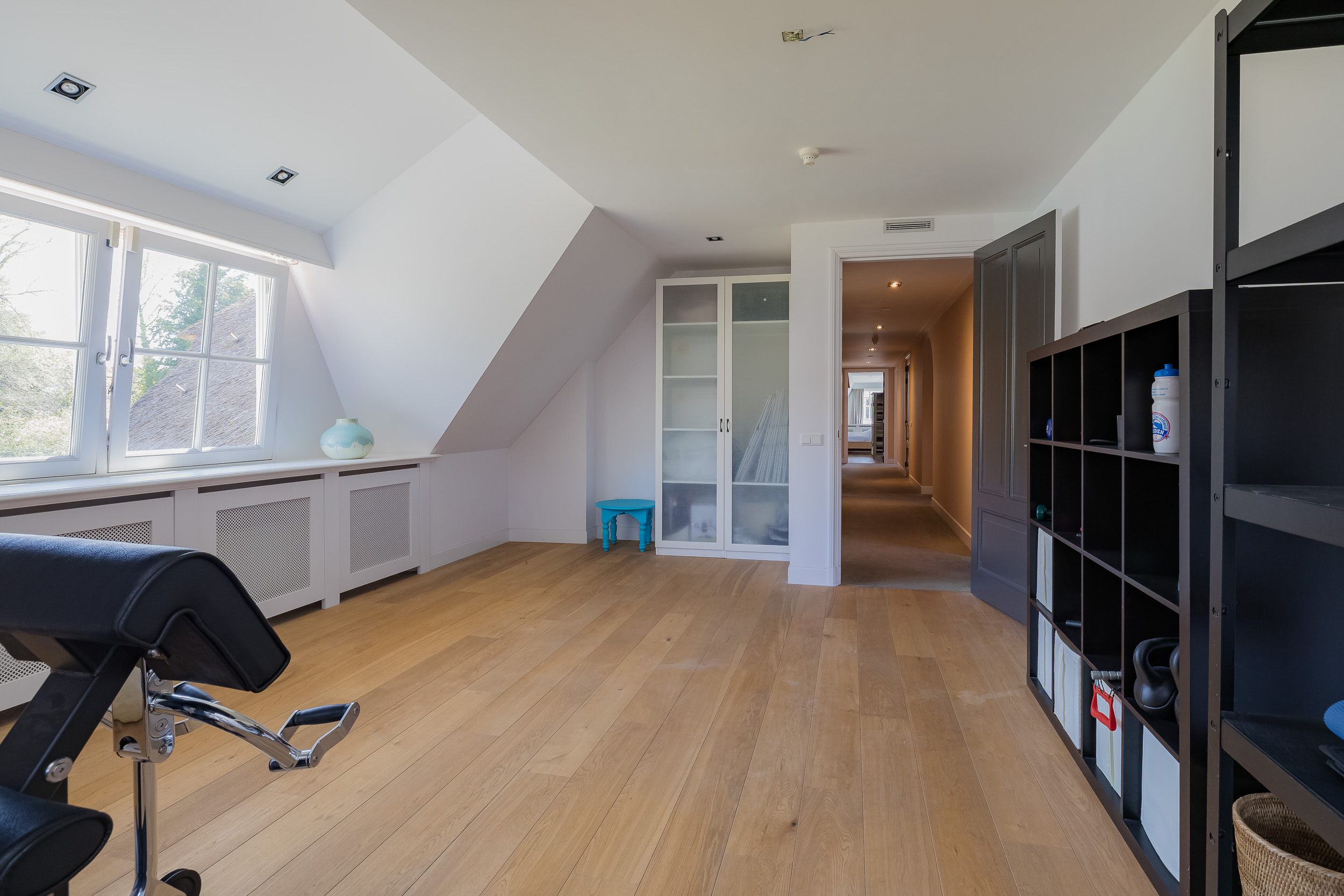 Step into the spacious hall with guest toilet and immediately feel the stylish atmosphere that continues throughout the house. The spacious living room with a beautiful sandstone fireplace and large windows offers a fantastic view of the surrounding garden. For cozy movie nights, there is a separate TV room directly to the right of the entrance. The beautiful concrete-look floor (hallway and living kitchen), luxury steel doors and the high-end kitchen with work island and high-quality appliances provide a modern, yet warm feel. In the living kitchen is further created a lovely sitting area, with access and view of the garden and a modern gas fireplace. Furthermore, on the first floor you will find a practical utility room, double garage, and have access to a spacious porch and a large terrace, where you can fully enjoy the outdoors.
