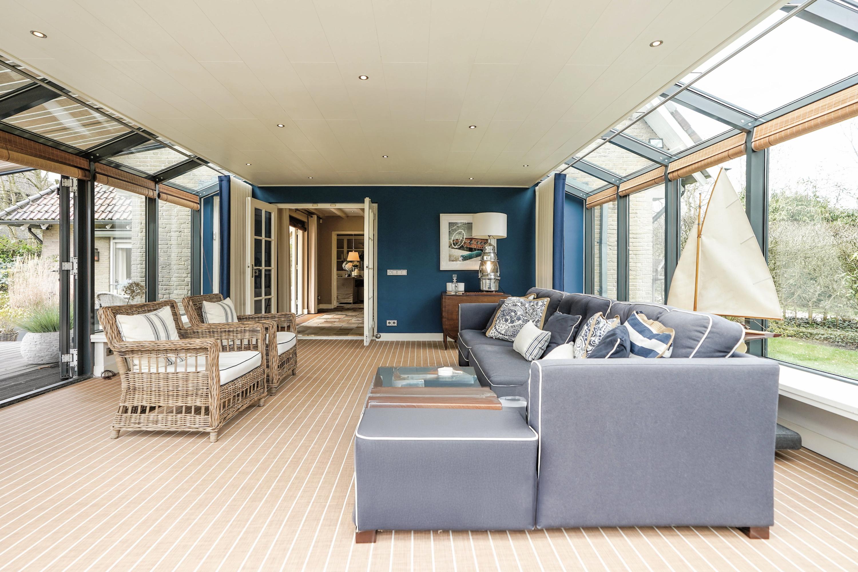 From the hall you enter the very spacious, attractive and bright living room through the double doors with a beautiful sandstone fireplace and sliding doors to one of the terraces. The dining room forms the connection between the living room and the kitchen. The luxury kitchen is spacious, bright and equipped with an island and of course all the usual equipment. Next to the kitchen you will find the utility room with cupboard wall and American fridge. You will also find the washing machine and dryer connections here. The entire ground floor has underfloor heating. From the kitchen you can also walk through French doors onto the terrace, with a nice, covered spot, perfect for a cup of coffee in the morning sun. Behind the kitchen is the lovely, sun-drenched conservatory (equipped with air conditioning) with again the beautiful view of the garden, the water and the nature reserve. Of course you can also walk from the conservatory, through French doors, straight into the garden.
