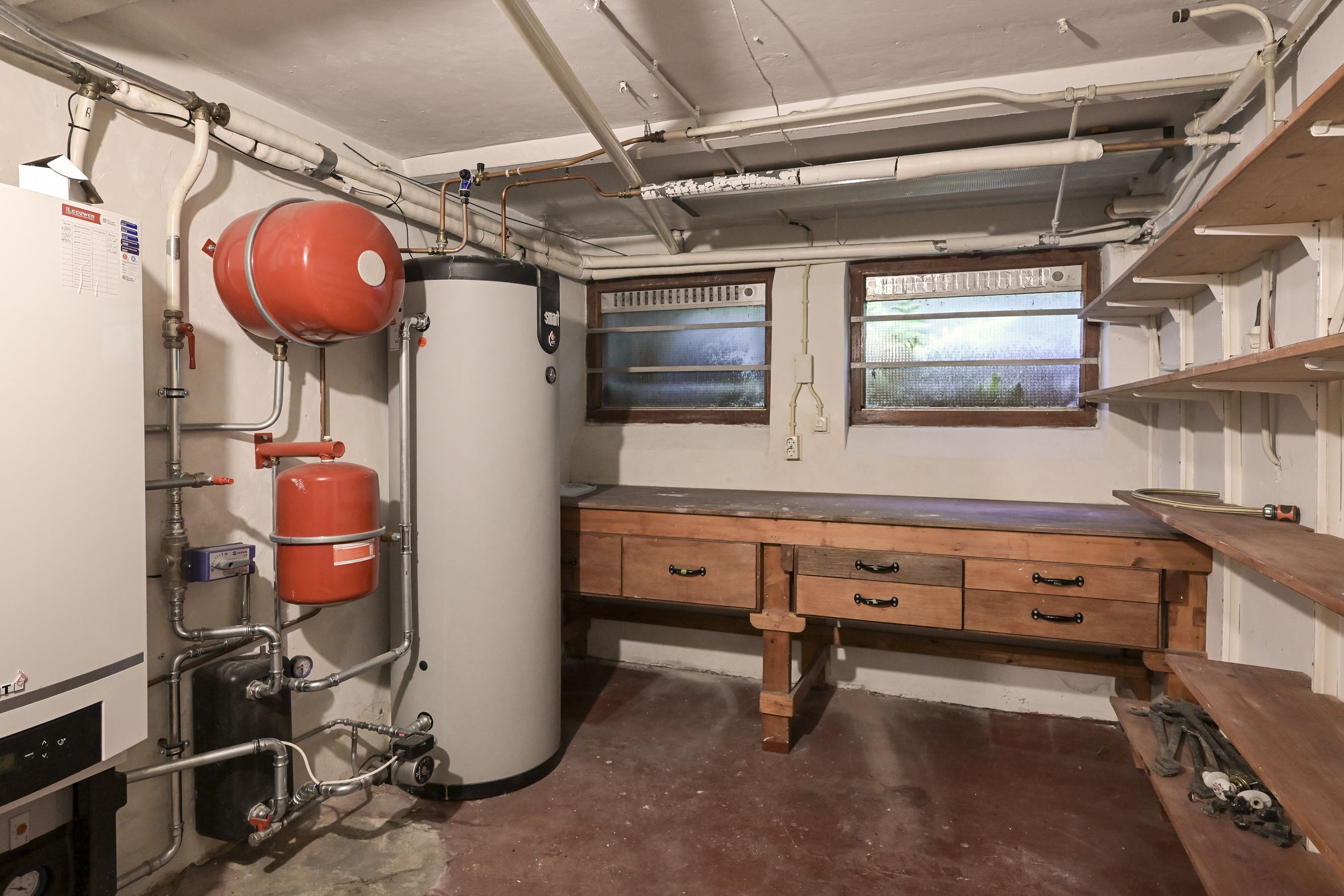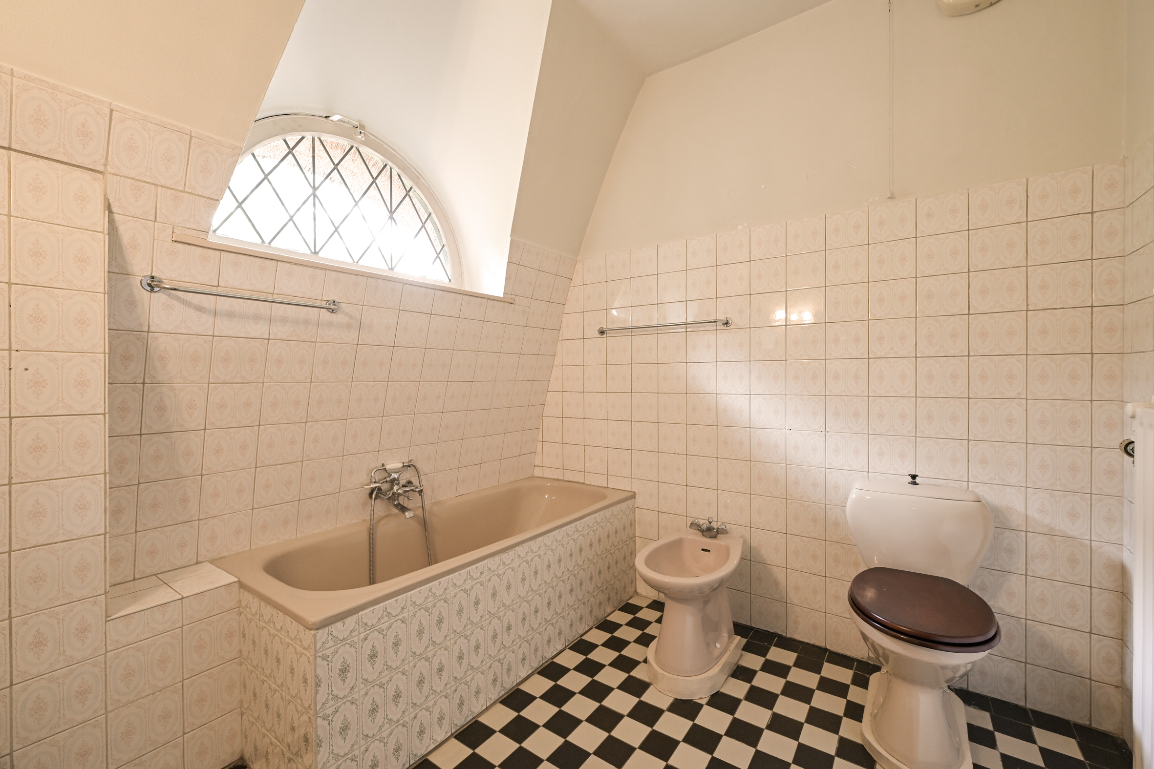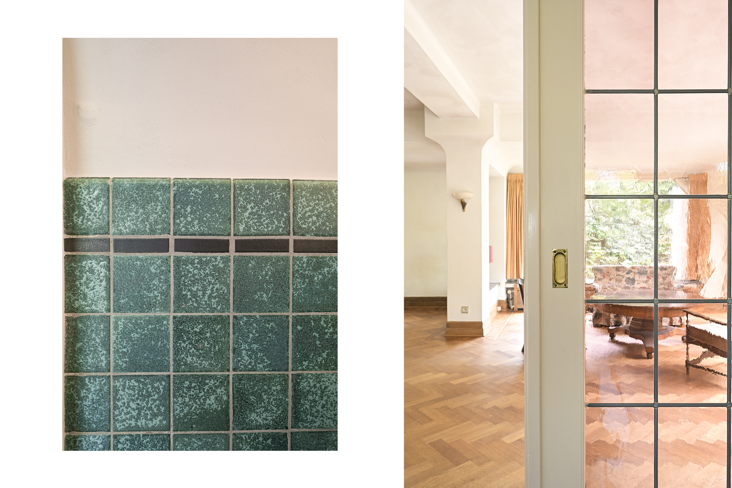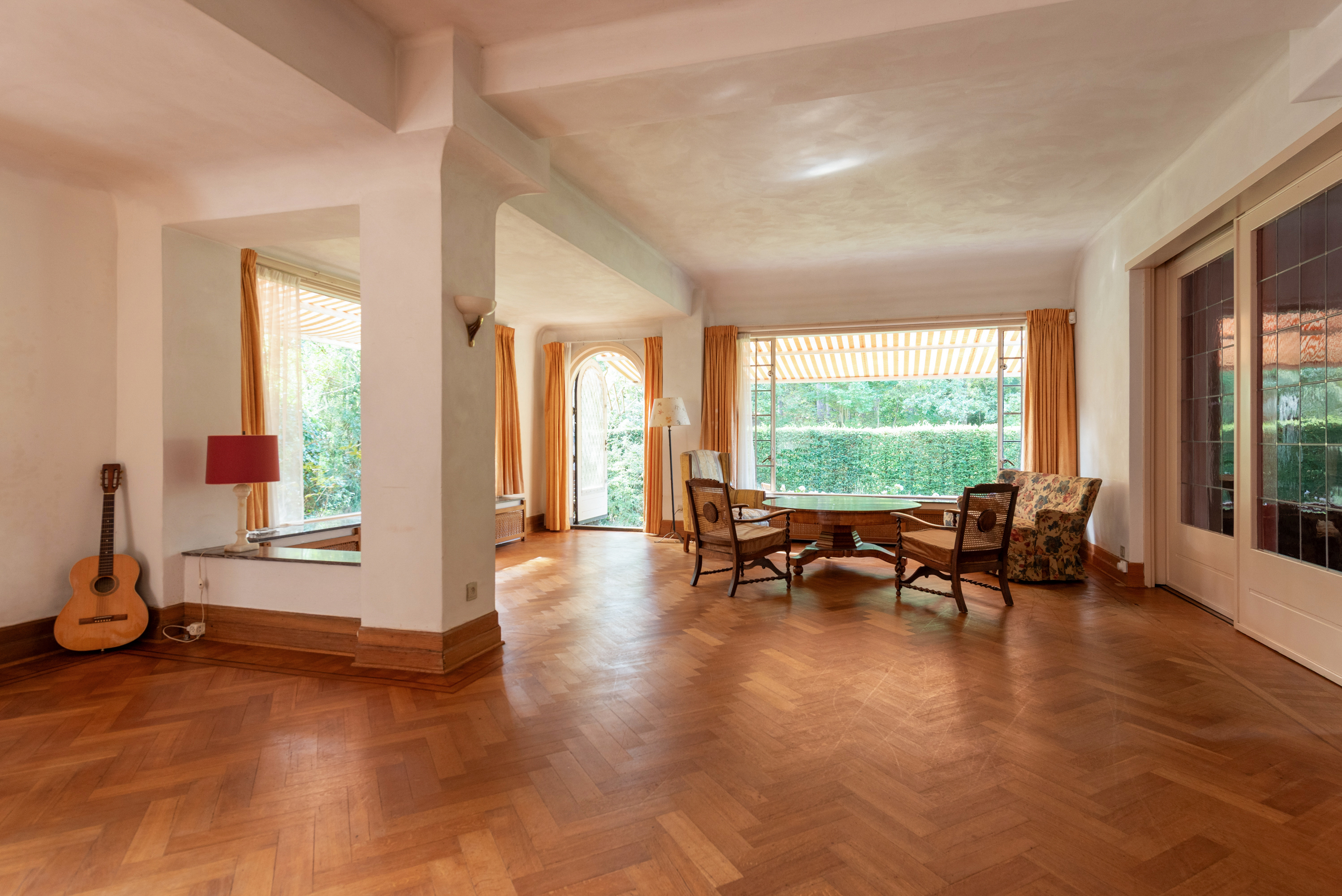 A spacious hall welcomes you with mosaic flooring, leading to an elegant living and dining area with stained glass sliding doors, fireplace, and marble windowsills. This flowing space opens directly to the garden, inviting natural light and outdoor ambiance. The kitchen, set with a semi-open plan and direct garden access, adjoins a practical utility room as well as a cellar of 23 m² arranged in three rooms.