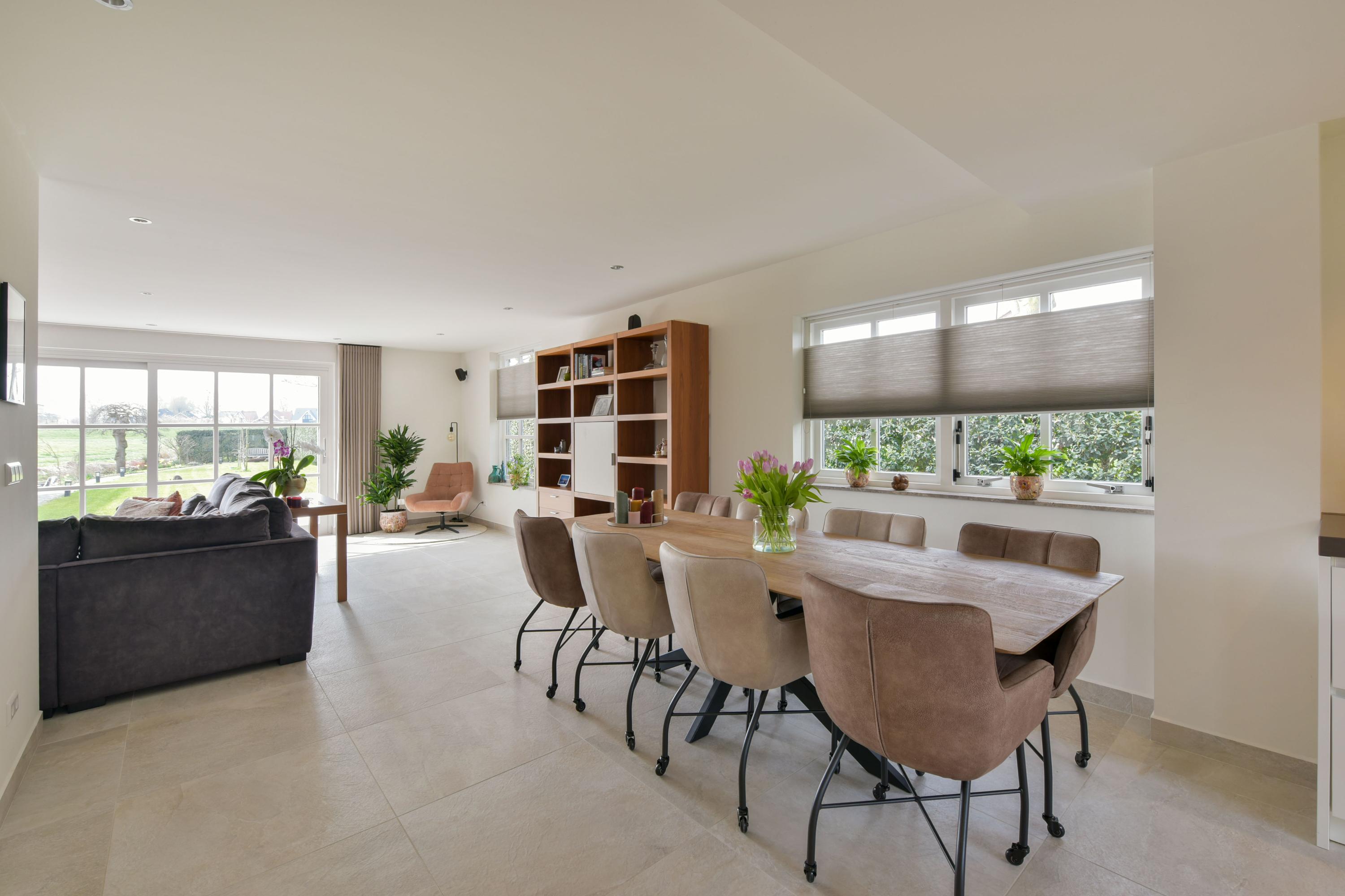 At the front of the house, you will find the impressive open kitchen (installed in 2019), which can truly be described as spacious. The large kitchen island forms the central hub—perfect for cooking together or enjoying casual dining. On both sides, stylish cabinet walls house a full range of built-in appliances, including a combination oven, steam oven, refrigerator, freezer, dishwasher, induction hob, ceiling extractor, Quooker, and two wine climate cabinets.