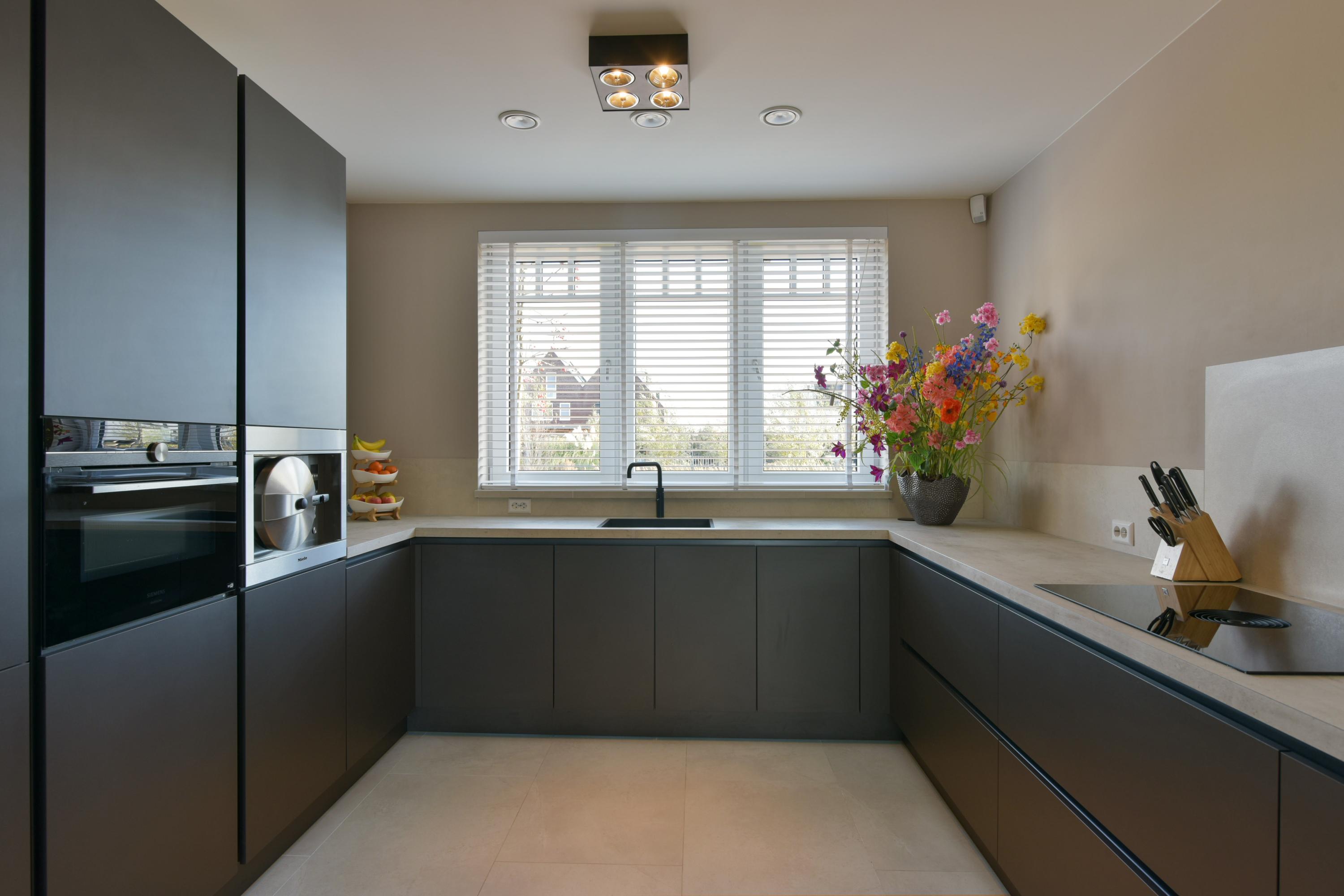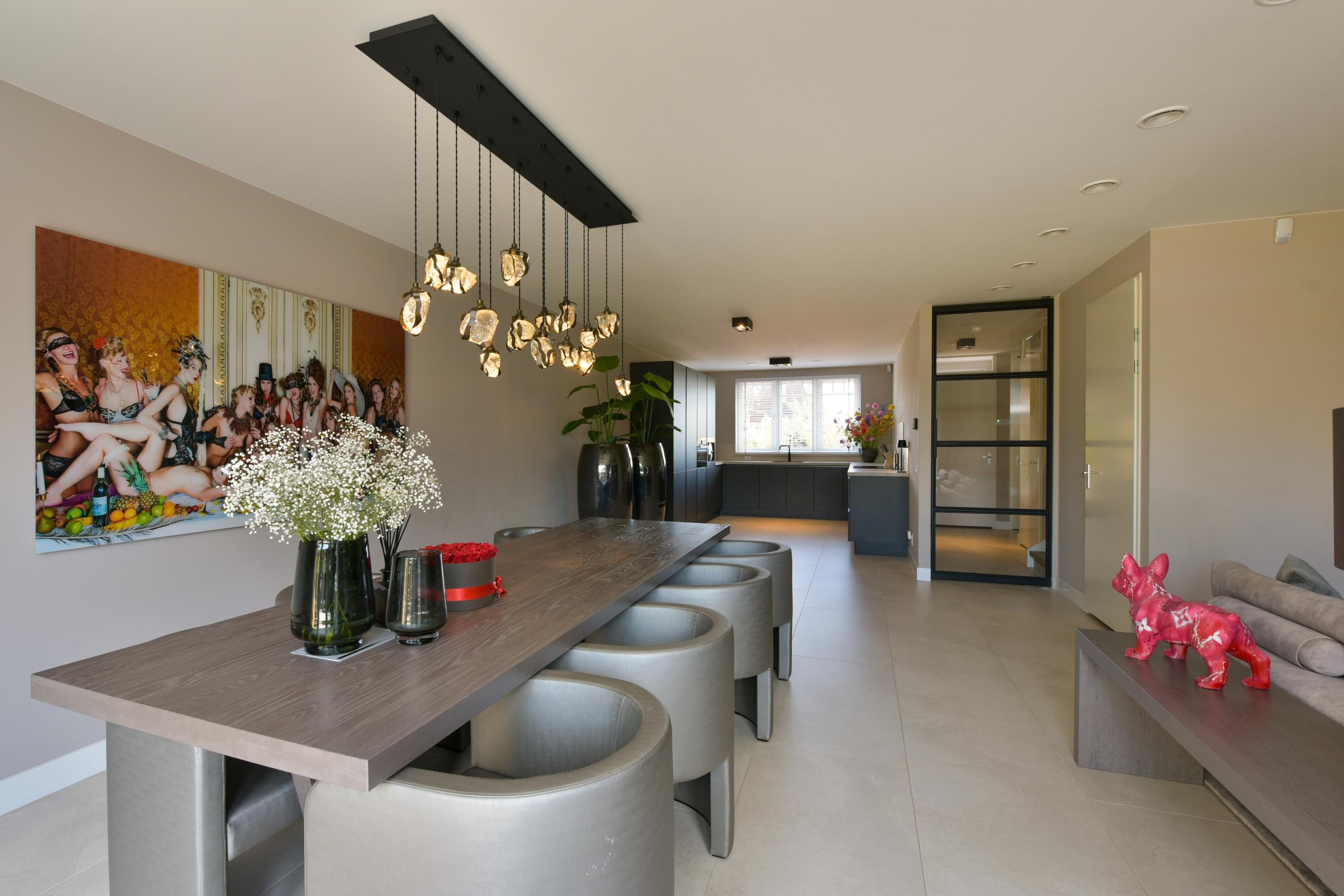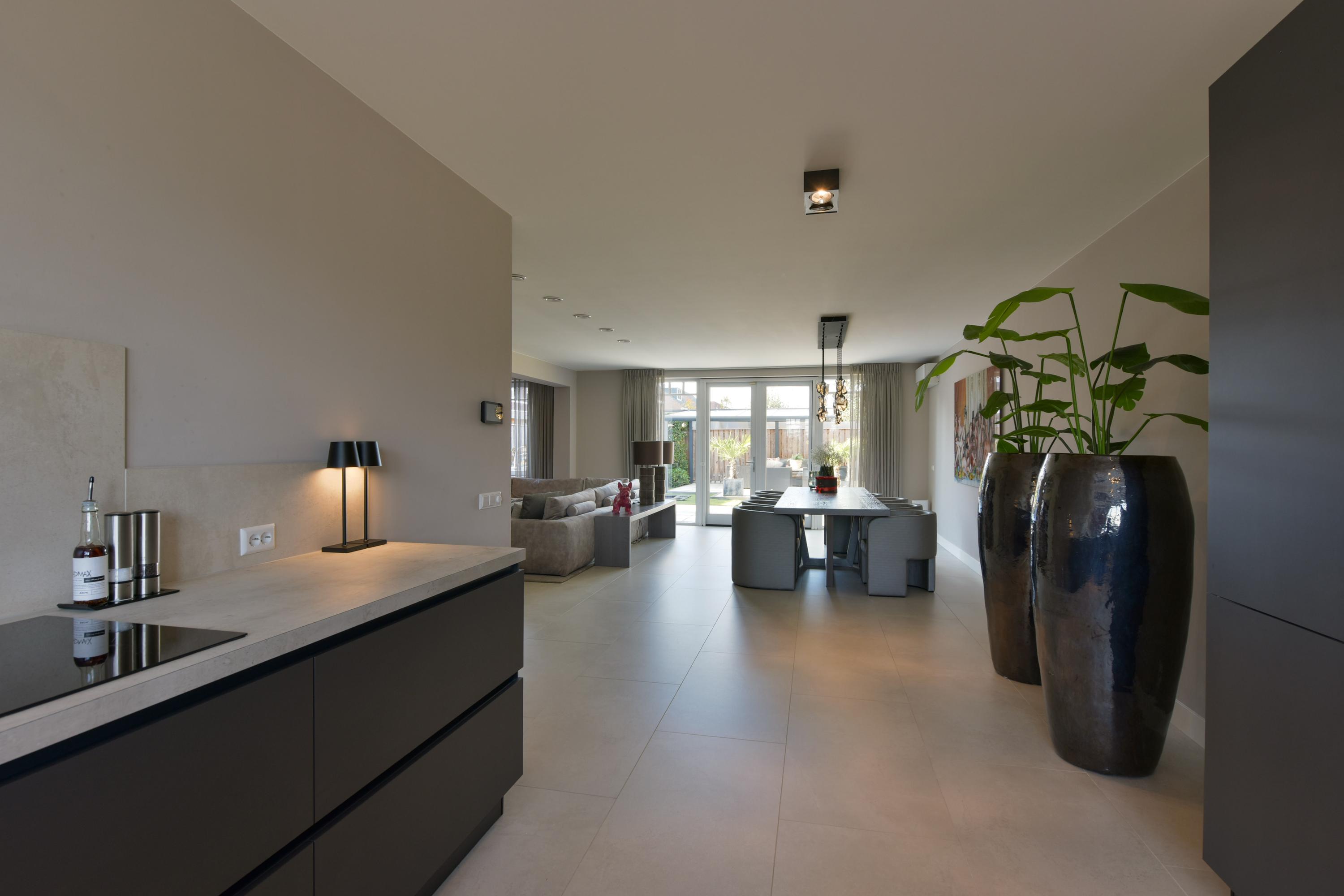 At the front of the house lies the modern U-shaped kitchen, a culinary dream for any cooking enthusiast. The kitchen includes two refrigerators, a freezer, a combination oven, an integrated Bora induction hob, a Quooker, a Le Mans corner unit, and plenty of drawers, providing abundant storage. A unique feature is the vacuum-sealing appliance integrated into the countertop (note: the steam oven will be taken by the seller). Luxury is further emphasized by the seamless tile finish: the backsplash and window sills are made of the same material as the floor, creating a beautifully harmonious look.