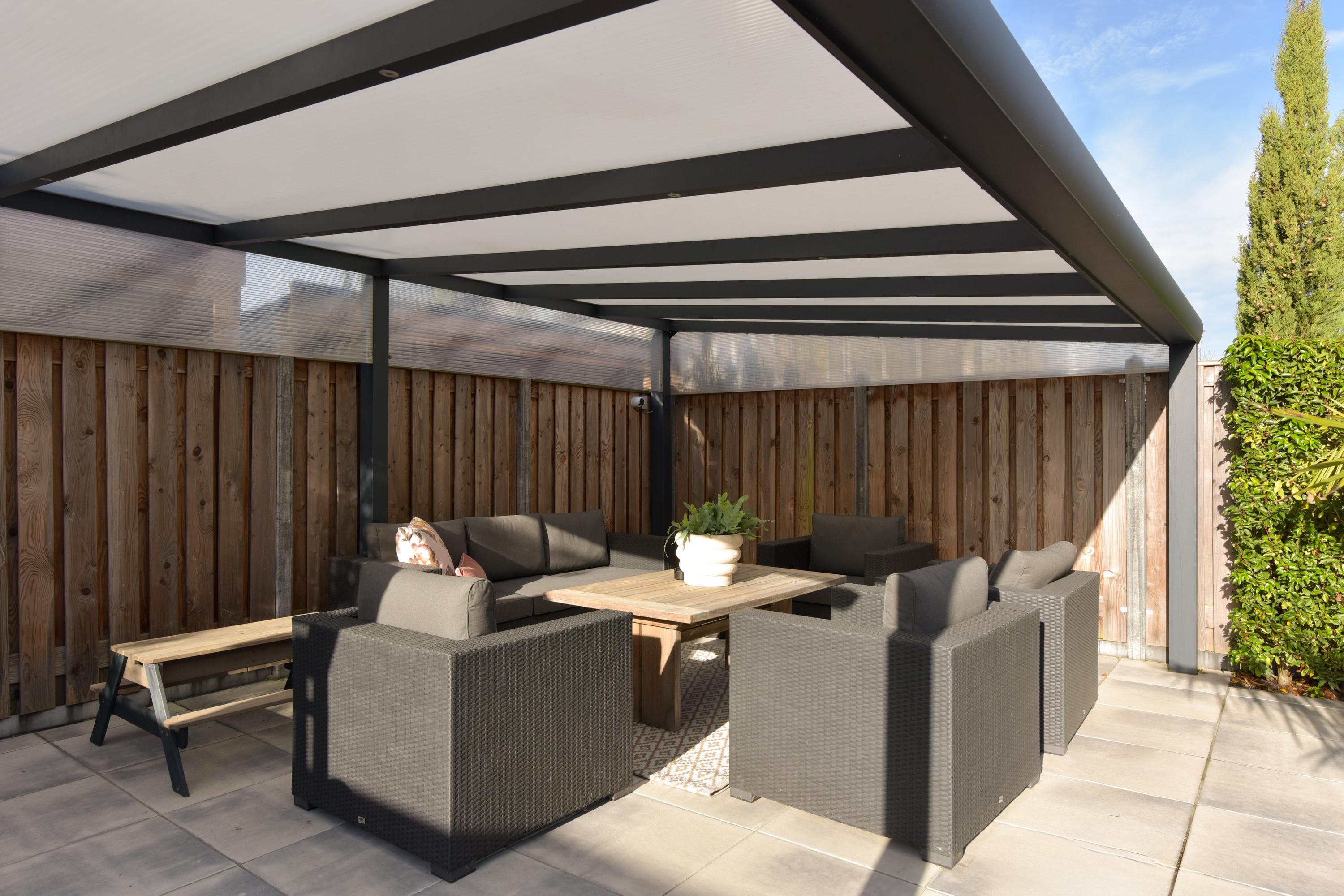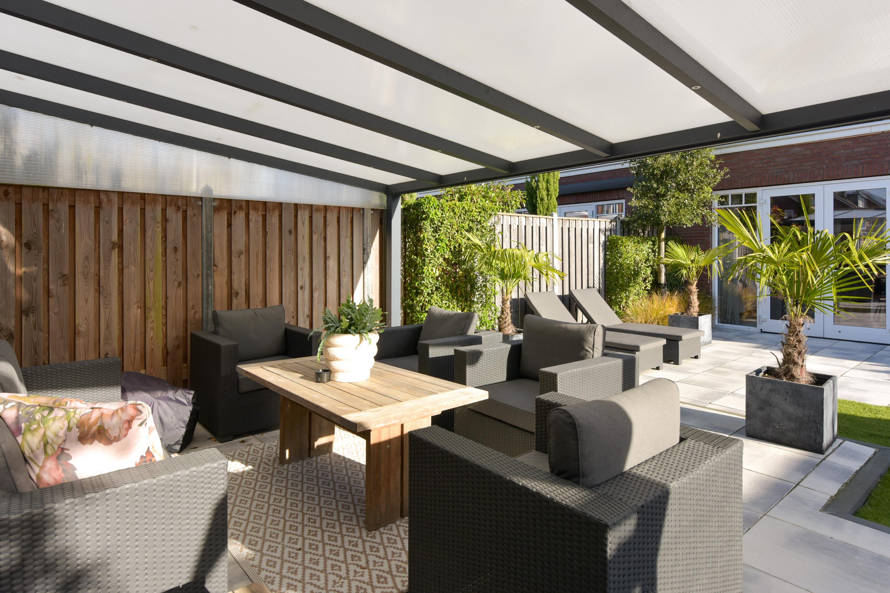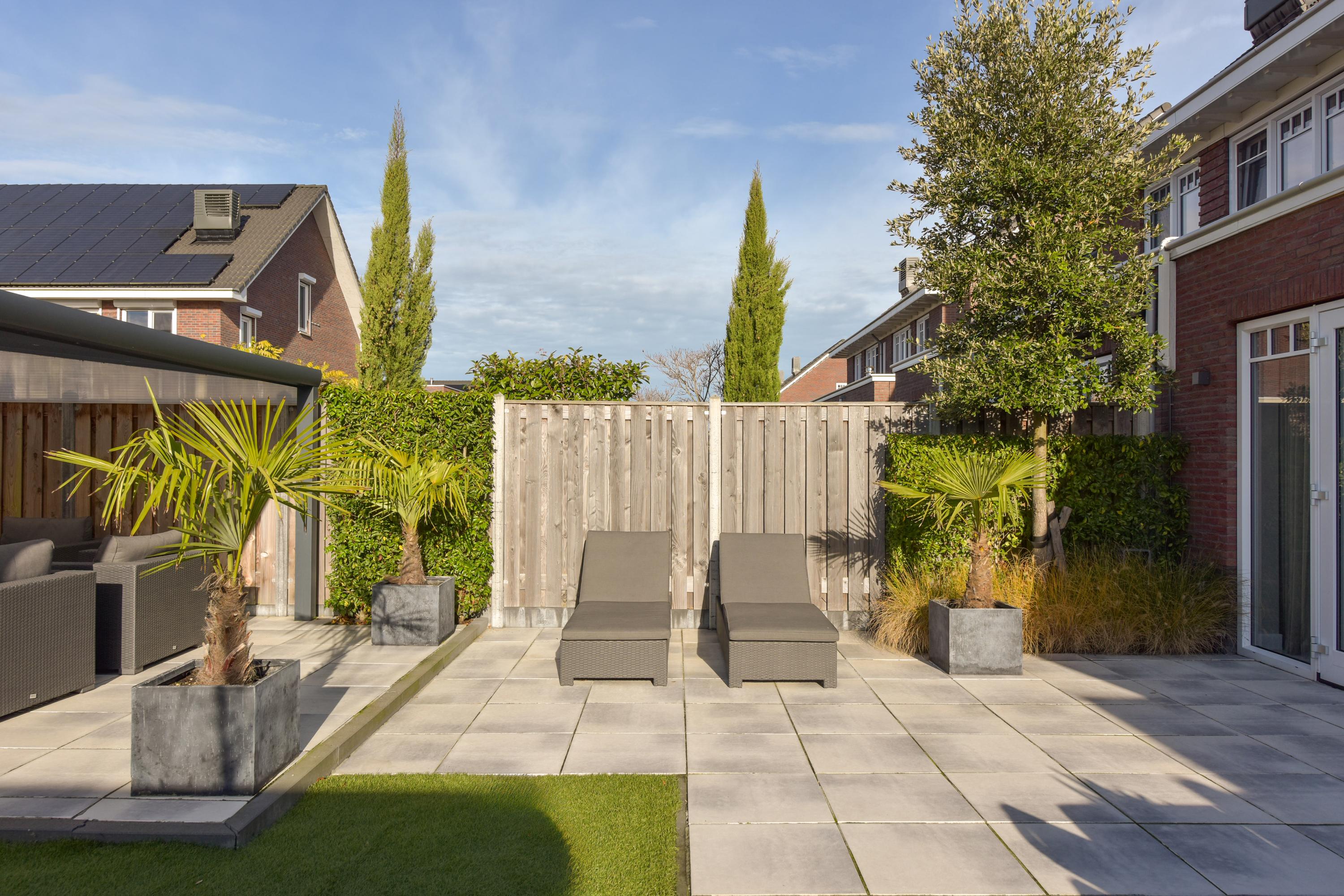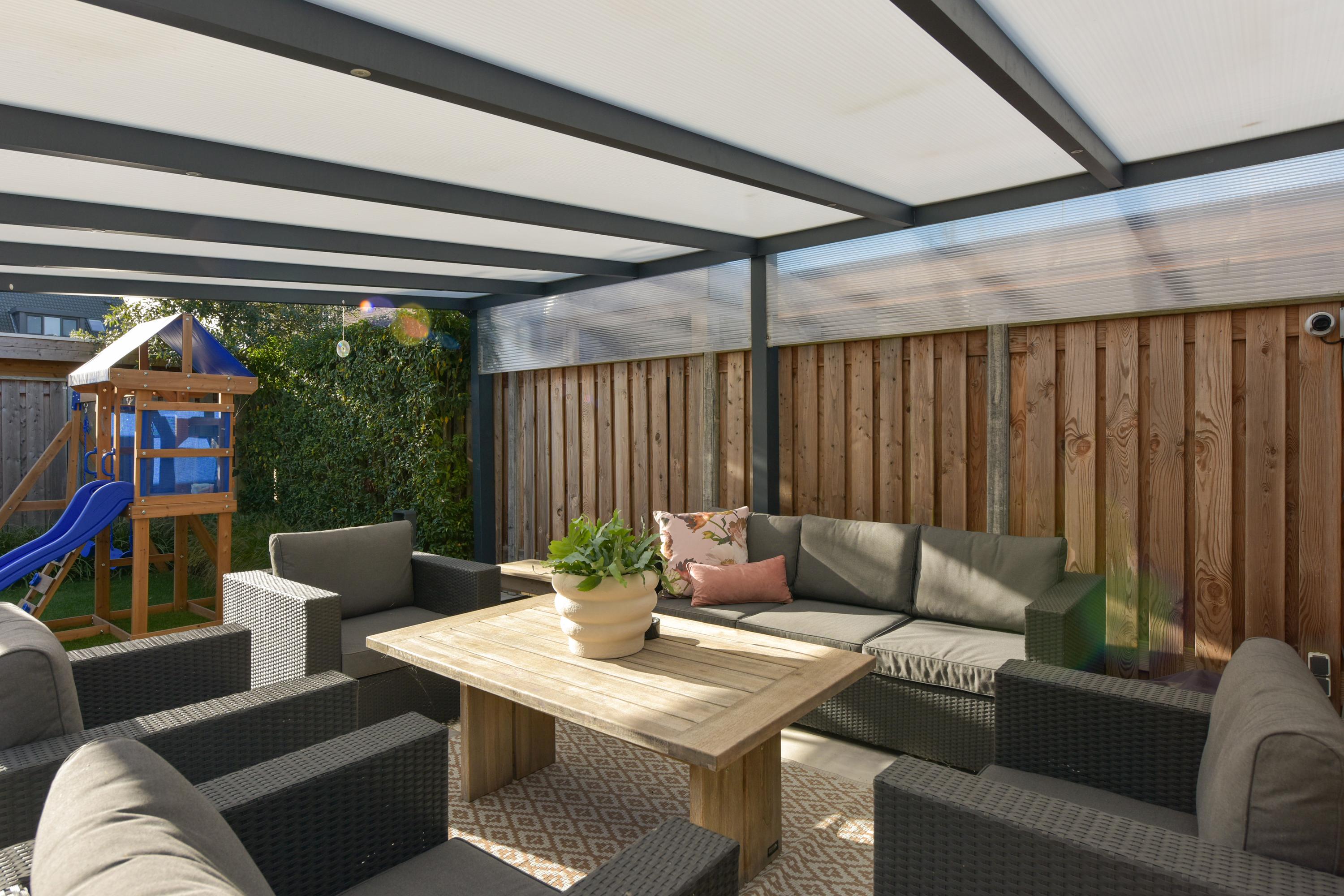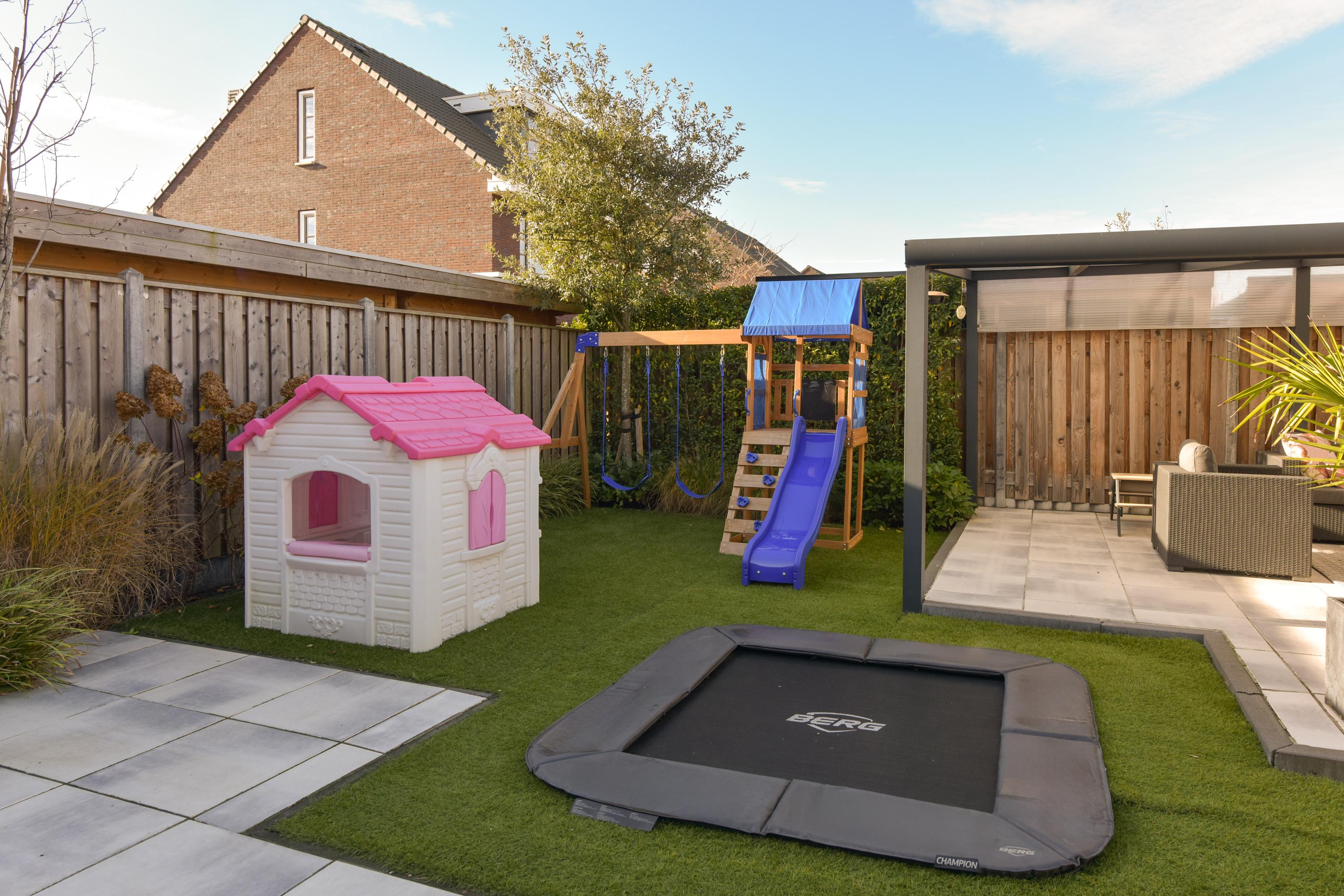 + West-facing garden with veranda, built-in trampoline, multiple terraces, and full irrigation system.