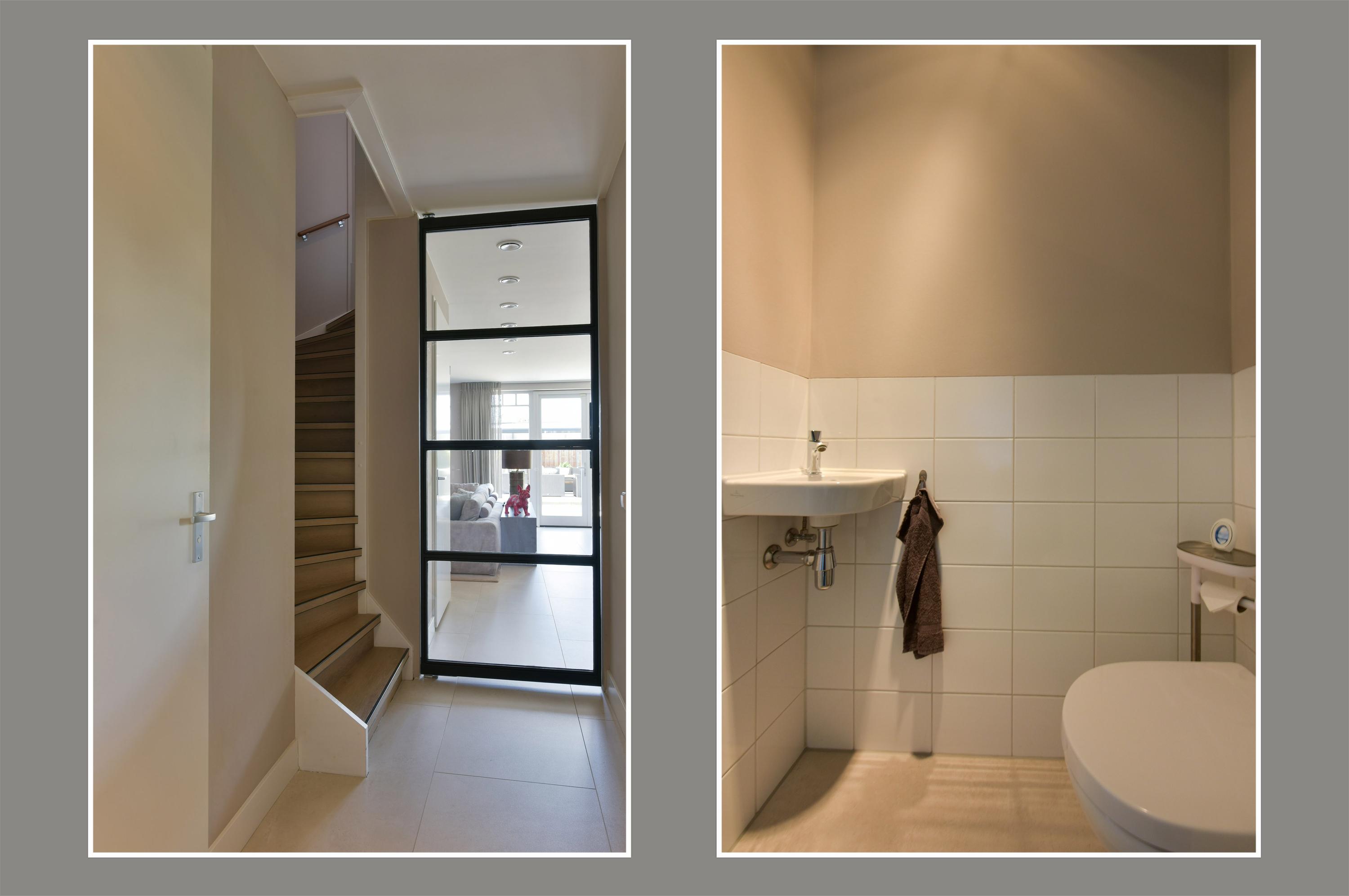 Inside, the representative hallway immediately showcases a thoughtful layout. The wardrobe is cleverly concealed in a large built-in closet, keeping coats, shoes, and bags out of sight, giving the hall a sleek and organized look. Here, you also find a modern guest toilet with a small basin, the meter cupboard with reinforced connections, and the staircase to the first floor. The steel pivot door is a striking feature, giving a first glimpse of the luxurious finishes that continue throughout the home.