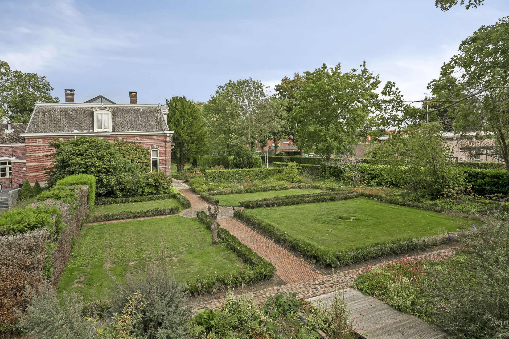 prachtig aangelegde landschapstuin voorzien van diverse terrassen verhard met granieten tegels, borders en gazon voorzien van diverse tuinkamers;