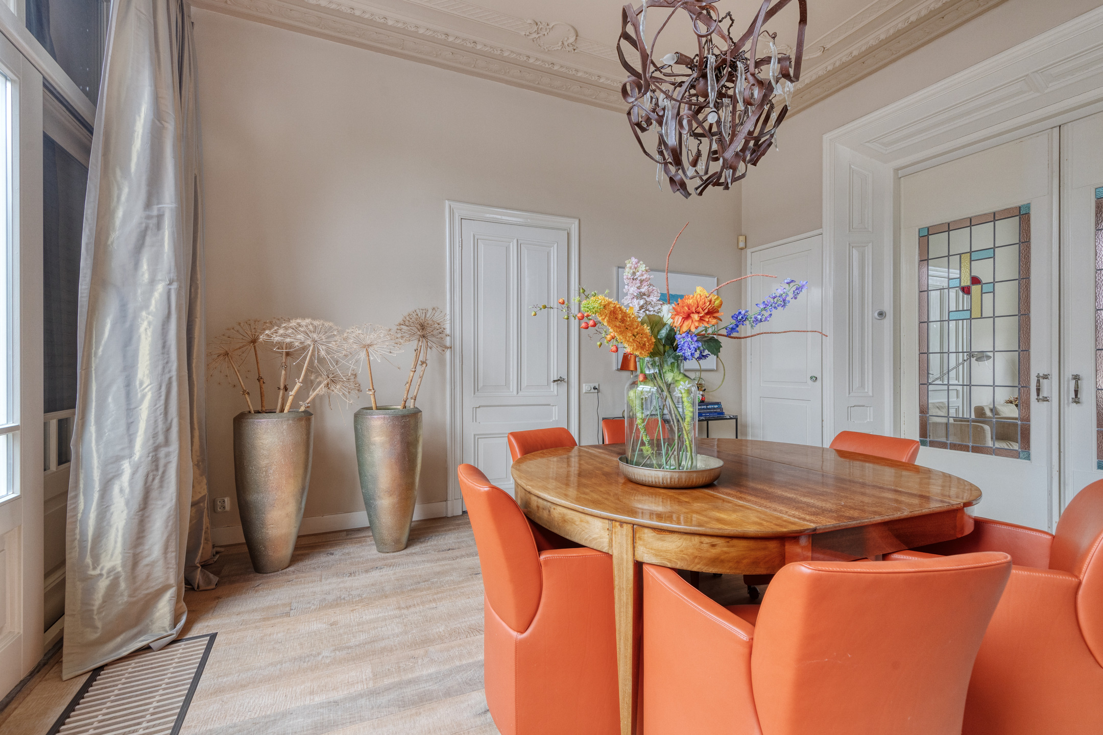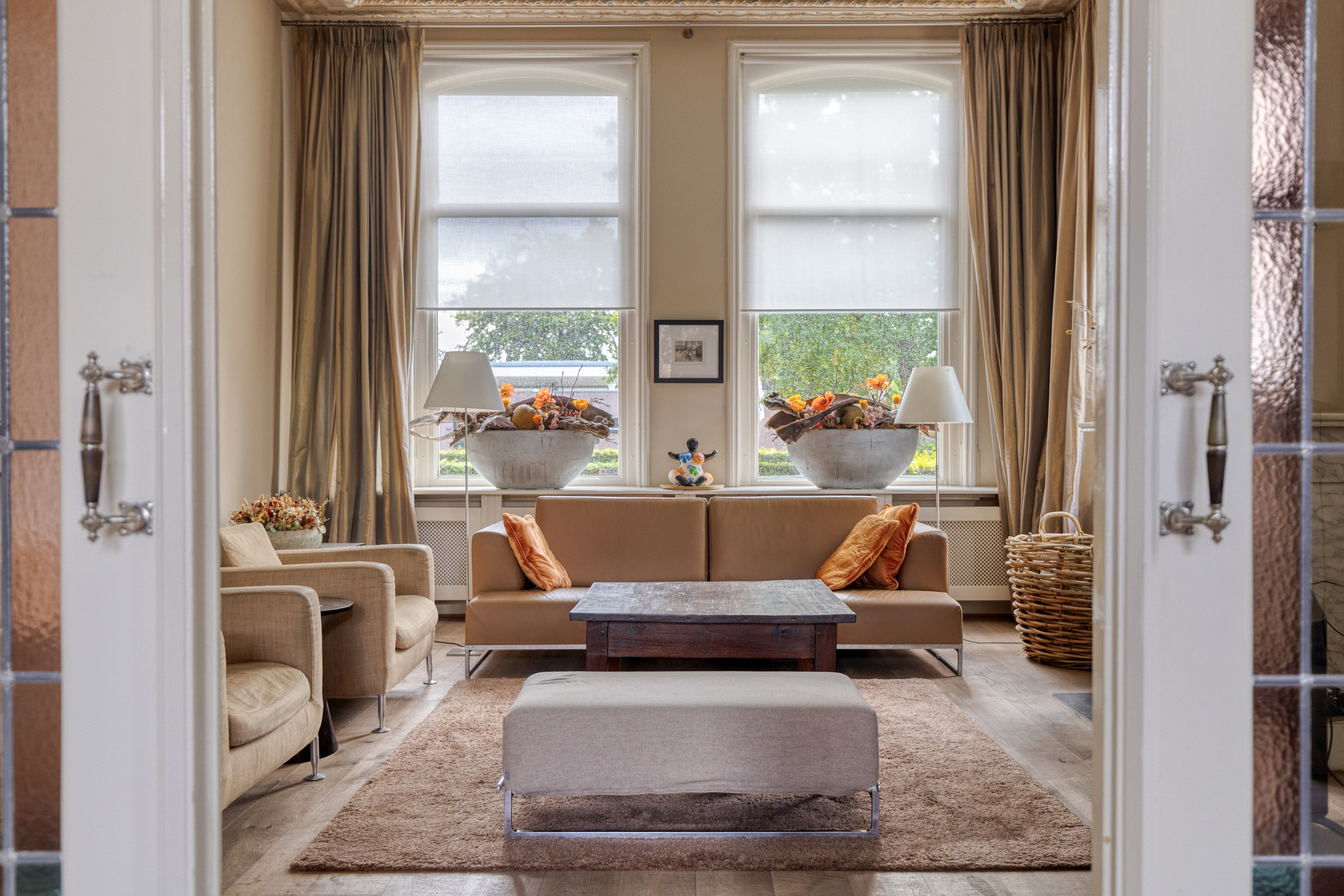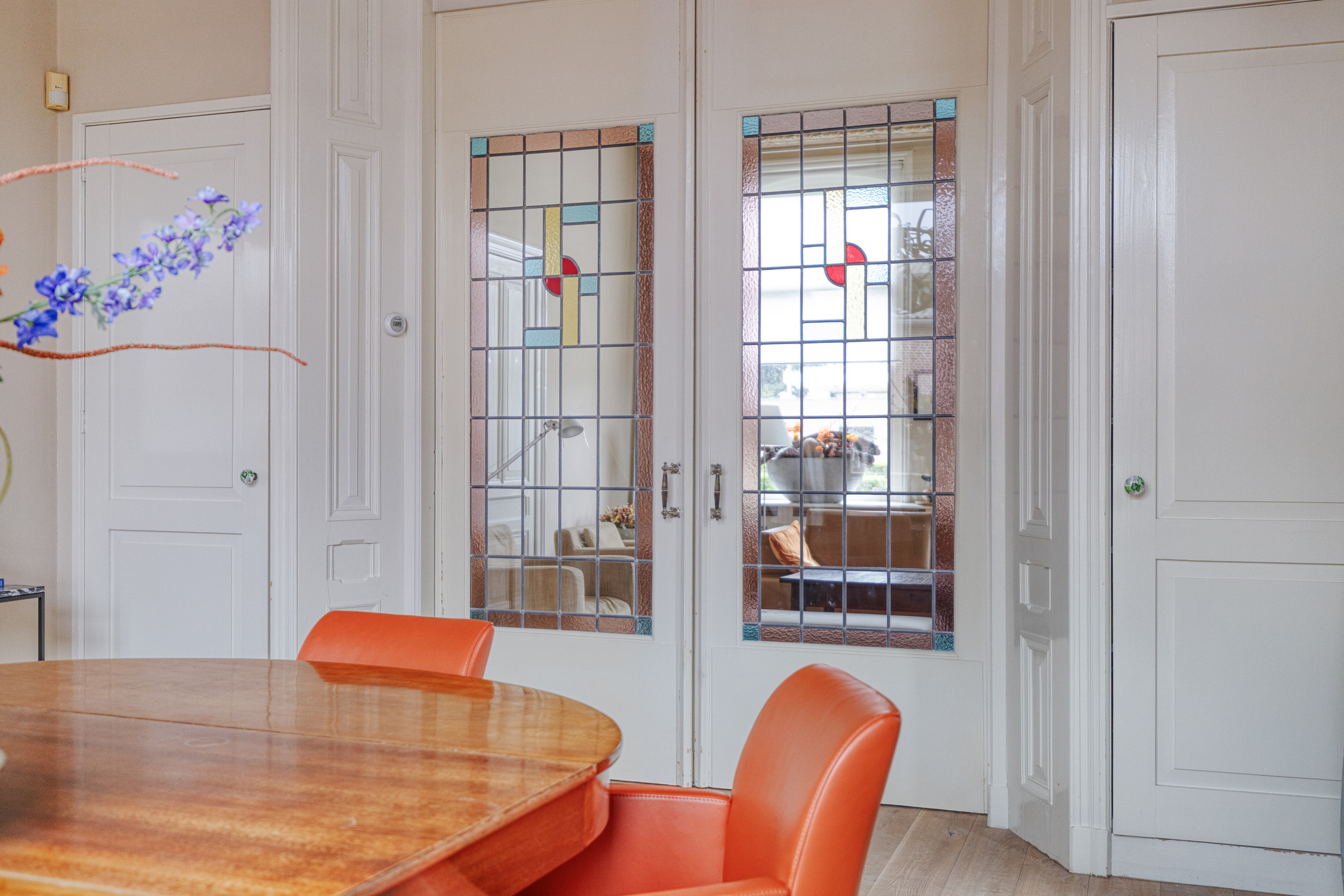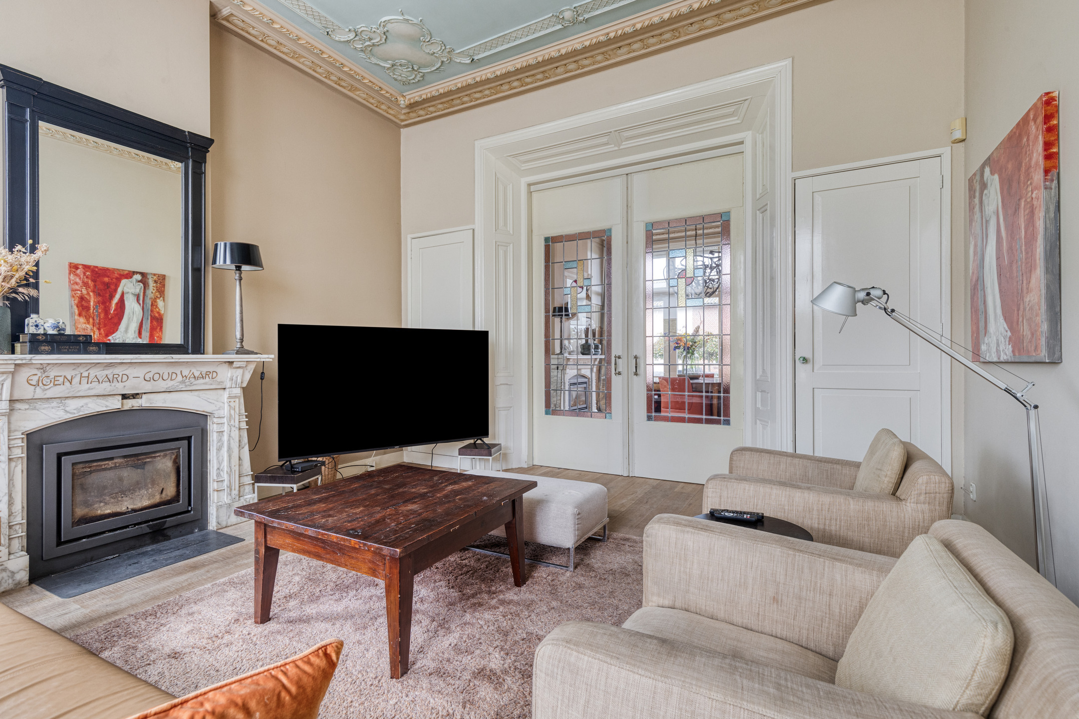 imposante woonkamer en-suite (ca. 50 m²) voorzien van glas-in-lood deuren, inbouwkasten en dubbele marmeren schouwpartijen met een inbouw gashaard en inbouw houtkachel, wandafwerking stucwerk, eiken planken vloer, prachtig authentiek plafond voorzien van sierlijsten en ornamenten;