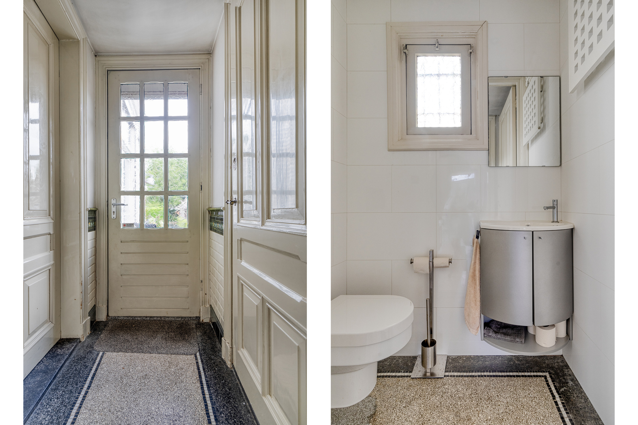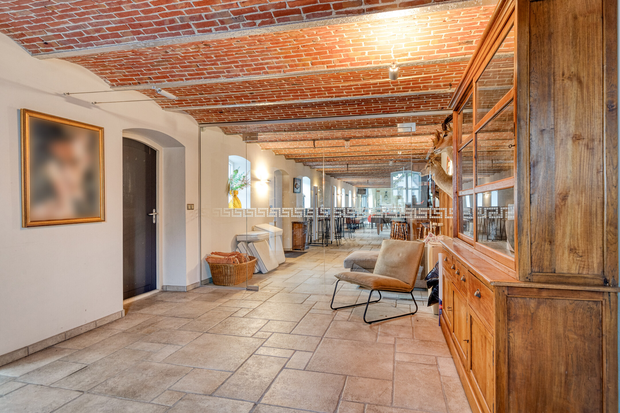 Entree, wandafwerking stucwerk, tegelvloer, gewelvenplafond;