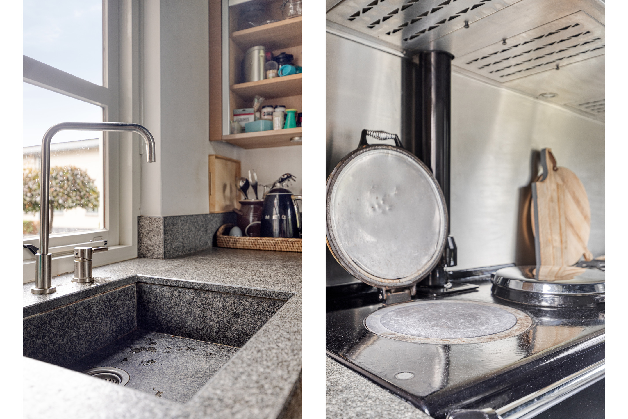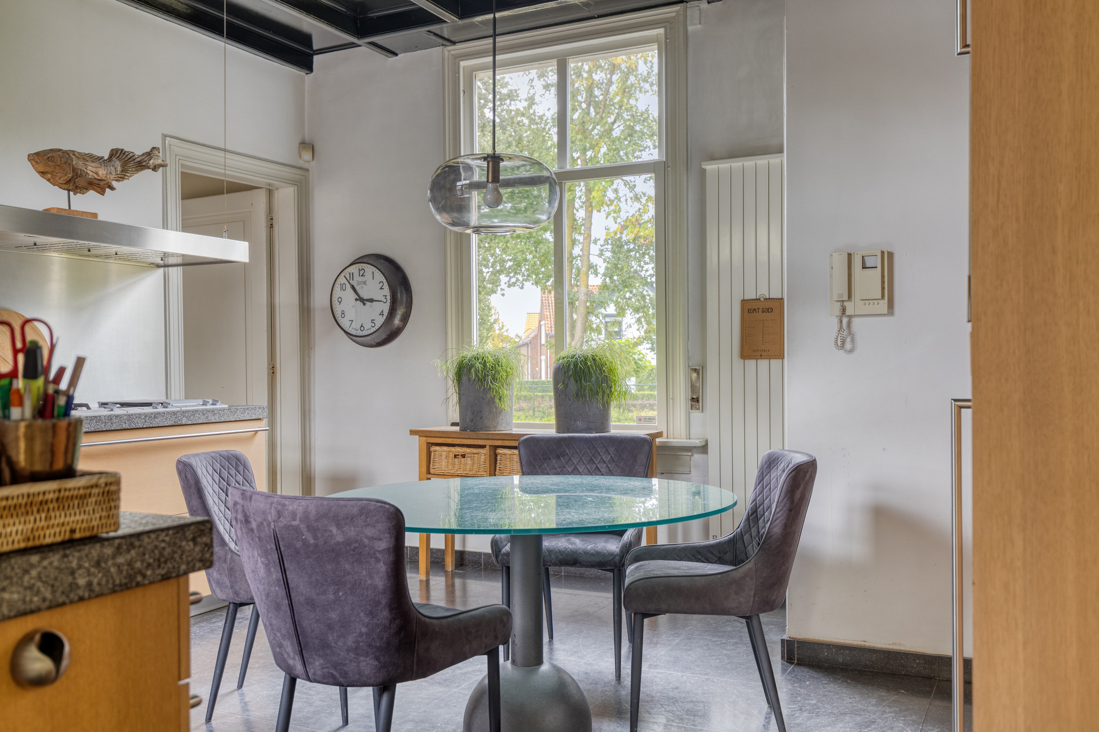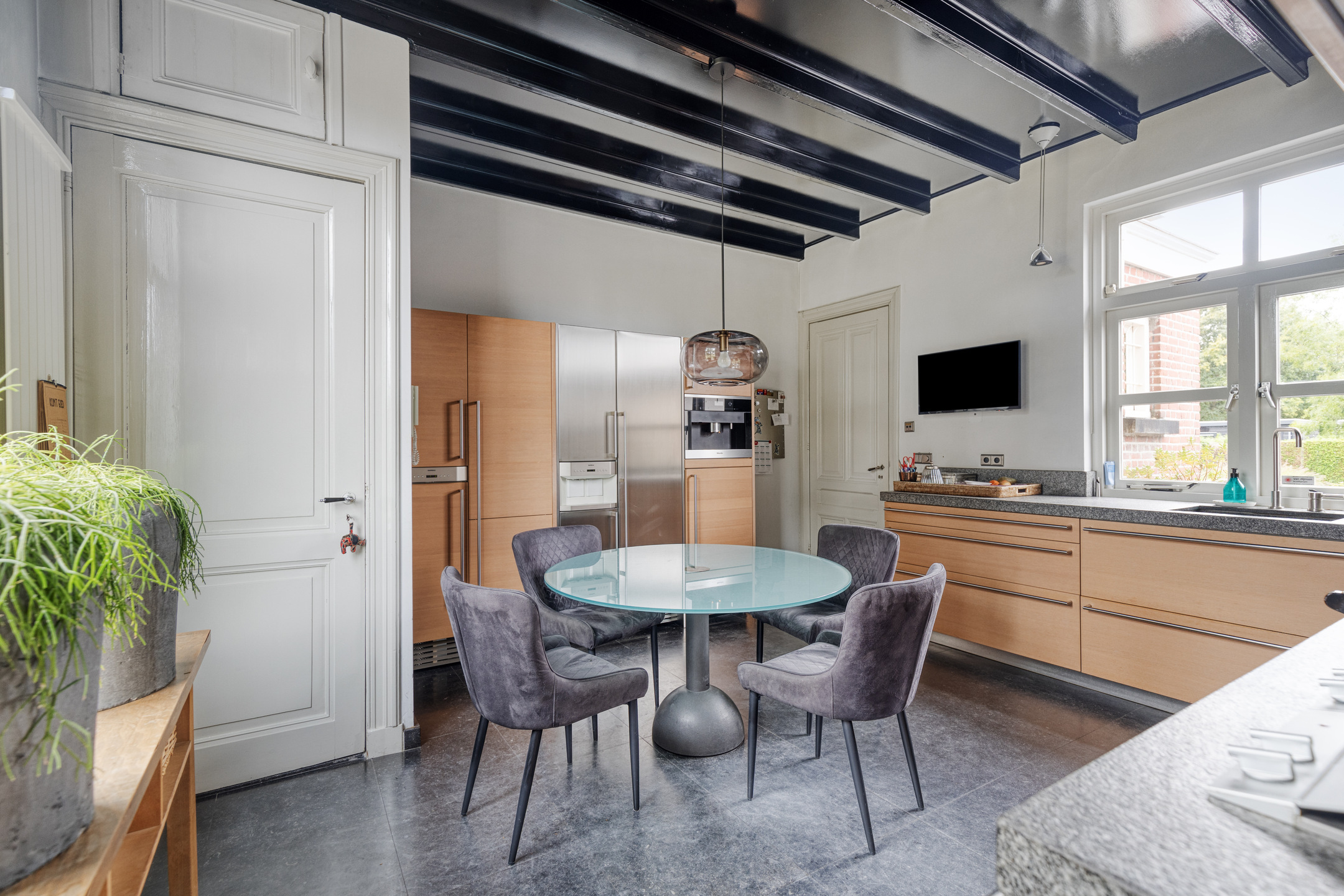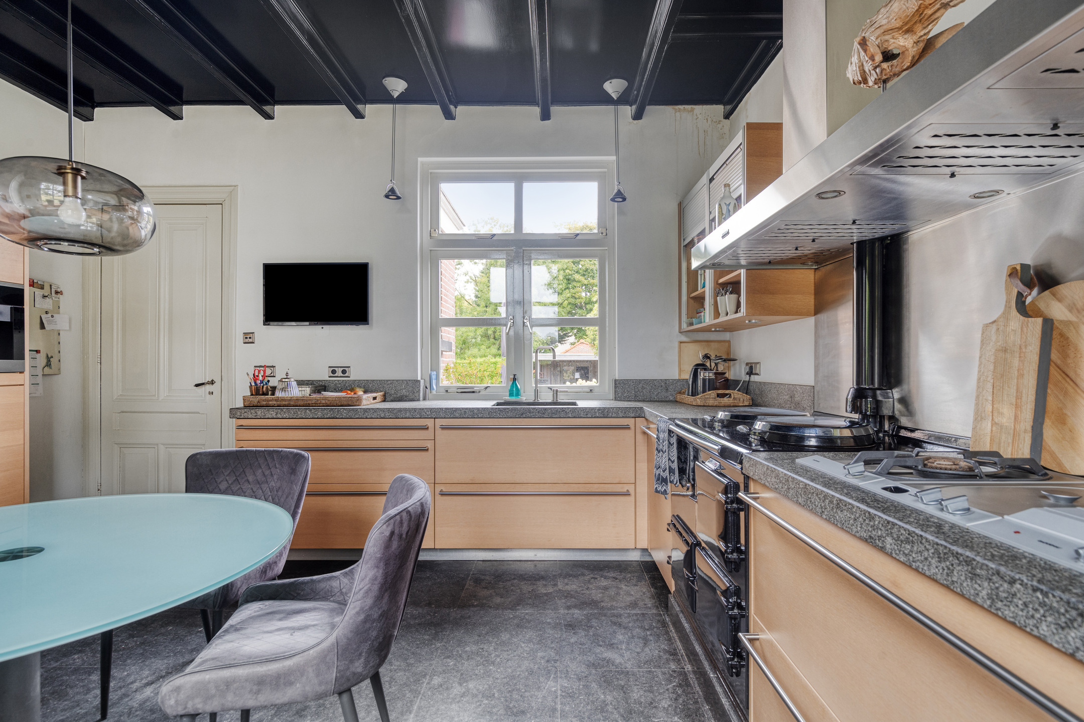 dichte woonkeuken, waarin geplaatst een moderne en uitgebreide hoekopgestelde PoggenPohl inbouwkeuken met Gaggenau apparatuur, voorzien van een granieten aanrechtblad met een spoelbak, AGA fornuis met 3 ovens, inbouw -wokbrander, -friteuse, -grilplaat, -vaatwasser, afzuigschouw alsmede een vaste kastenwand voorzien van een inbouw wijnklimaatkast met 3 zones, -koeler, -vriezer, -water/ijsdispenser en een -koffiemachine, wand-afwerking spuitwerk, hardstenen vloer, plafond afgewerkt met stucwerk;