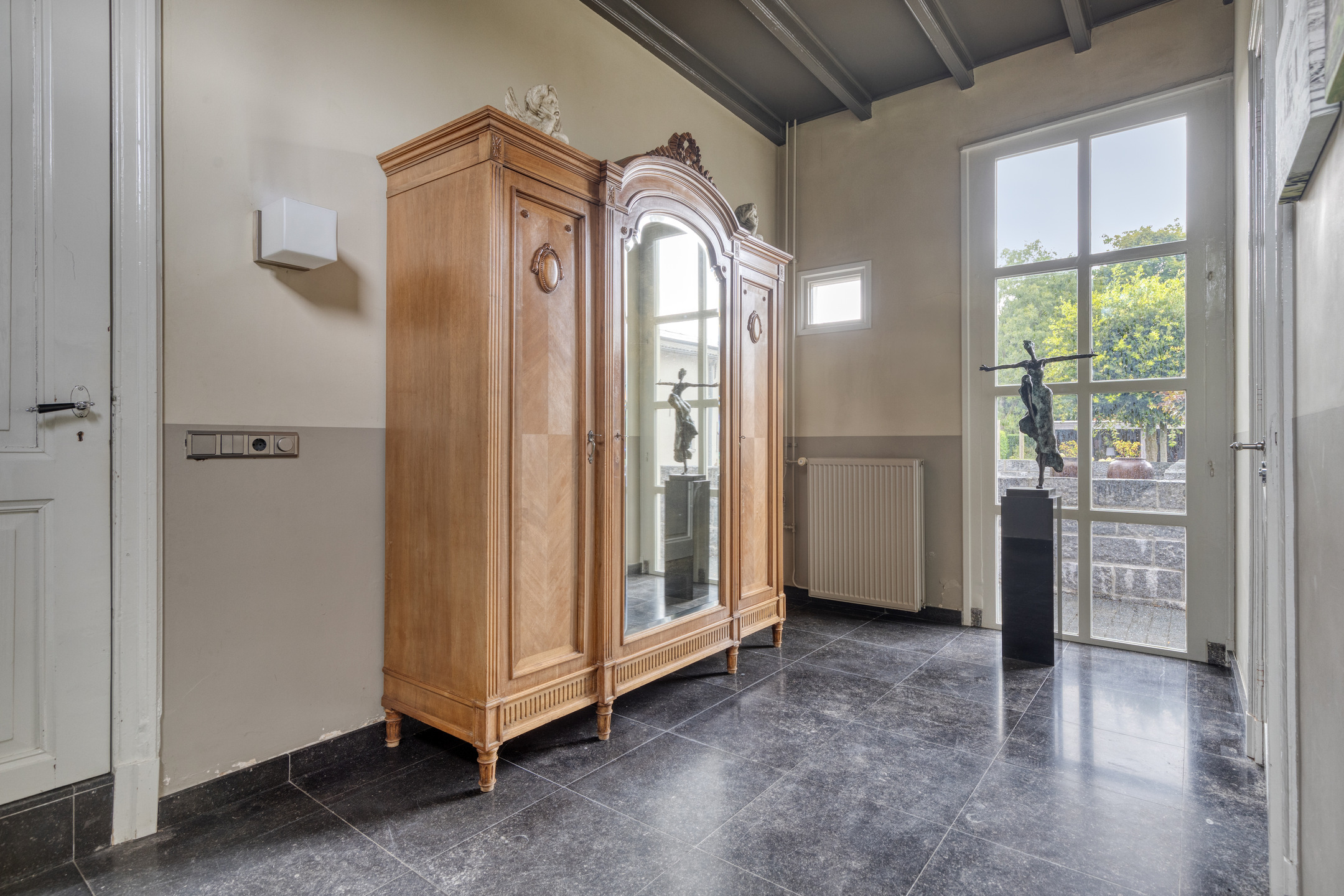 achter portaal, wandafwerking stucwerk, hardstenen vloer, balkenplafond;