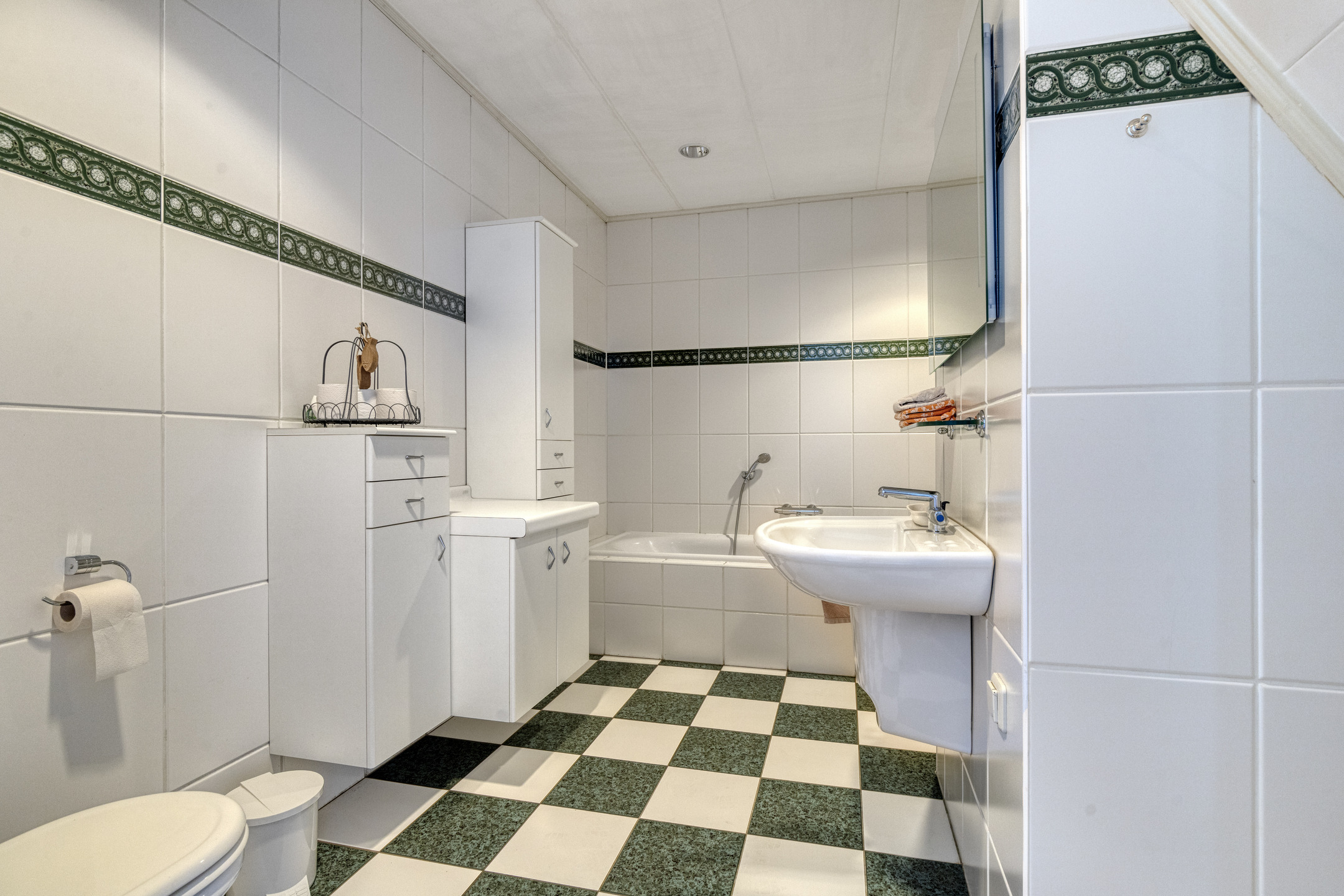 betegelde badkamer, voorzien van een wandcloset, ligbad, wastafel en douche;