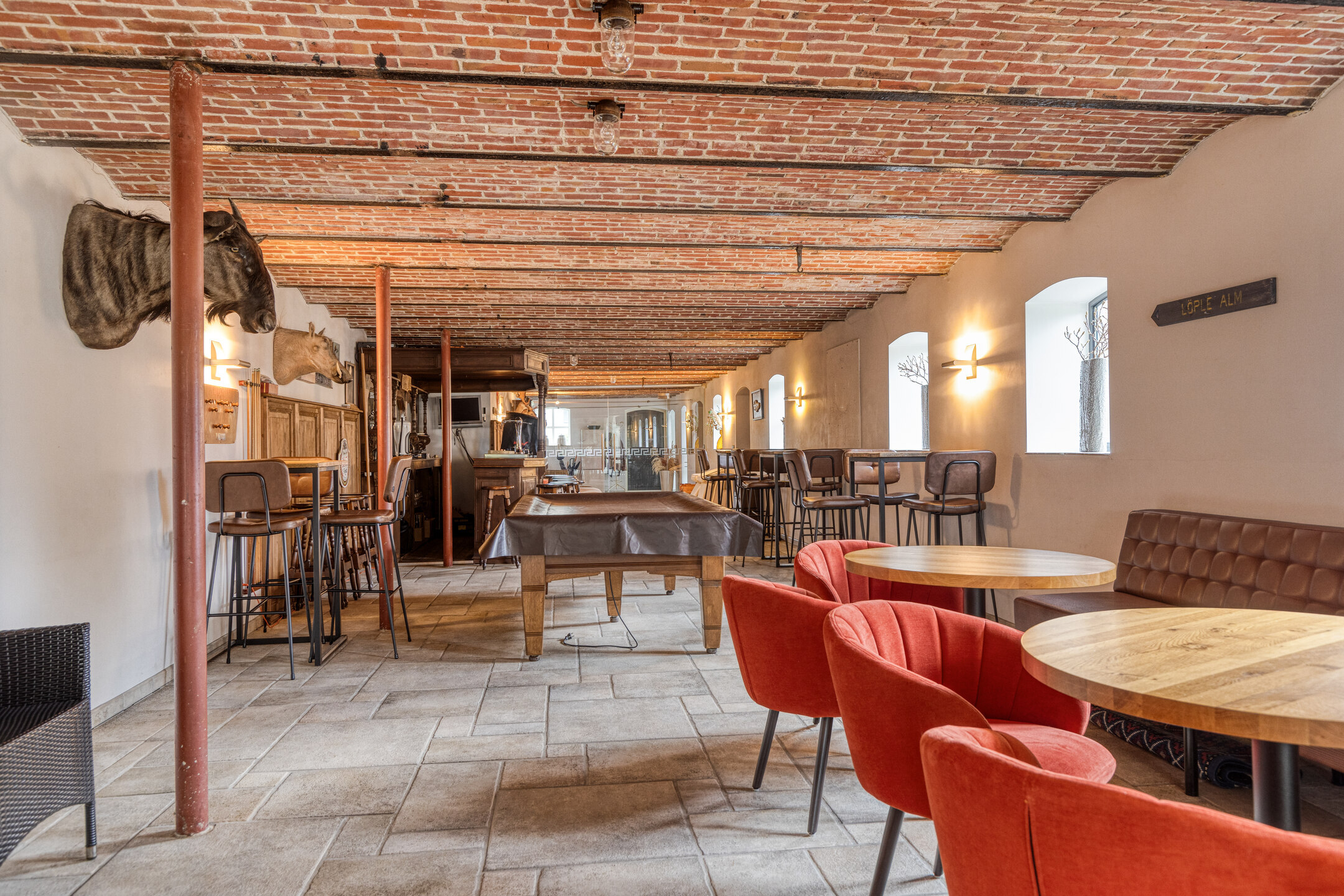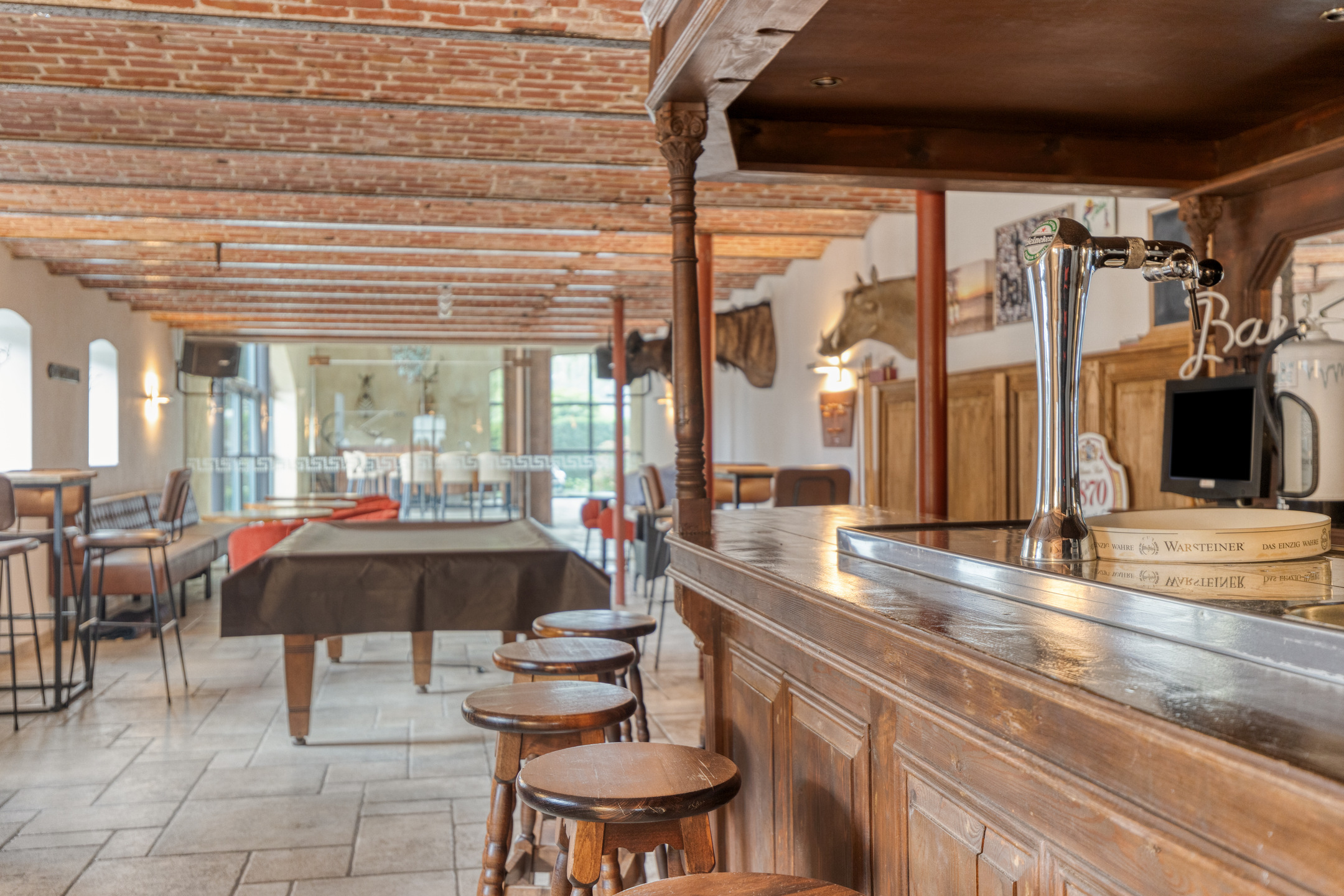 ontspanningsruimte met een complete barinrichting, wandafwerking stucwerk, tegelvloer, gewelvenplafond;