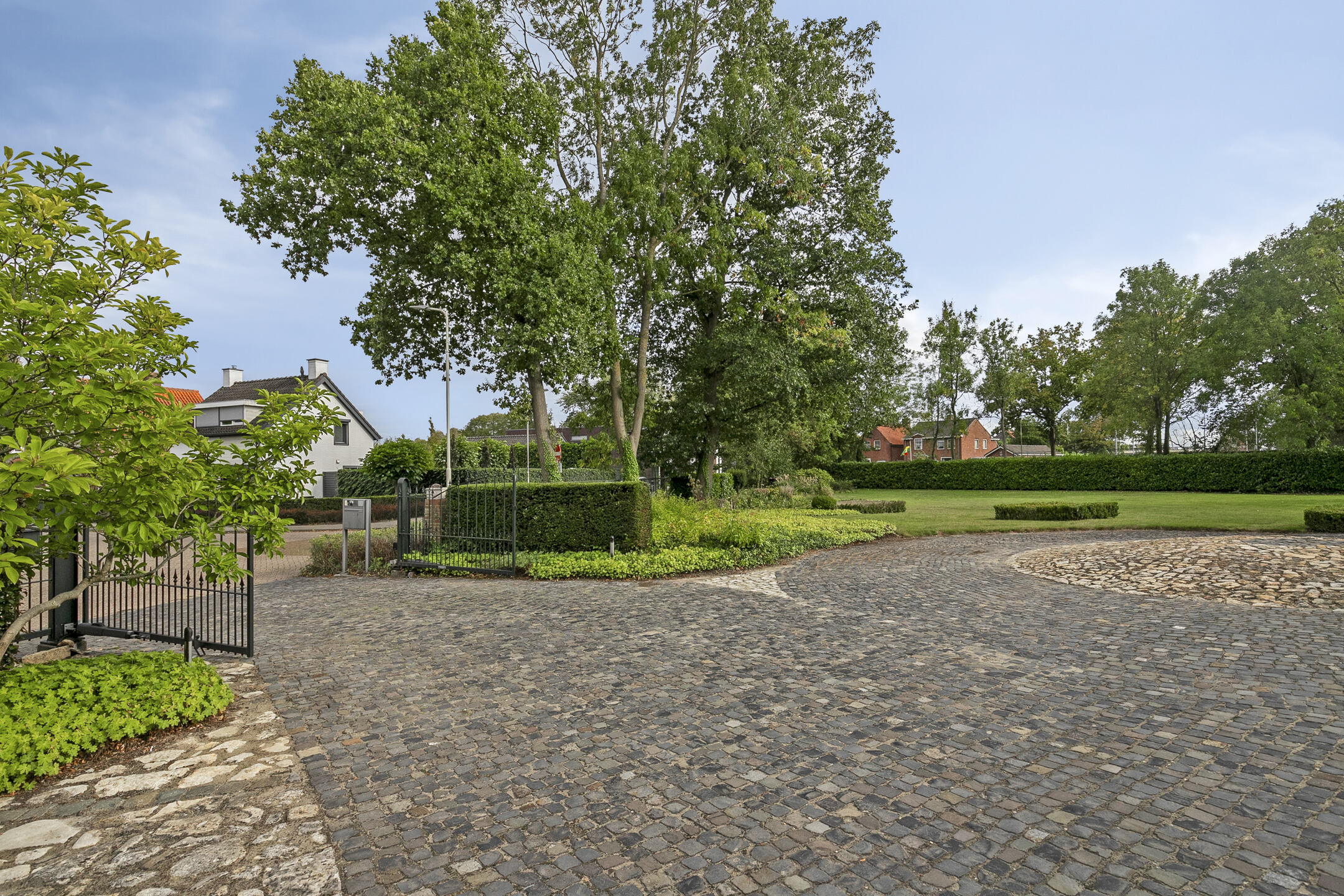 rondom afgezet met een hekwerk en voorzien van een dubbele op afstand bedienbare sierhekwerkpoort met een videofoon.