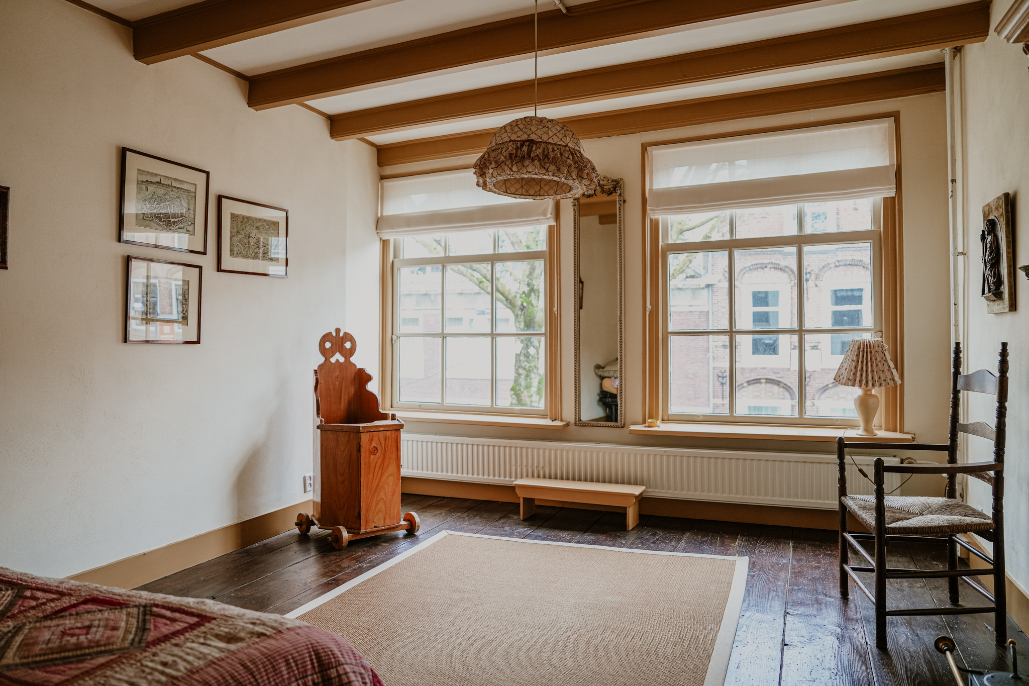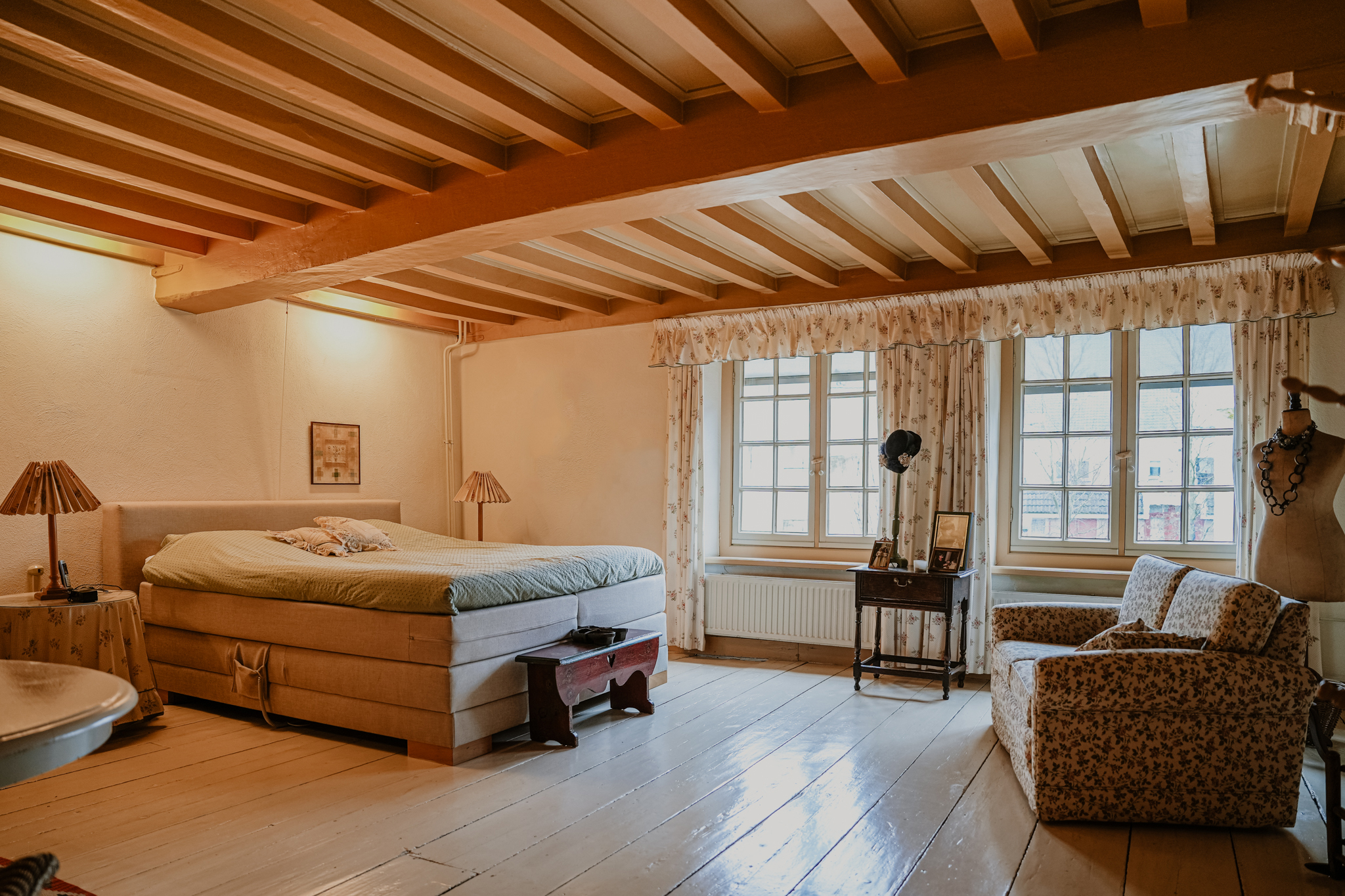 This floor radiates the atmosphere of the 16th century. At the front is a 40 m² bedroom that once served as a living room. Three large sash windows offer views of the broad Gasthuisstraat. The floor features wide wooden planks, and there are two built-in cupboards. At the rear is an even more imposing bedroom with a beam-and-rafter ceiling, white-painted wide floorboards, and a full-width fitted wardrobe with elegant panel doors. Two sash windows provide views of the garden.