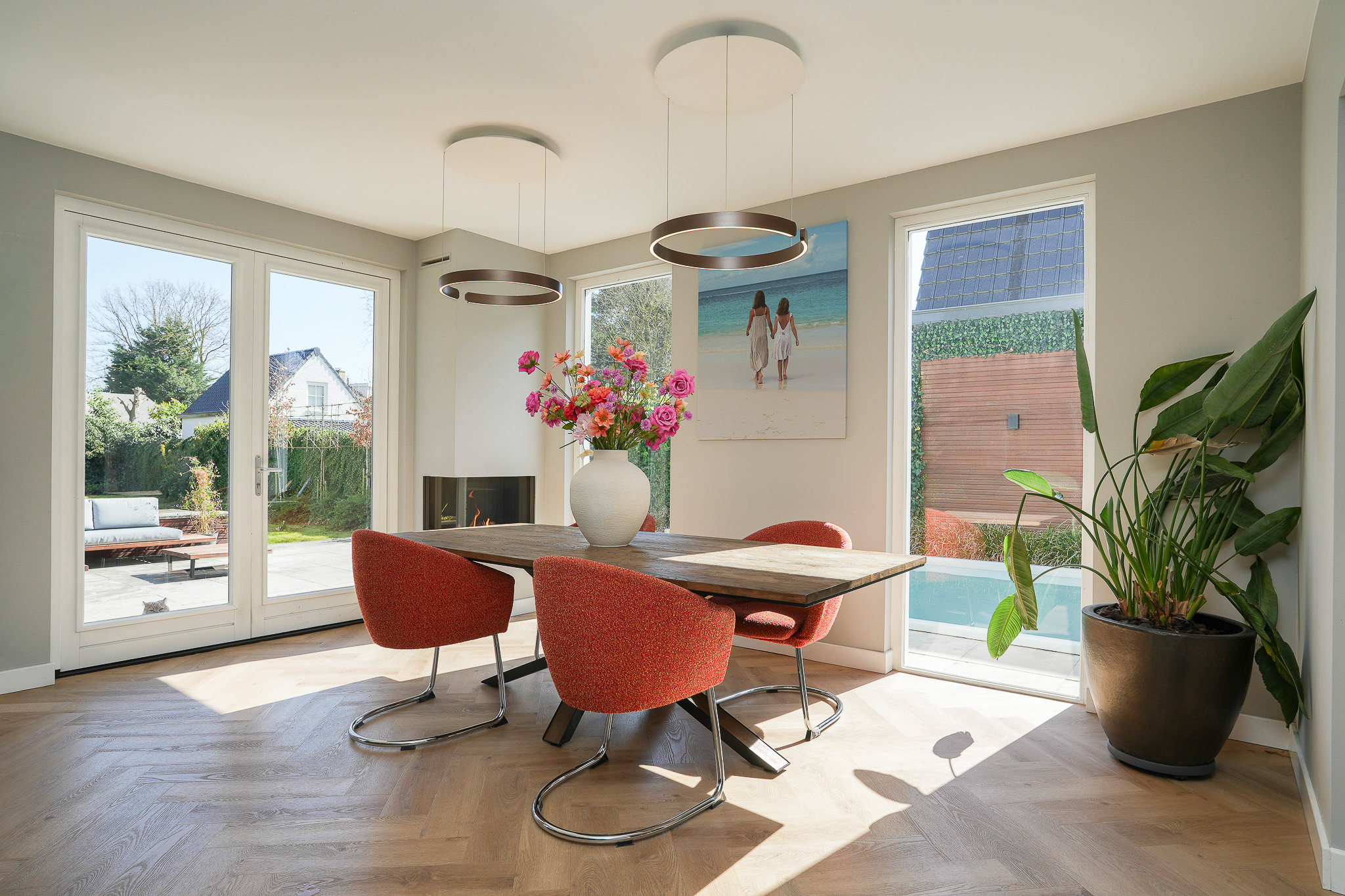 Double en suite doors with stained glass, flanked by built-in cupboards, lead to the rear room, which connects directly to the kitchen-diner. This kitchen-diner is located in the extension completed in 2021/2022 and is fully oriented towards the garden. It forms the heart of the home, with views of the garden and direct access outside.