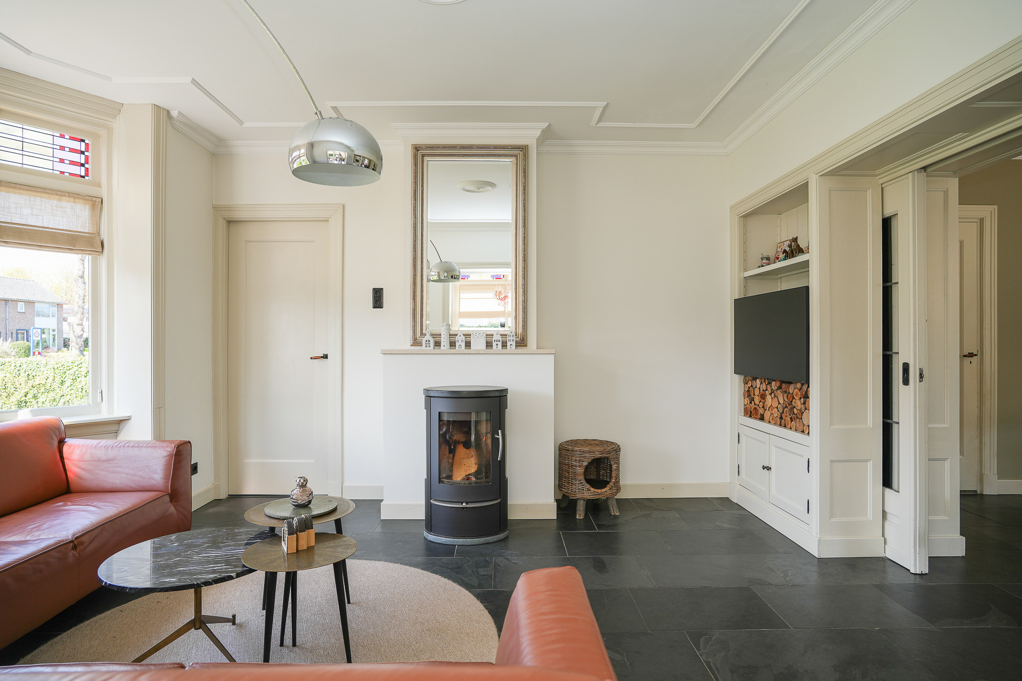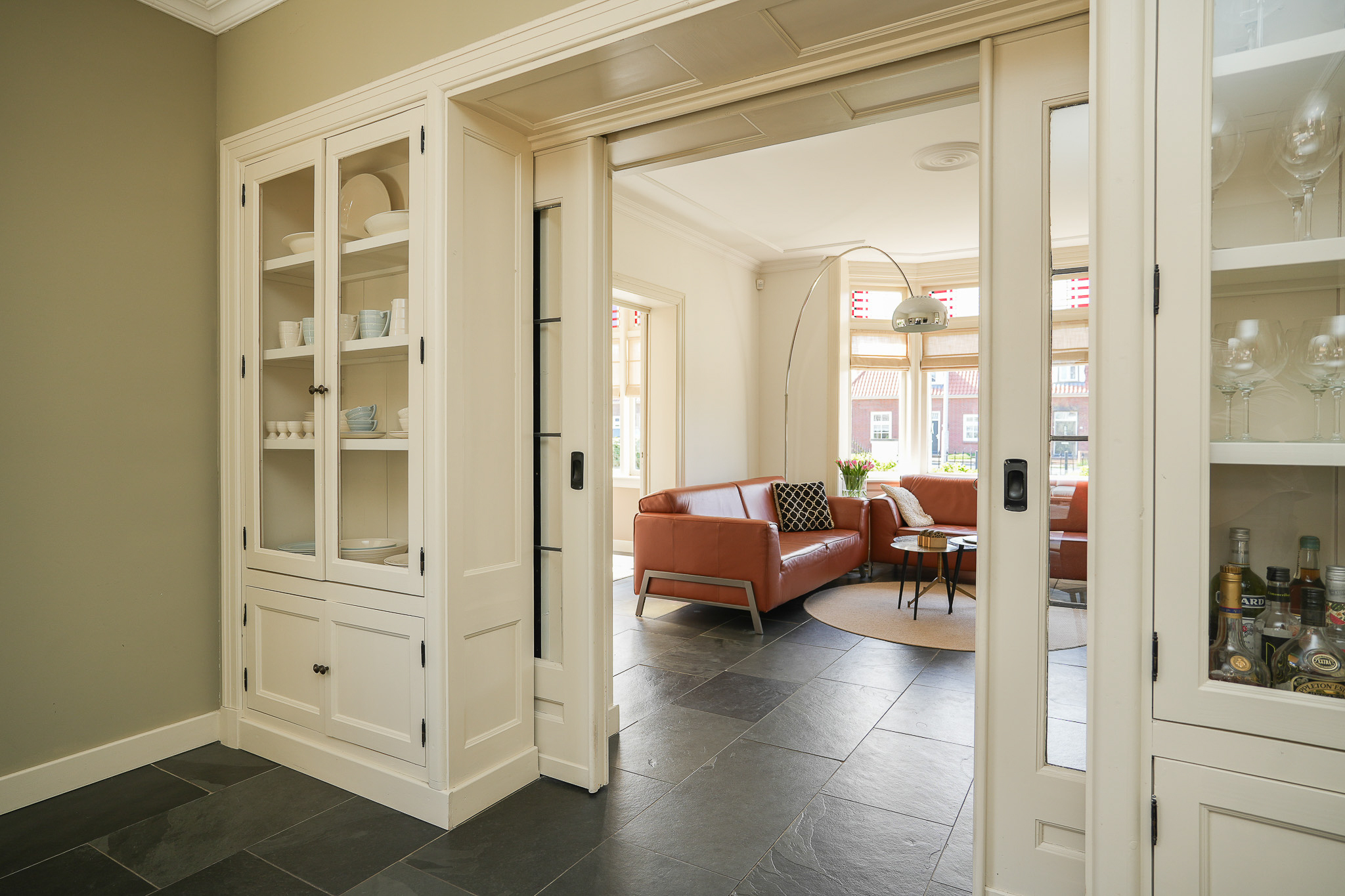 This striking white villa, named Vinkenburg, was built in 1929 to a design by municipal architect De Groot. Characteristic features from the period have been carefully preserved, including the wide overhangs, bay window, conservatory, stained-glass transoms and panelled doors with traditional ironmongery.