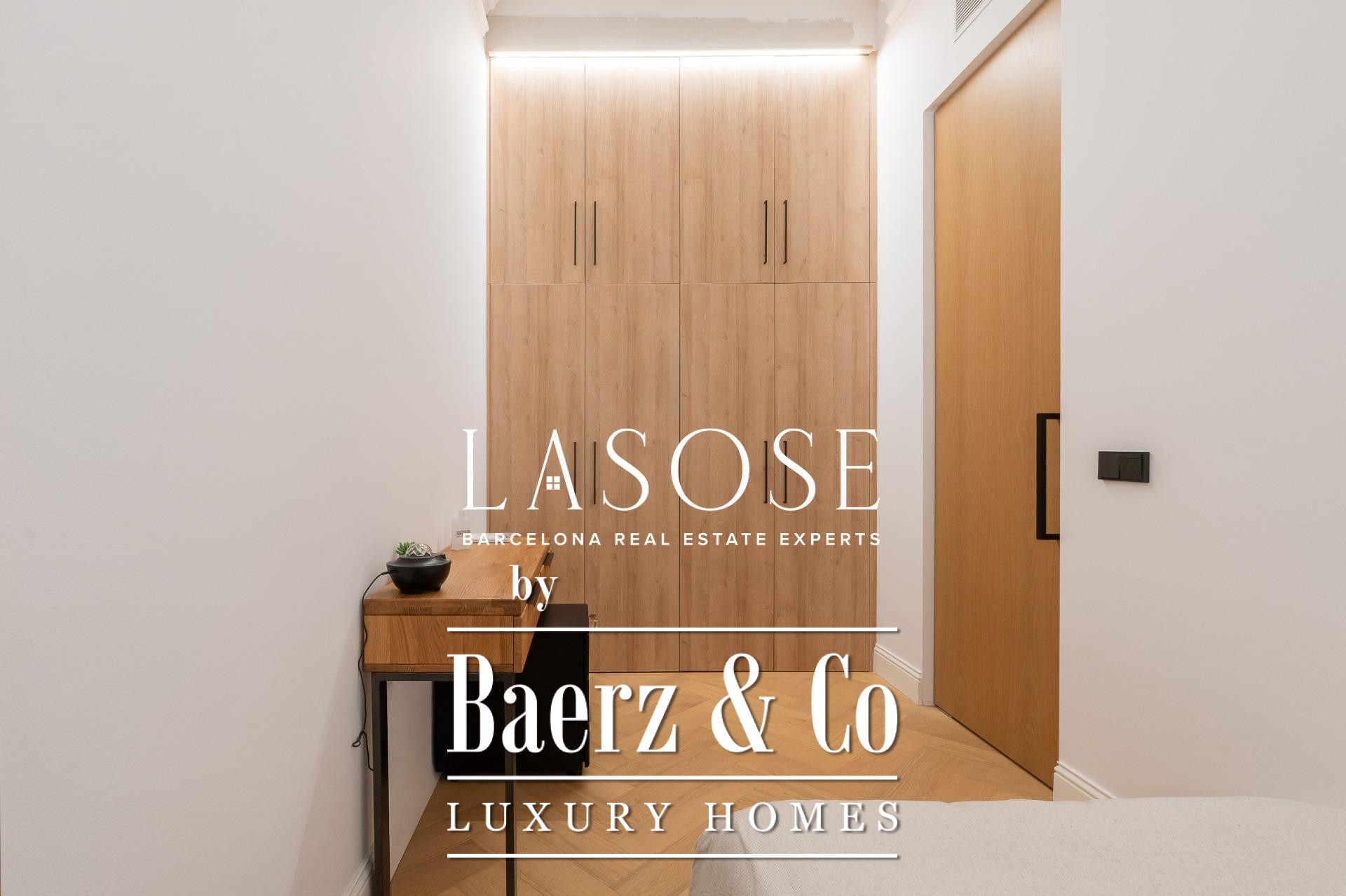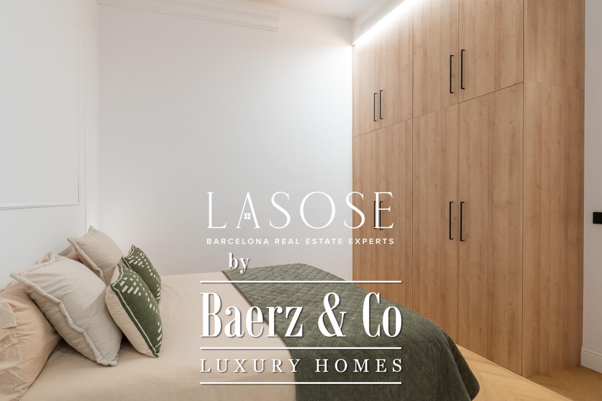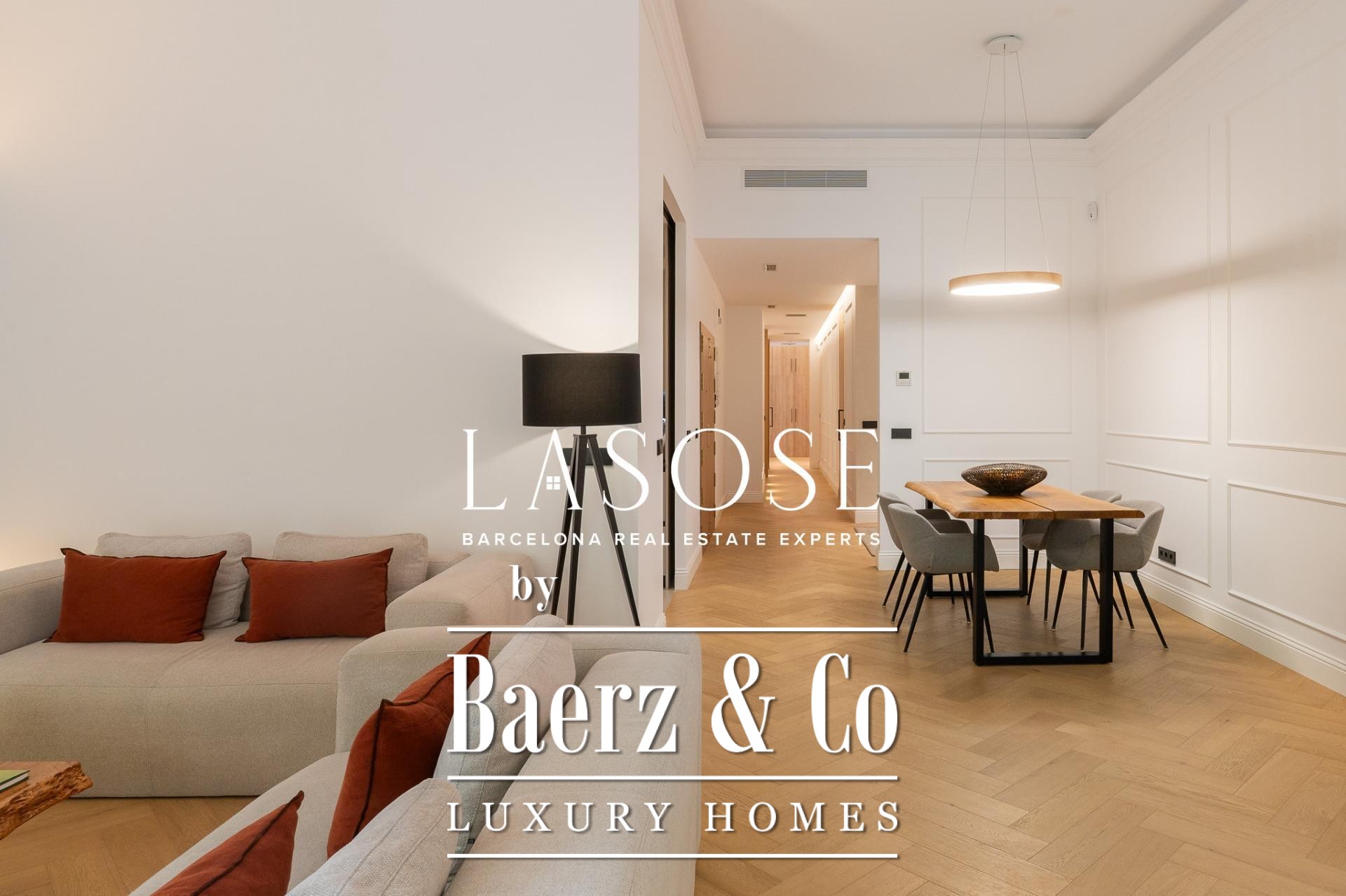 La distribución del apartamento destaca por un amplio salón comedor independiente con techos altos, tres dormitorios—uno de ellos una elegante suite, uno doble y uno sencillo—y dos baños completos. La cocina, totalmente equipada, presenta un diseño contemporáneo con materiales de primera calidad y combina a la perfección modernidad y tradición. Un balcón de unos 4,61 metros cuadrados proporciona luz, vistas a la ciudad y una conexión directa con el ambiente de la calle Carrer de Casp.