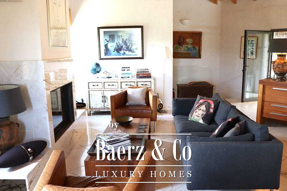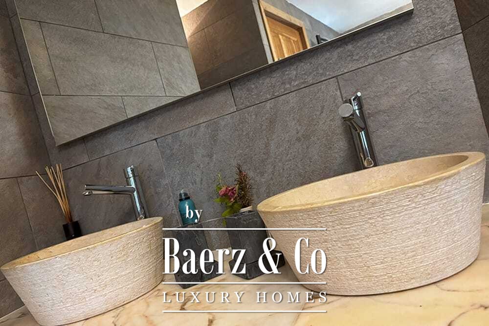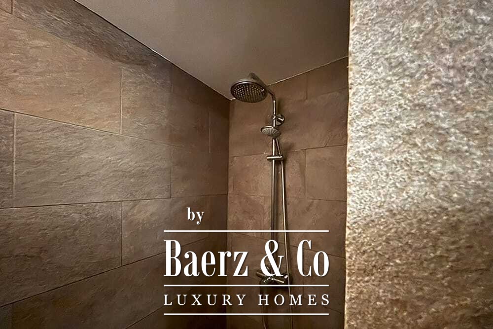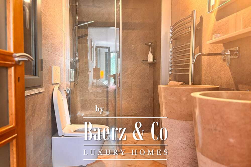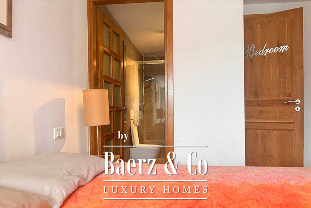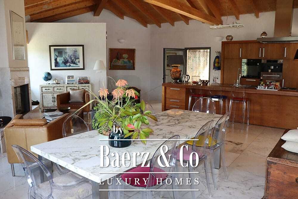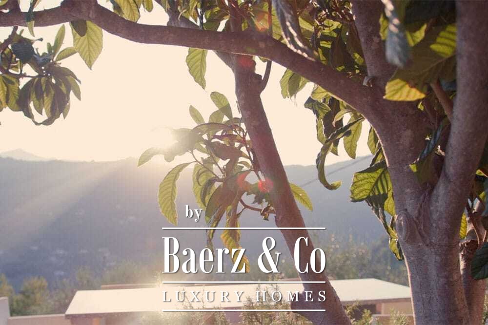 Distribuida en dos plantas, la villa cuenta con cuatro dormitorios y cuatro baños. Tres de los dormitorios en la planta baja, cada uno con puertas francesas, se abren a una terraza inferior con vistas montañosas. La suite principal dispone de un amplio baño, ducha separada, dos lavabos de mármol y accesorios de diseño, creando un ambiente de refugio. El dormitorio tipo estudio, con entrada independiente, aporta flexibilidad tanto para invitados como para convertirlo en zona de trabajo. En la planta superior, el salón con vigas de madera y chimenea se integra con una cocina de nogal y acero inoxidable equipada con electrodomésticos Miele de alta gama. Grandes puertas acristaladas conducen a una sala con segunda chimenea y acceso a terrazas provistas de mesas de granito y sillas Philippe Starck.