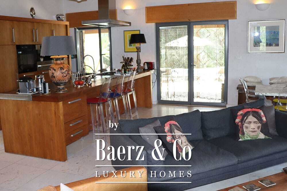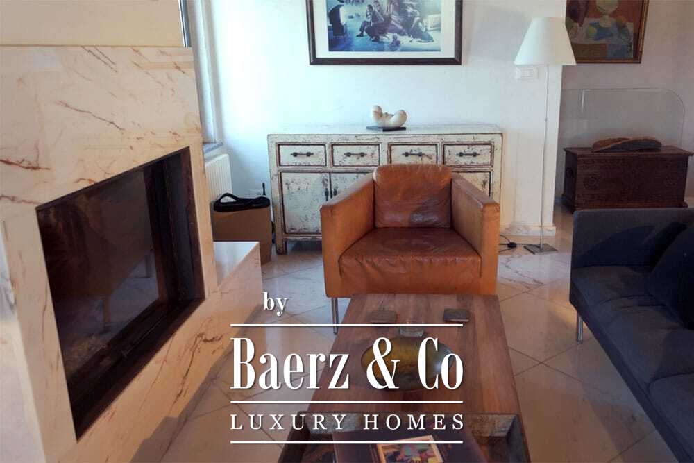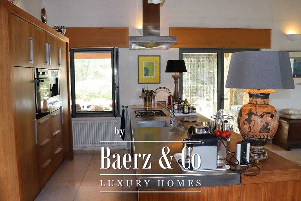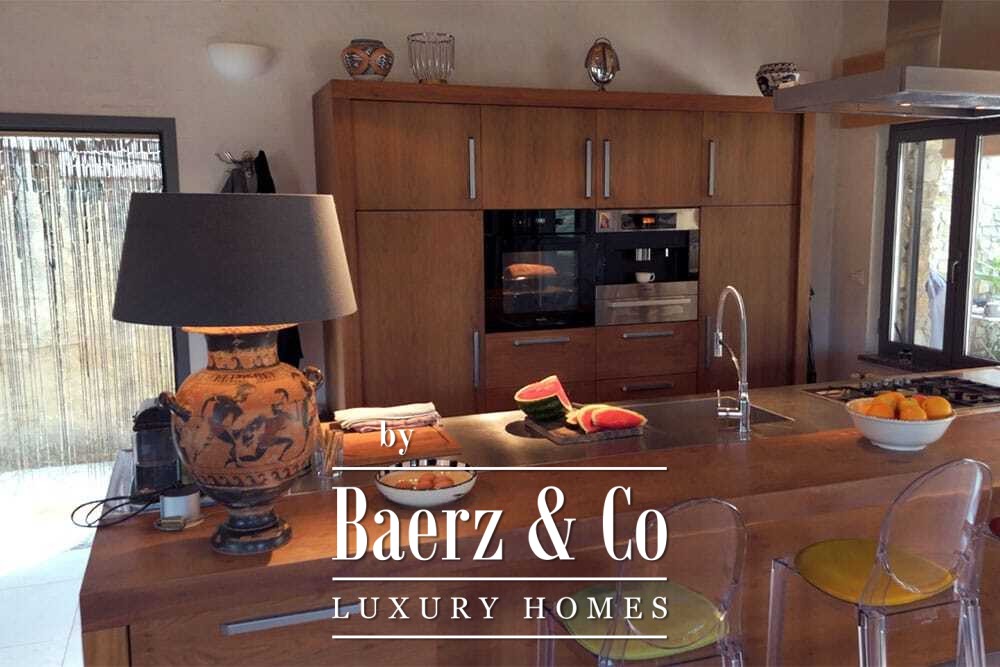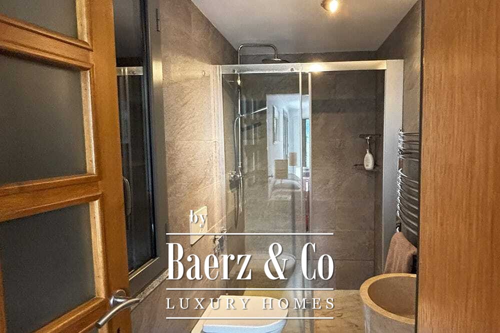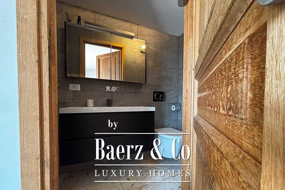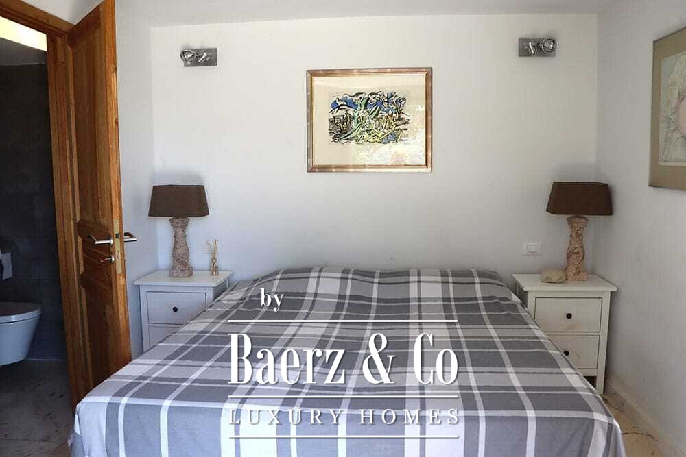 Distribuida en dos plantas, la villa cuenta con cuatro dormitorios y cuatro baños. Tres de los dormitorios en la planta baja, cada uno con puertas francesas, se abren a una terraza inferior con vistas montañosas. La suite principal dispone de un amplio baño, ducha separada, dos lavabos de mármol y accesorios de diseño, creando un ambiente de refugio. El dormitorio tipo estudio, con entrada independiente, aporta flexibilidad tanto para invitados como para convertirlo en zona de trabajo. En la planta superior, el salón con vigas de madera y chimenea se integra con una cocina de nogal y acero inoxidable equipada con electrodomésticos Miele de alta gama. Grandes puertas acristaladas conducen a una sala con segunda chimenea y acceso a terrazas provistas de mesas de granito y sillas Philippe Starck.