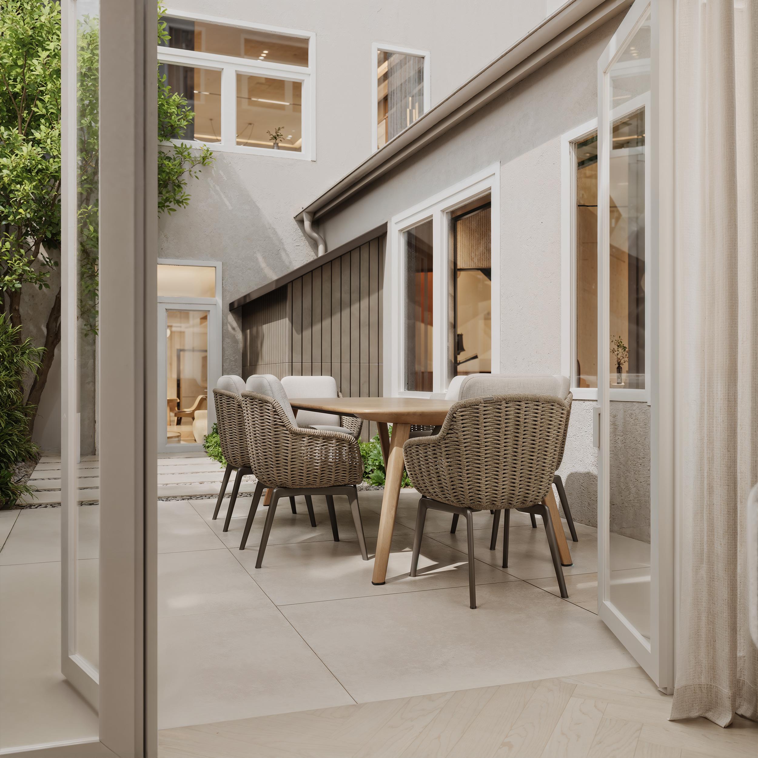 Dès l'entrée au rez-de-chaussée, un vaste séjour s'ouvre sur l'espace salle à manger, dominé par une cuisine ouverte moderne avec îlot central et électroménagers haut de gamme intégrés. De grandes portes-fenêtres donnent accès à une cour intérieure abritée, véritable havre de paix contrastant avec le rythme d'Amsterdam. L'espace de vie à l'arrière, également accessible par le jardin, dispose d'une seconde cuisine, idéale pour une suite d'invités, un bureau ou un atelier.