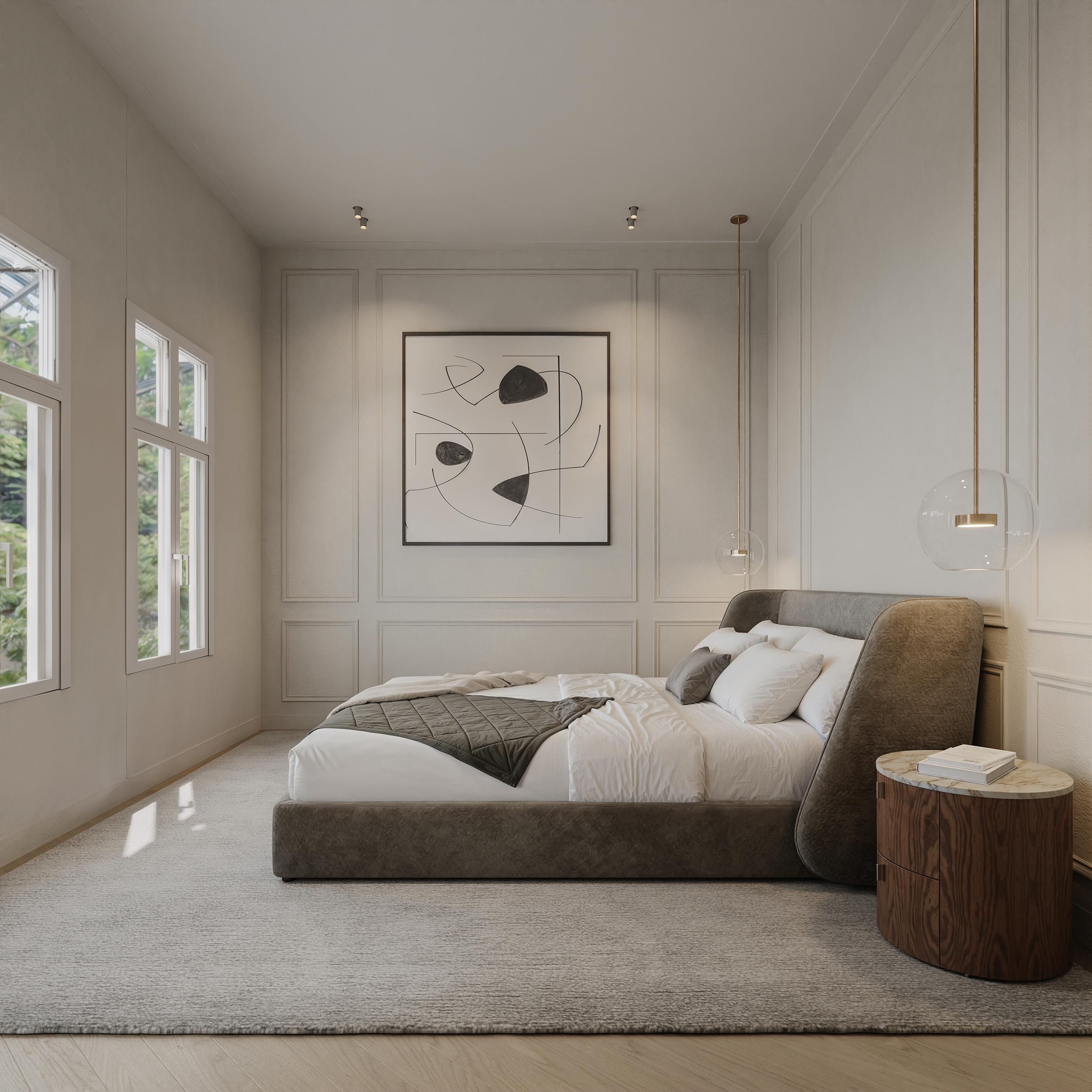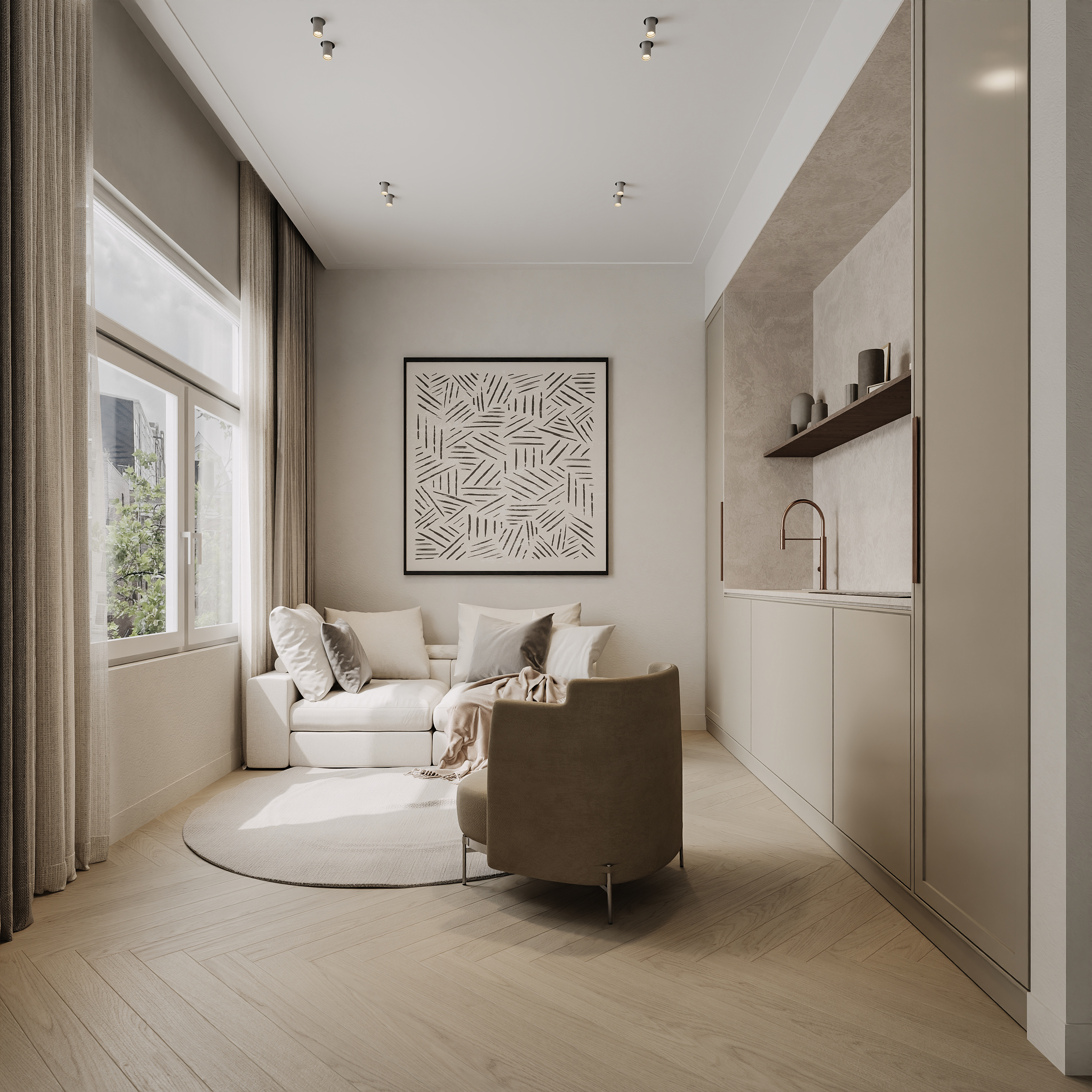 L’entrée s’ouvre sur un espace séjour et salle à manger à l’esprit loft, structuré autour d’une cuisine ouverte avec îlot central et équipements haut de gamme intégrés. De grandes portes-fenêtres dévoilent un jardin intérieur à l’abri des regards, véritable havre de tranquillité au cœur du tissu urbain. Une pièce séparée, surplombant ce jardin et dotée d’une seconde cuisine, propose un espace polyvalent adapté au travail, à la réception d’invités ou à la créativité.